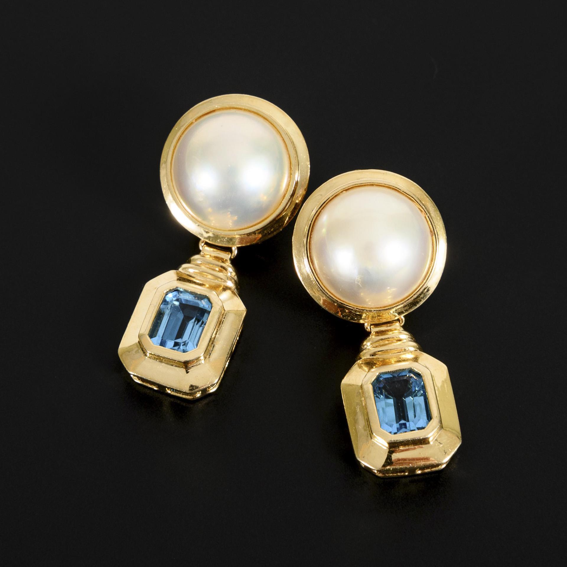 Modern pair of earrings in a clear design, each set with a Mabé cultured pearl and a blue colored stone in a bezel setting. The clasp with clip-in mechanism, the pearls with natural growth features. Slight signs of wear on the gold.