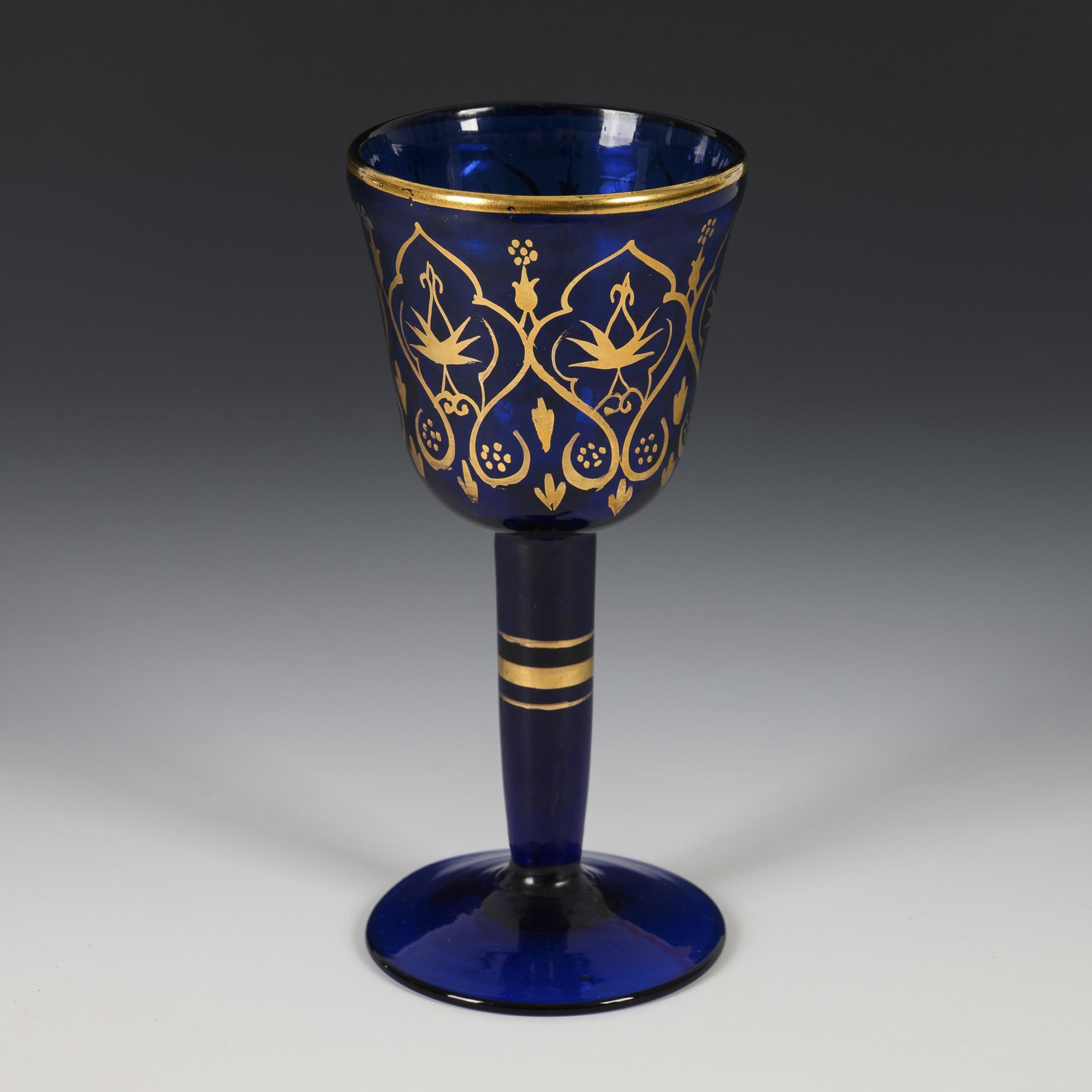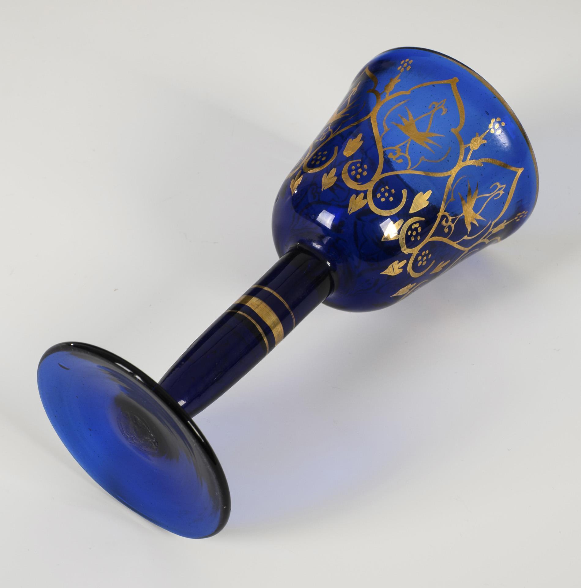 Conical bowl, cylindrical shaft, round base; pontil mark. Gold ornamental painting on the dome. Rubbed gold rim.