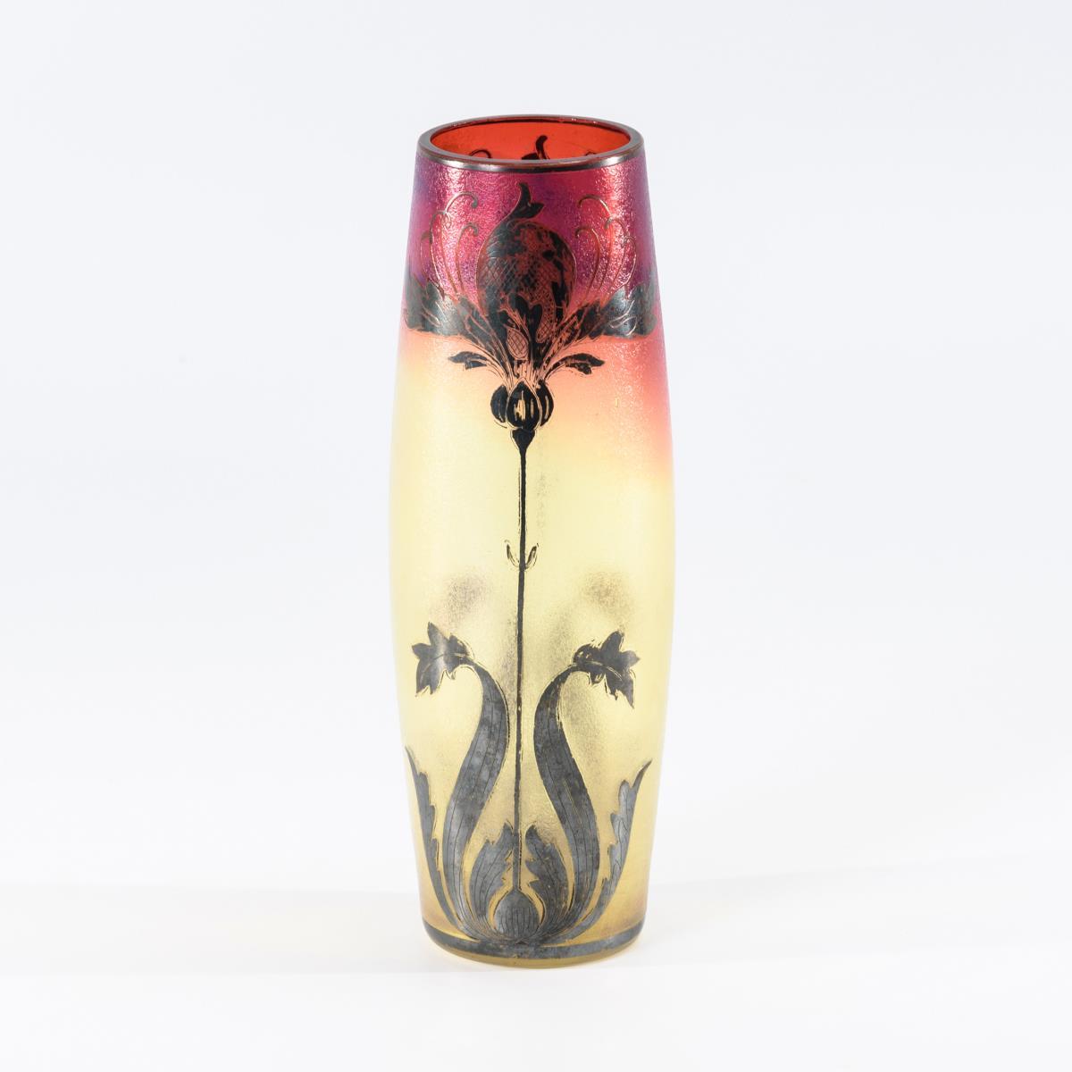Farbloses, formgeblasenes Glas mit gelbem Unterfang und vom Rand her rot verlaufendem Überfang. Eisglasartig strukturierter Grund, geätztes und graviertes Irisdekor mit galvanischer Silberauflage, irisiert.