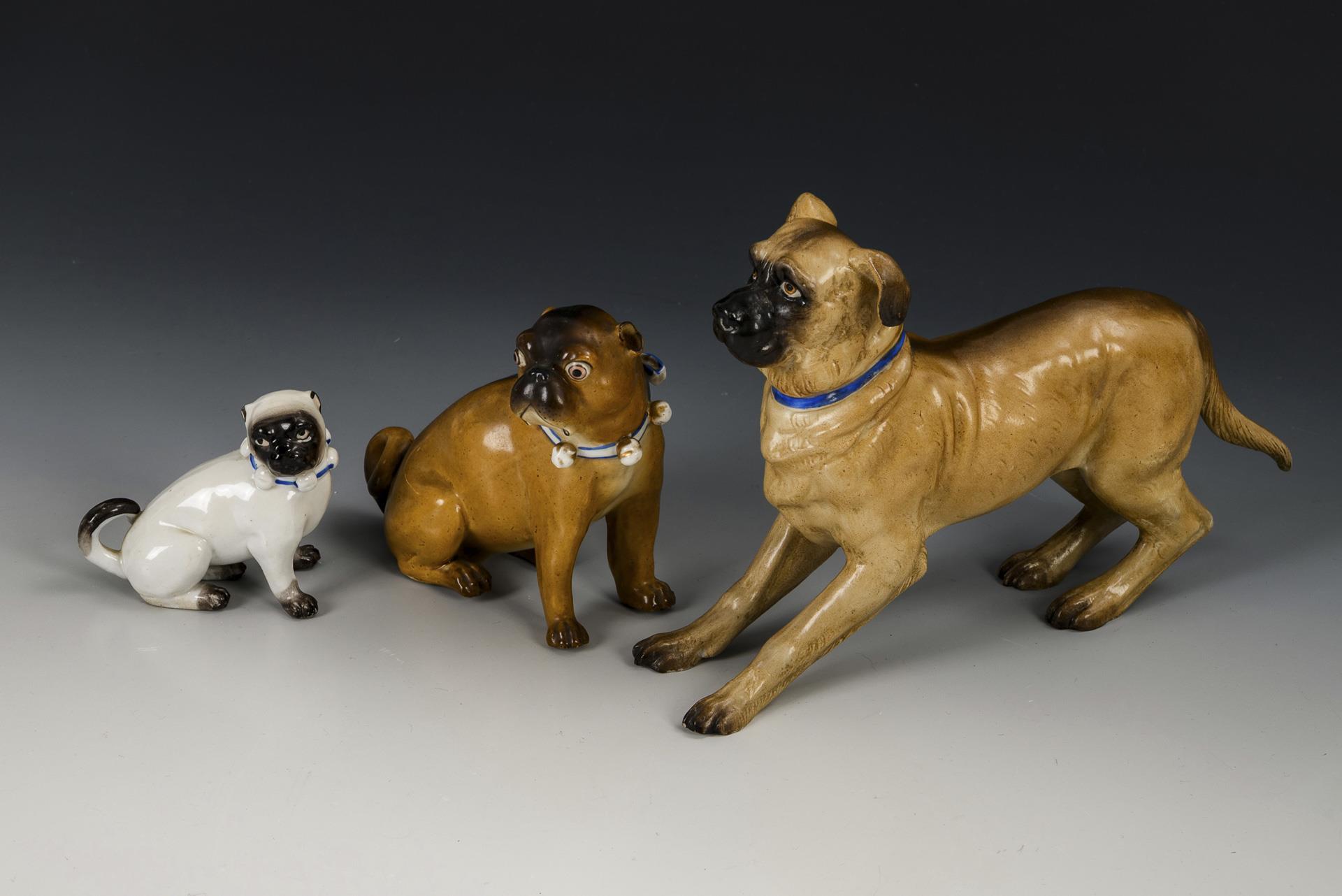 1x model no. 2980: standing dog with blue collar (H 14 cm). / 1x model no. 1560: sitting brown pug with bell collar (H 10.5 cm). / 1x sitting white pug with bell collar (H 6.5 cm). Minimal chip to the left front paw and the right hind paw of the dog, gold rubbed, minimal chip to the right front paw of the white pug.