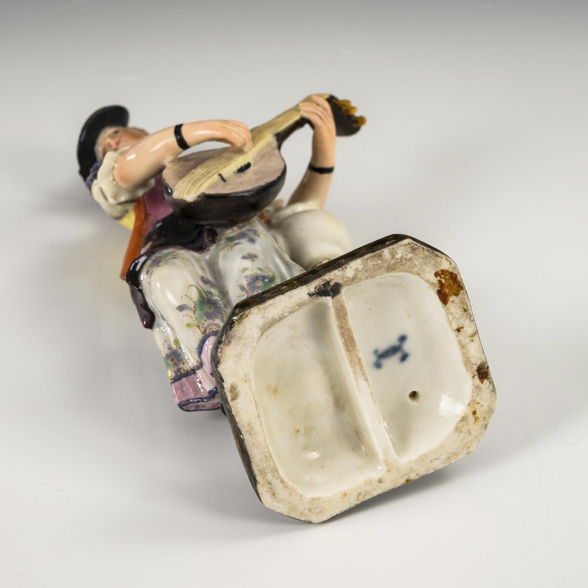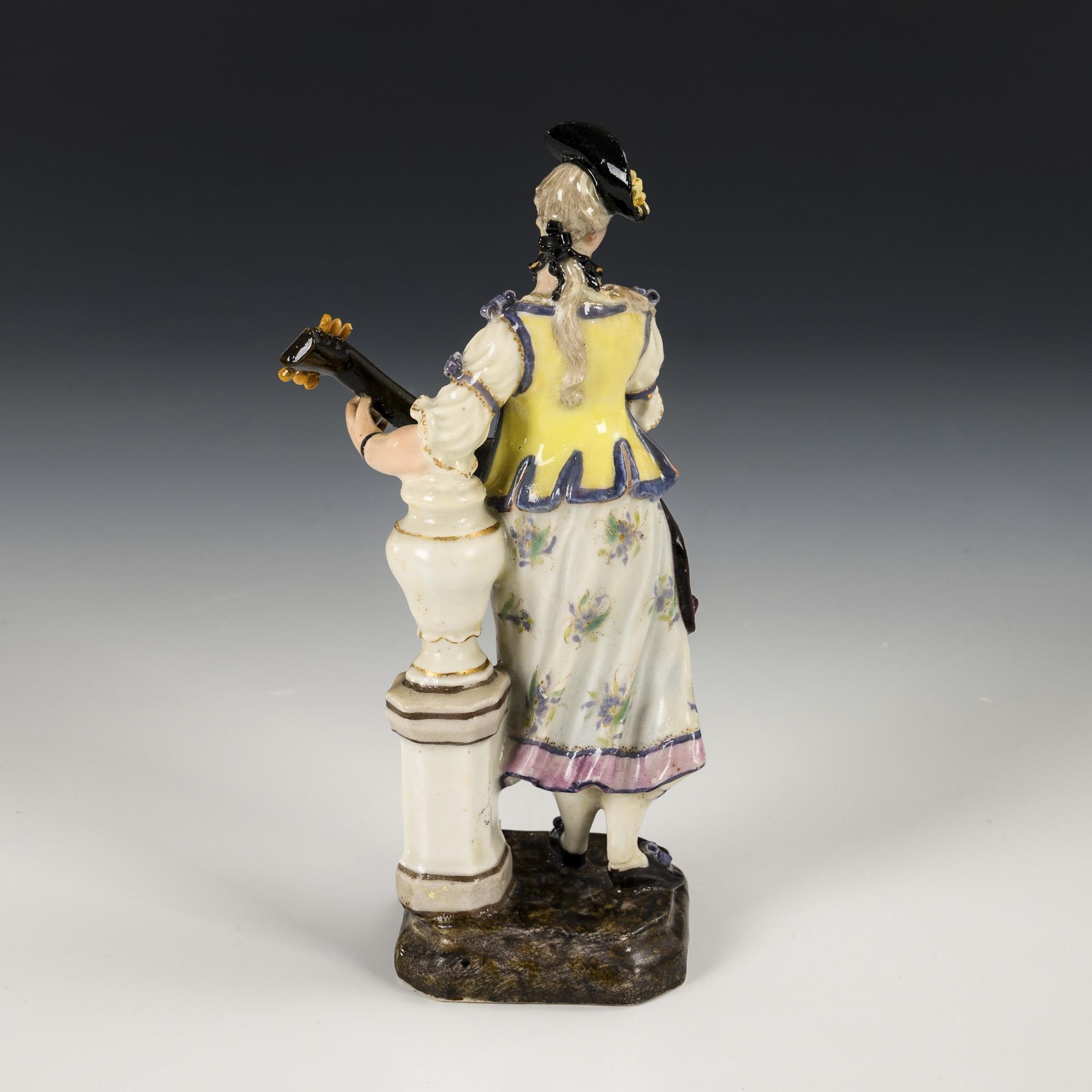 Lady playing a lute standing on a pedestal with vase. Lady and lute restored.