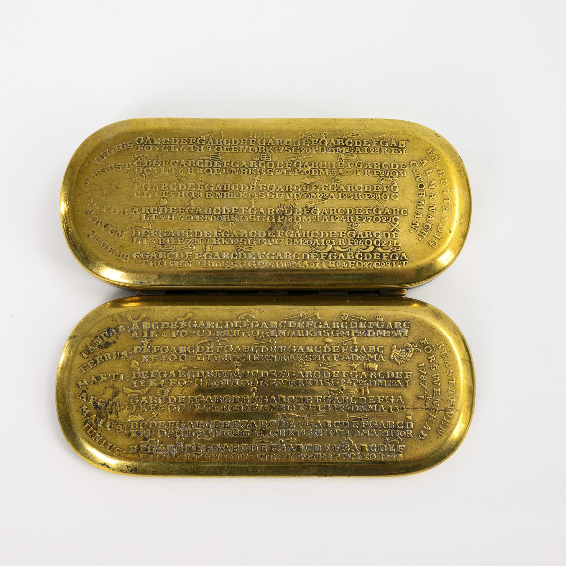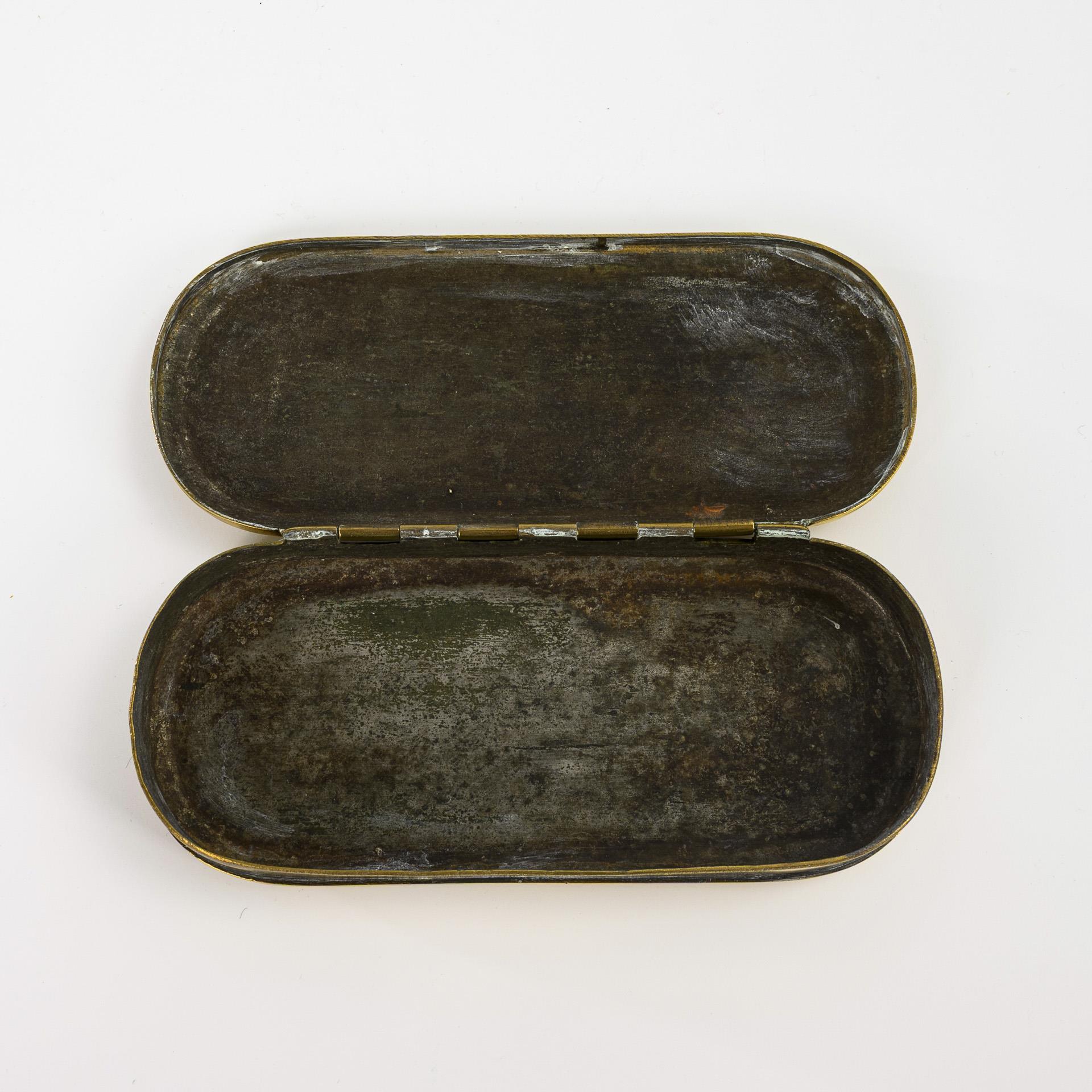 Brass, base and lid embossed. 2 x 13 x 6 cm. 0.2 kg.