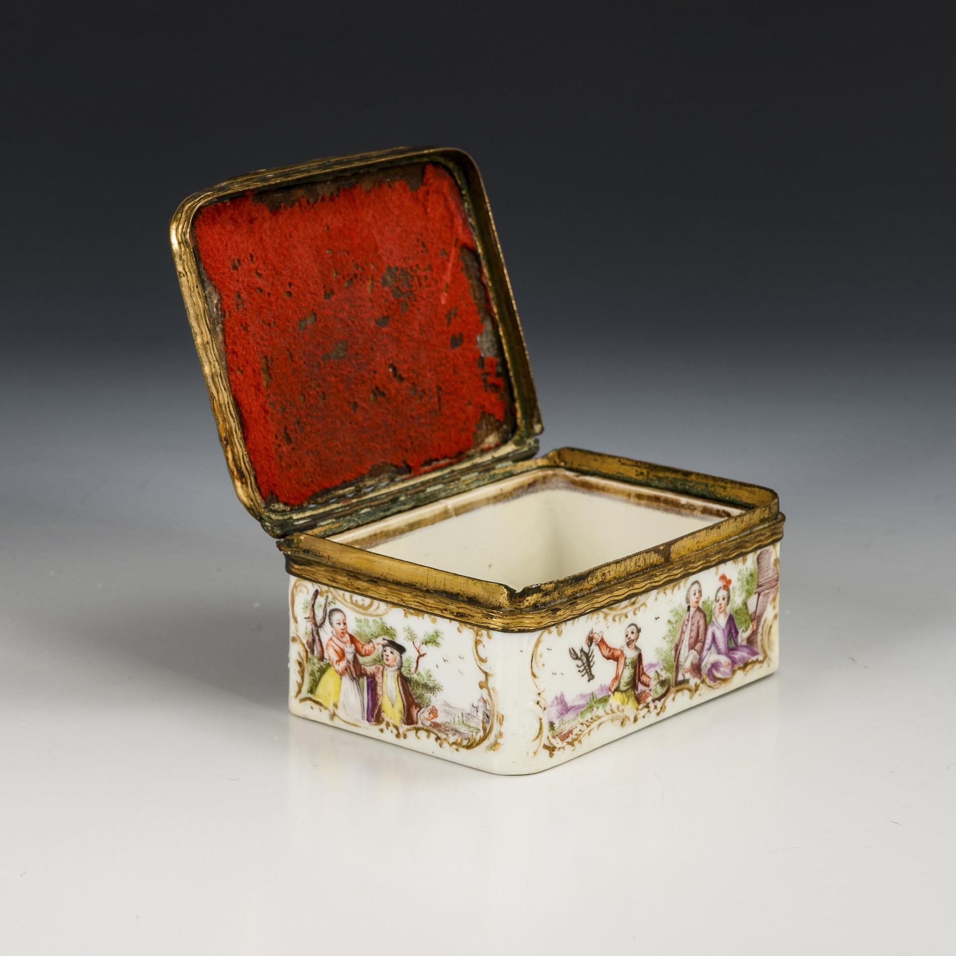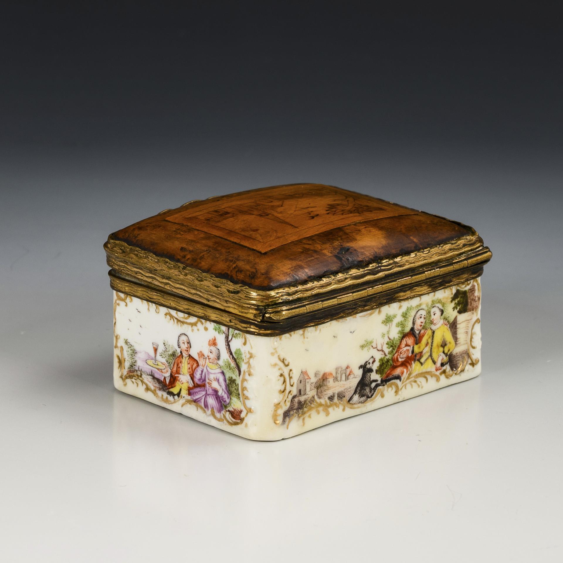 Rectangular, rocaille-decorated box with metal-mounted hinged lid. Painted gallant scenes on all sides, more recently added wooden lid. Interior base and walls, 2 corners and back restored.