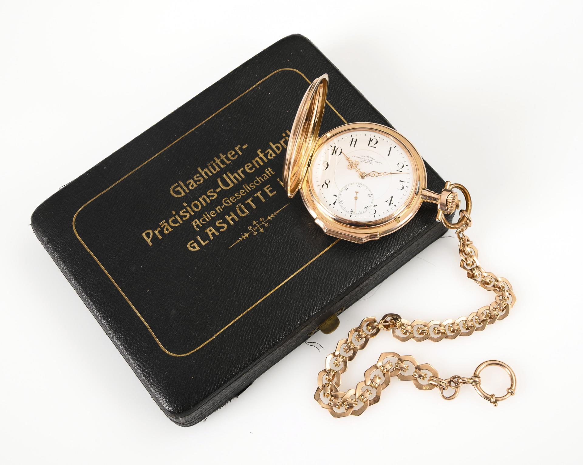 Rare gold savonnette with gold watch chain and original case. Glashütter Präzisions-Uhren-Fabrik Aktiengesellschaft Glashütte in Saxony.