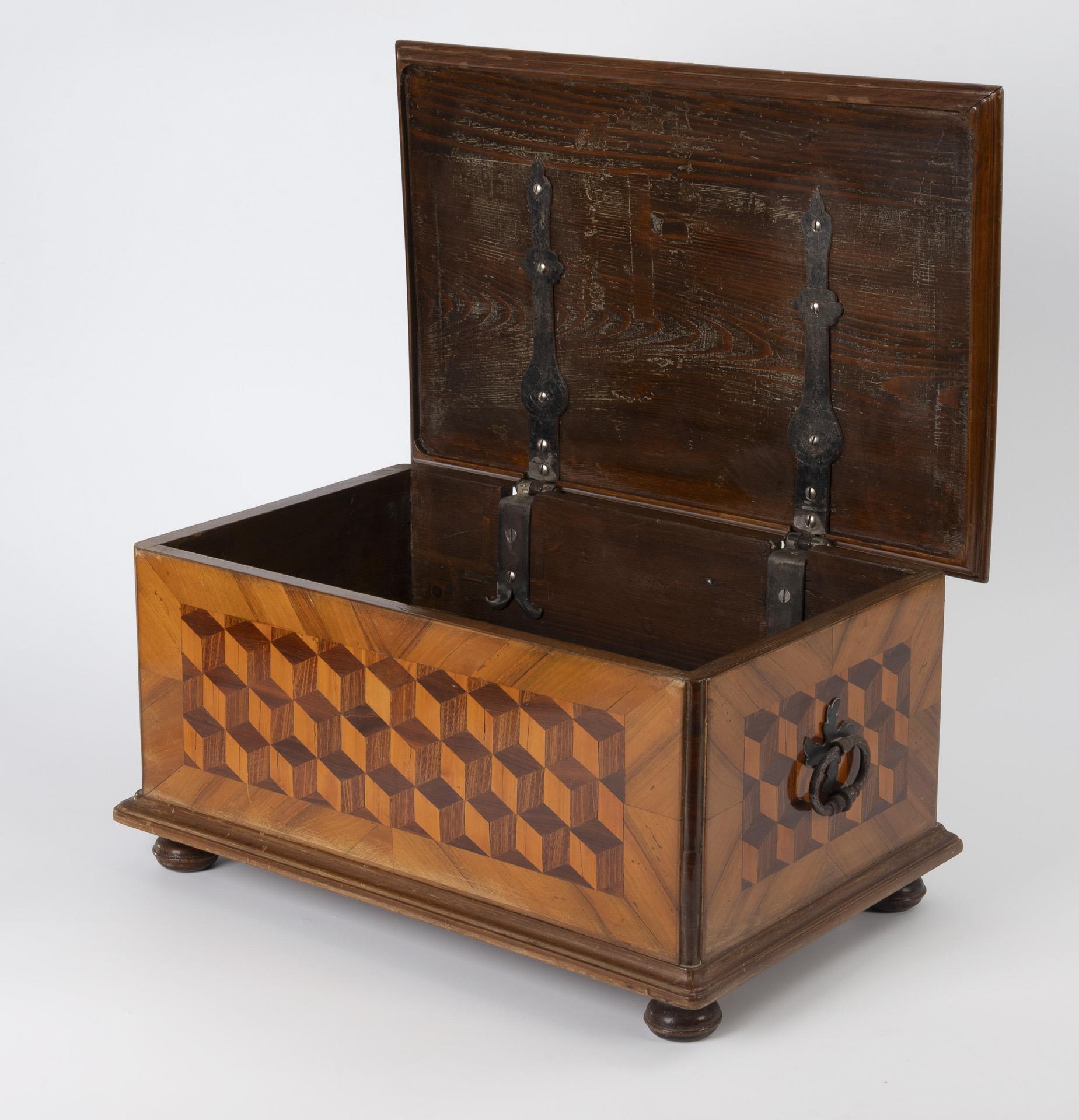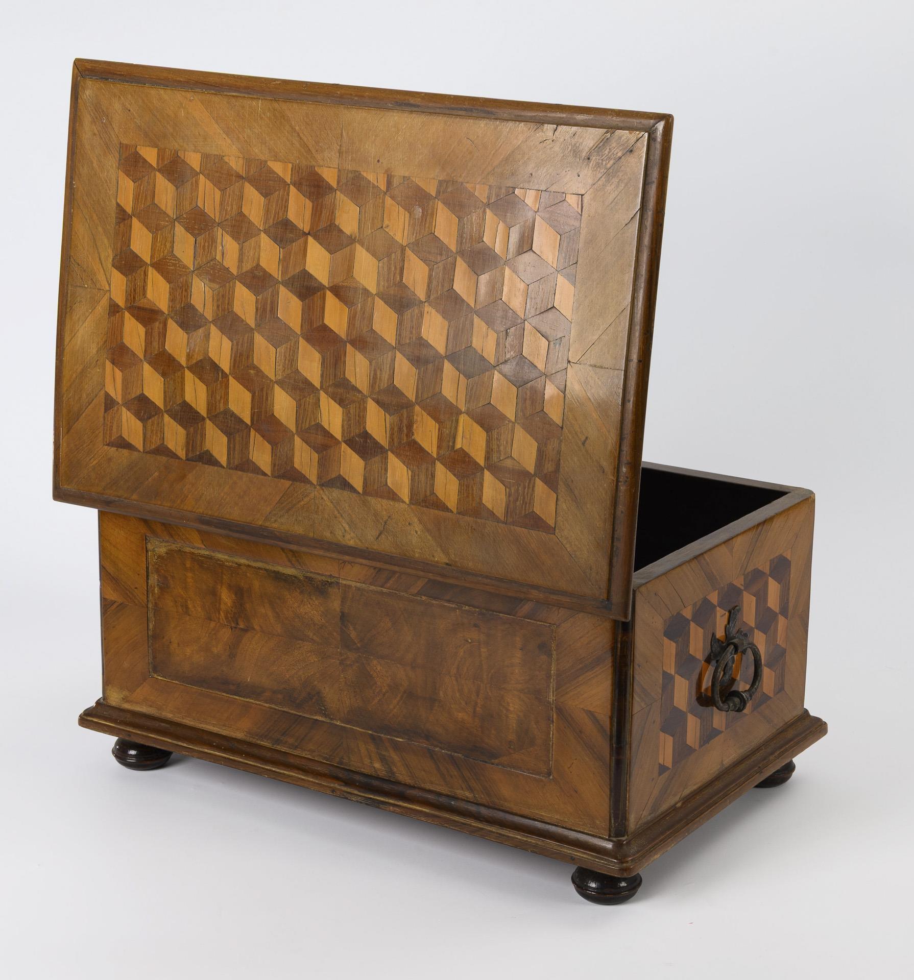 Casket standing on pressed ball feet with cantoned corners, profiled base and lid edges and side handles. In the front, on the sides and on the straight hinged lid, mock caskets with optical dice marquetry, mirror veneer on the back. Restored with minor additions, some signs of age/use.