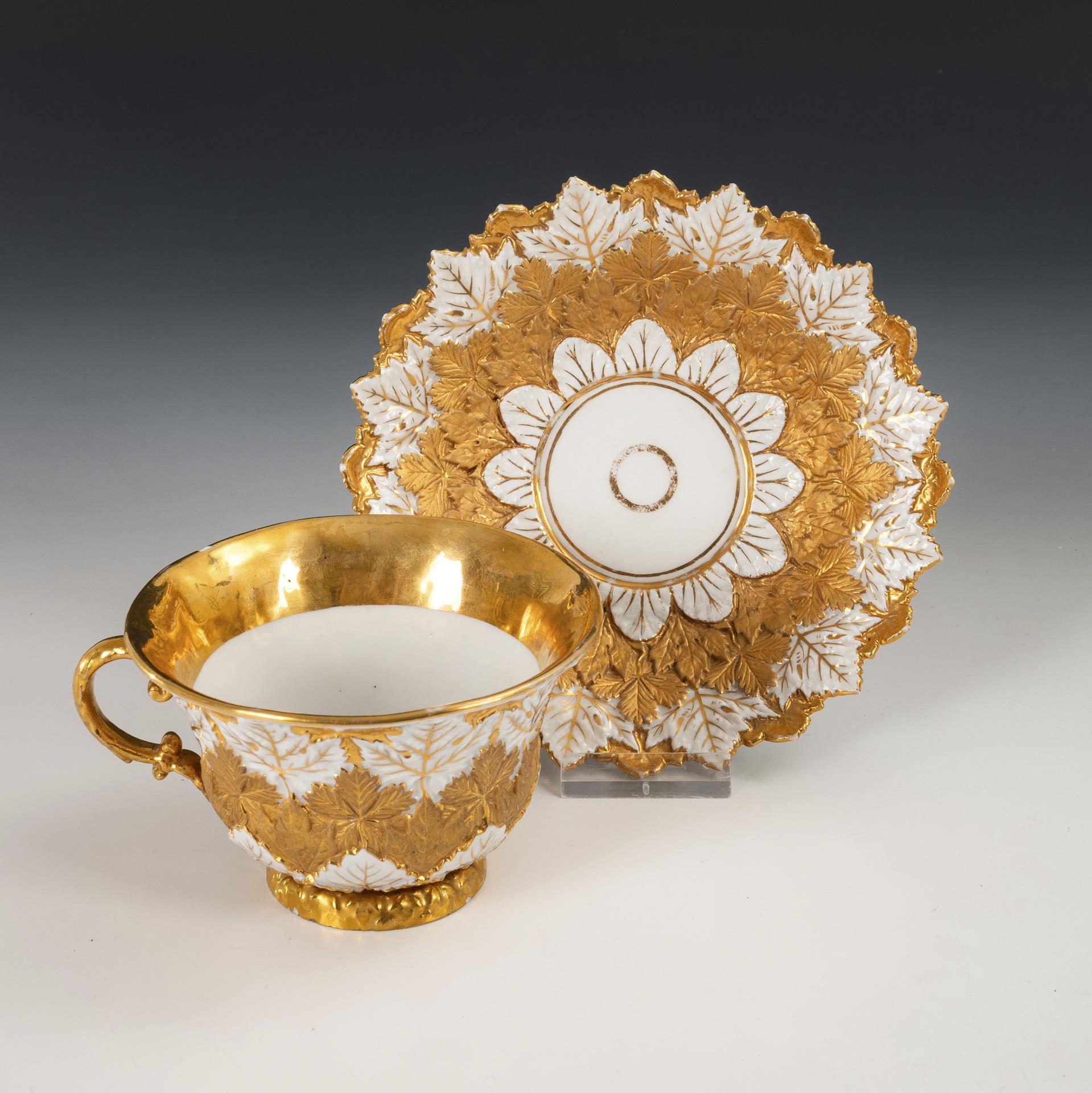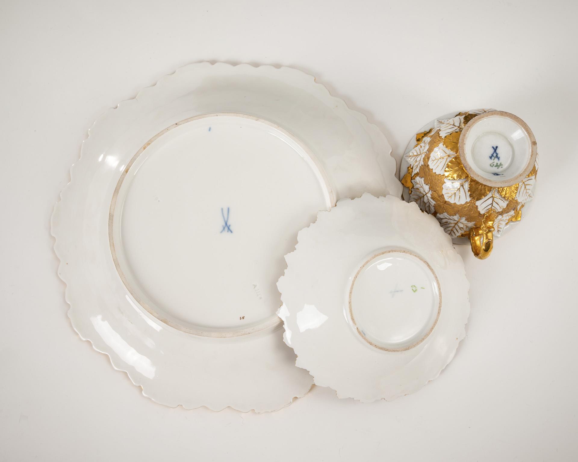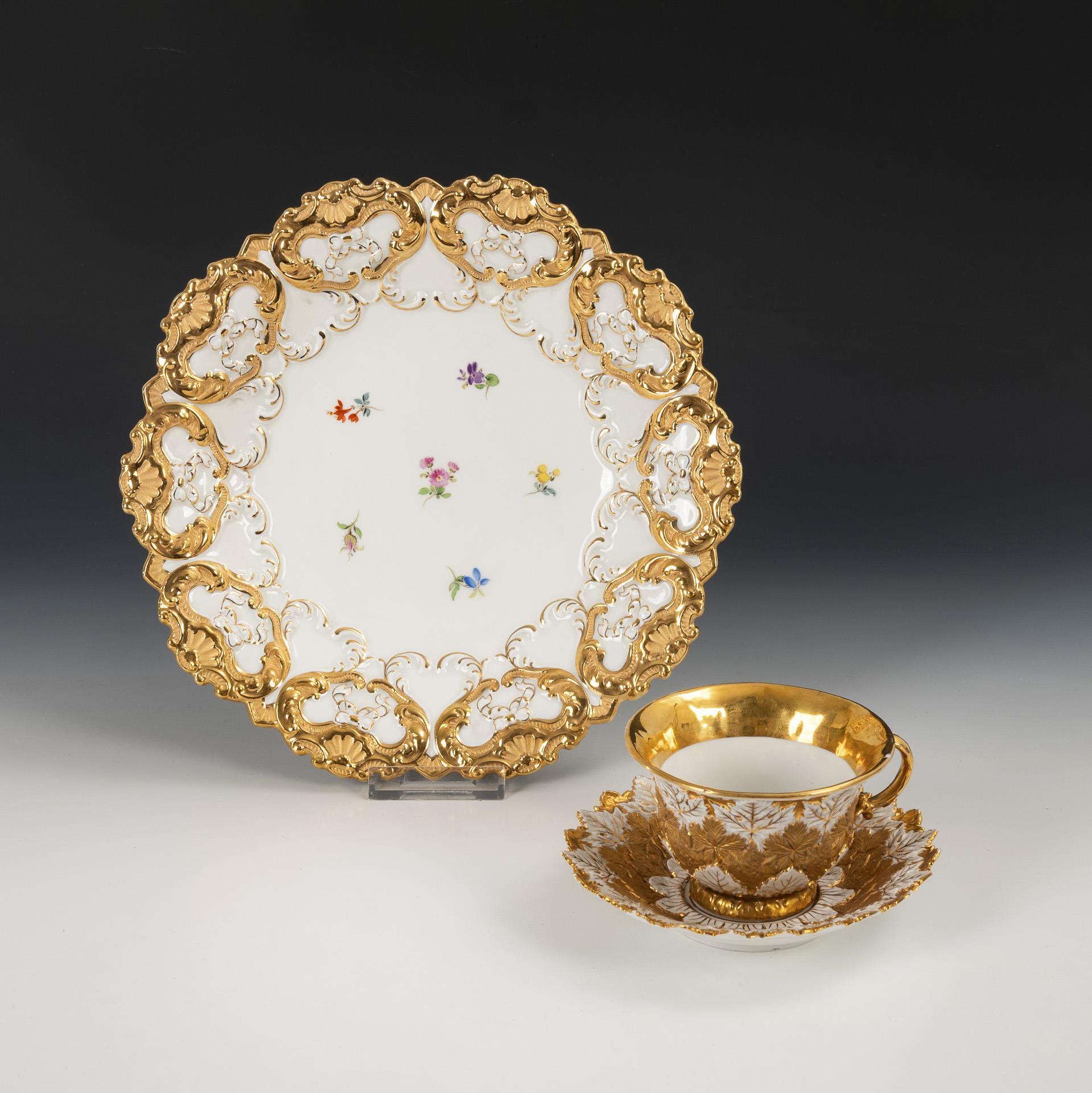 1x sword mark, c. 1840/50: Bell-shaped cup and saucer with partly gold-bronze vine leaf relief (h cup 6.5 cm, Ø original saucer 14.5 cm). / 1x sword mark, year mark 1966, 2 grinding marks: Plate with partly gold-bronzed rocaille relief and scattered flower painting (Ø 27.5 cm). Cup defective (long hairline crack).