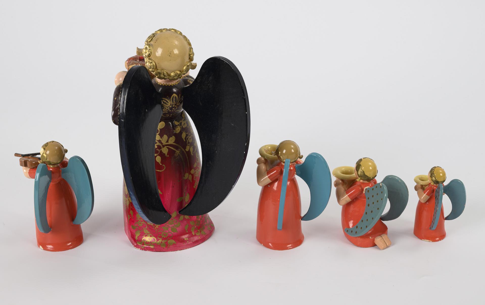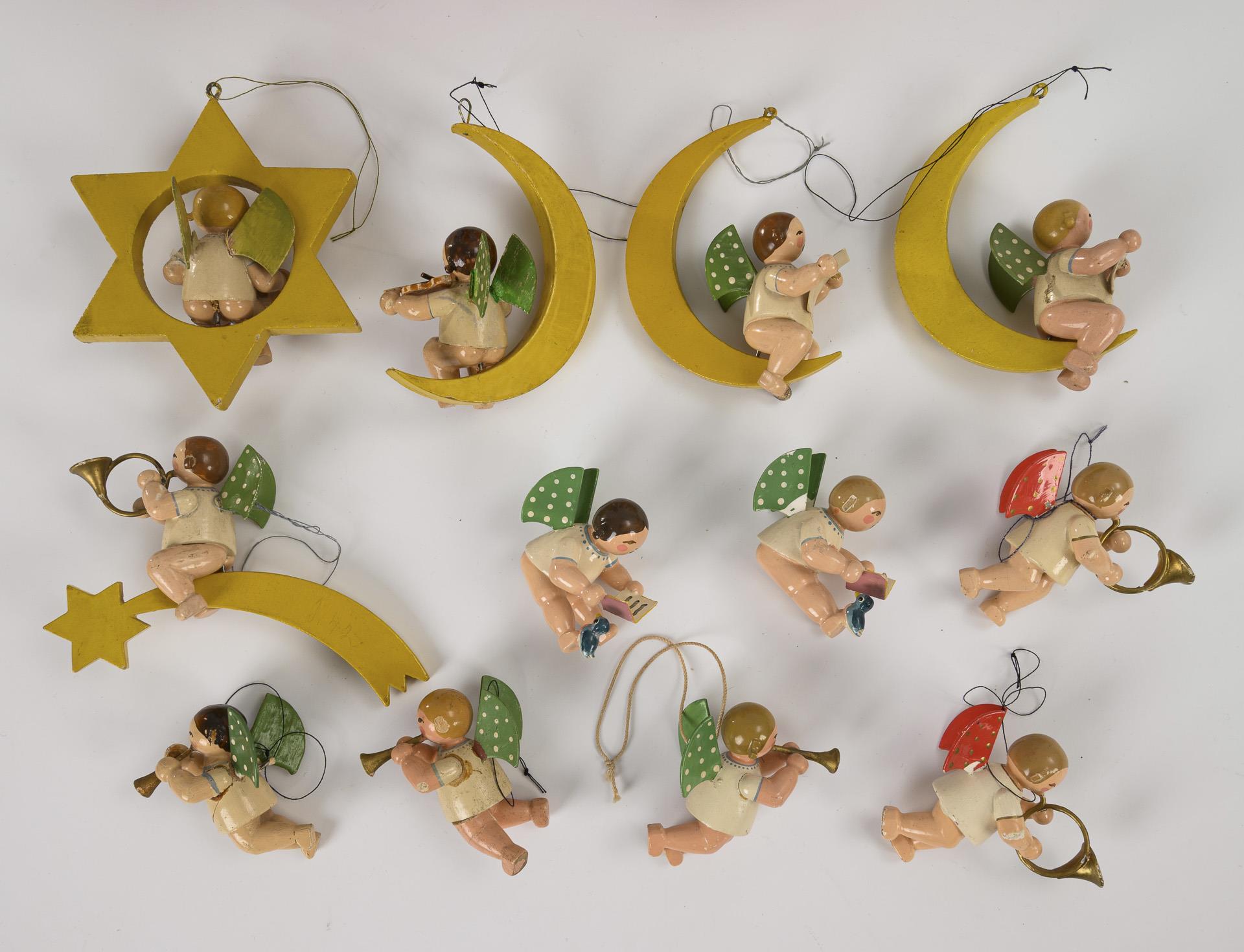 Large, richly painted "brocade" angel with light bowl, 4 smaller angels with red dress and blue wings (H 6 - 8.5 cm), 10 parts Christmas tree decorations (5x angels on celestial bodies, 5x floating angels), plus 2 singing angels with songbook. Minor defects and loss of color.