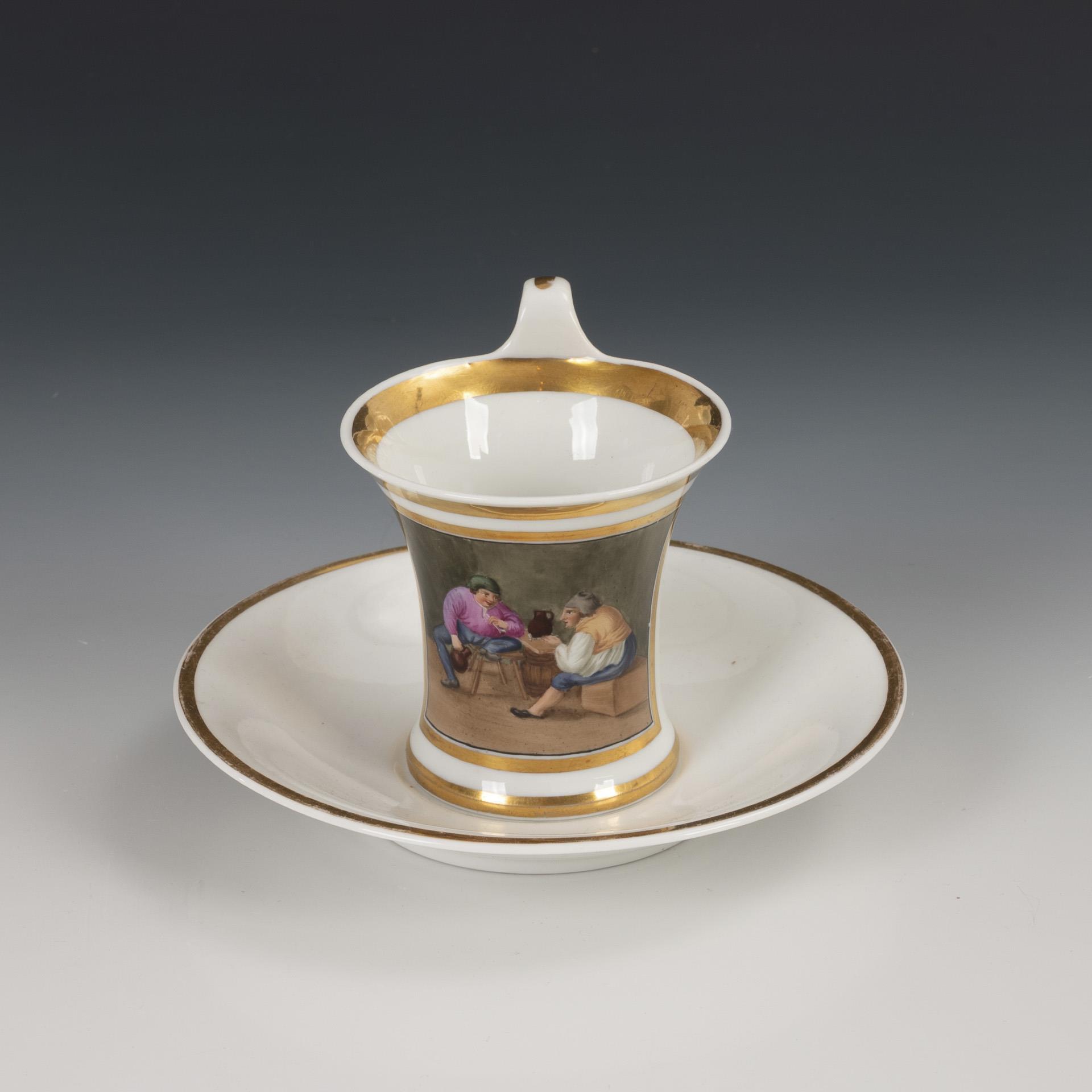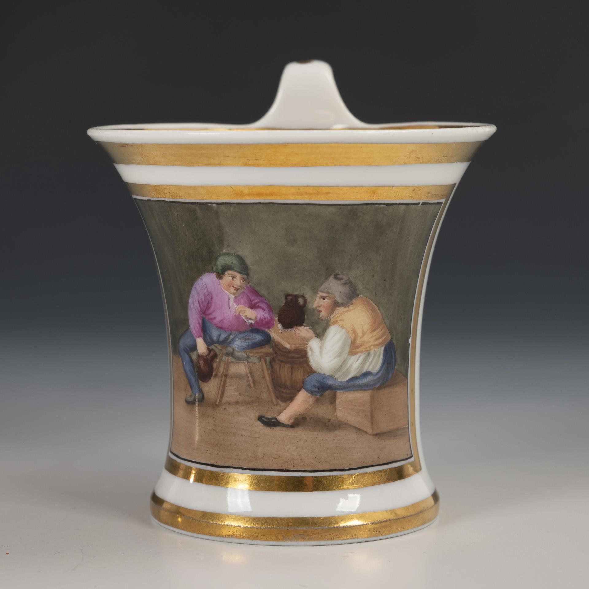 Cratered cup with campanile handle. The front with a gold-framed rectangular cartouche depicting two men in an inn. 2 minimal losses to the edges.