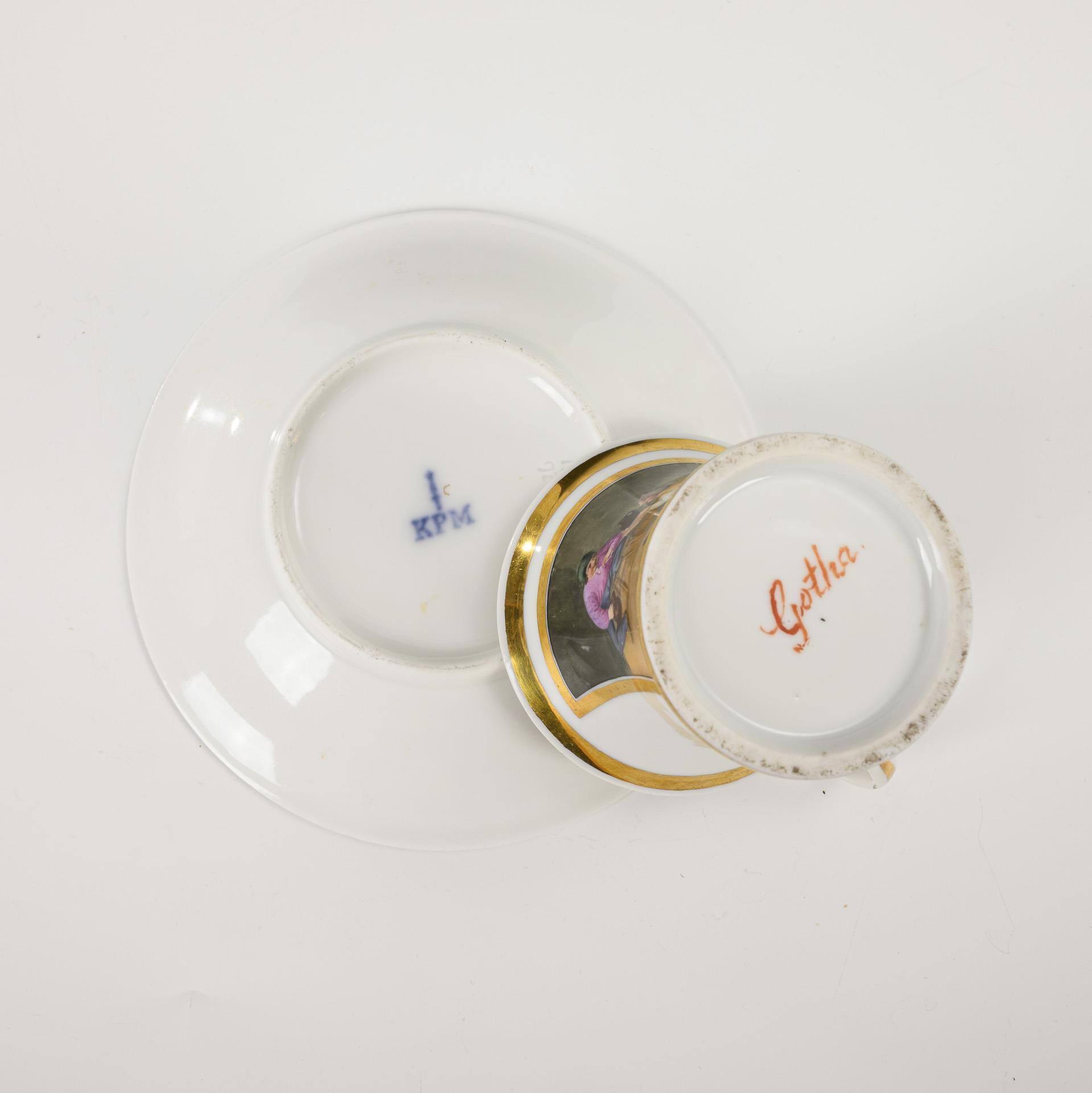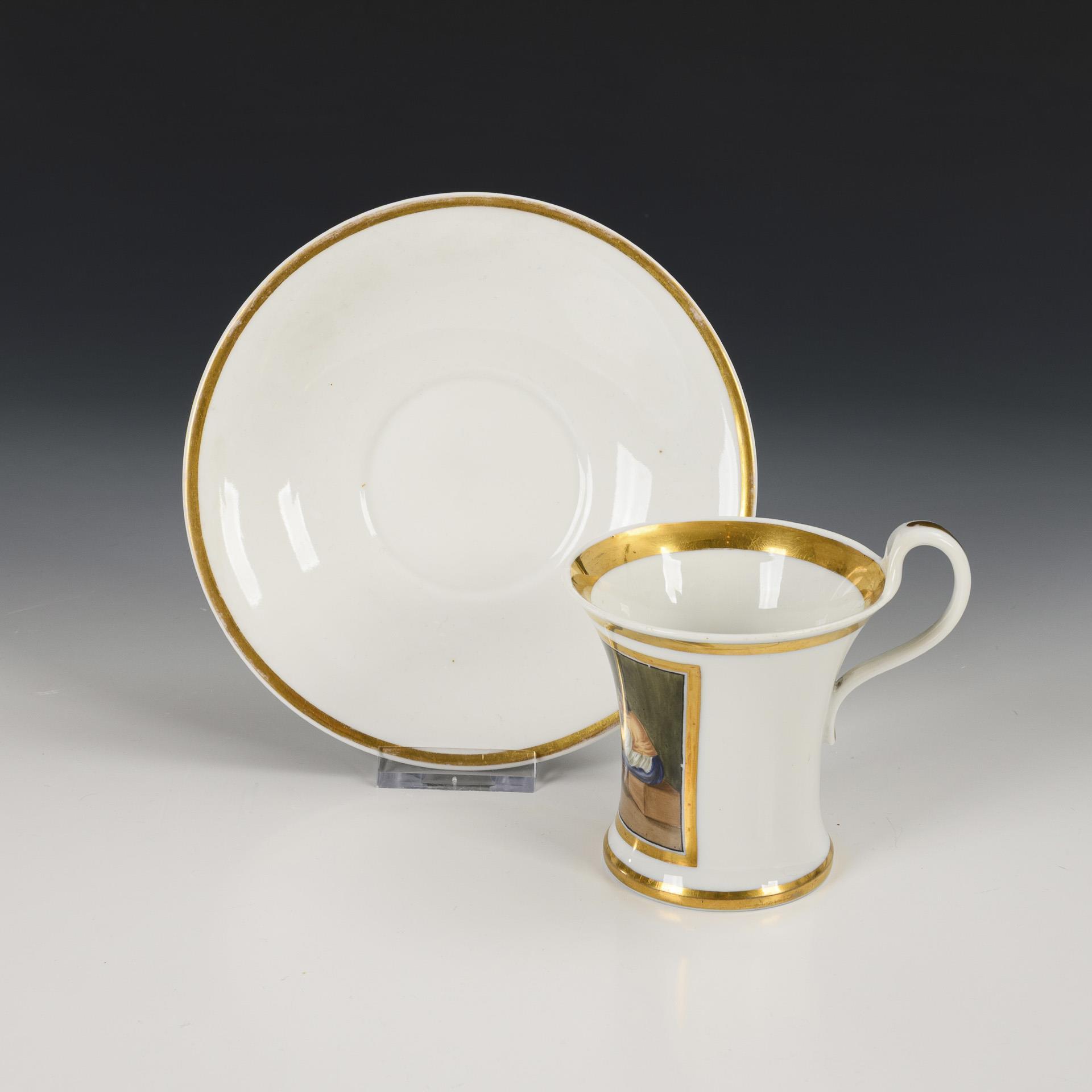 Polychrome painted, decorated in gold. Cup (h 9 cm), completed saucer (Ø 15 cm).
