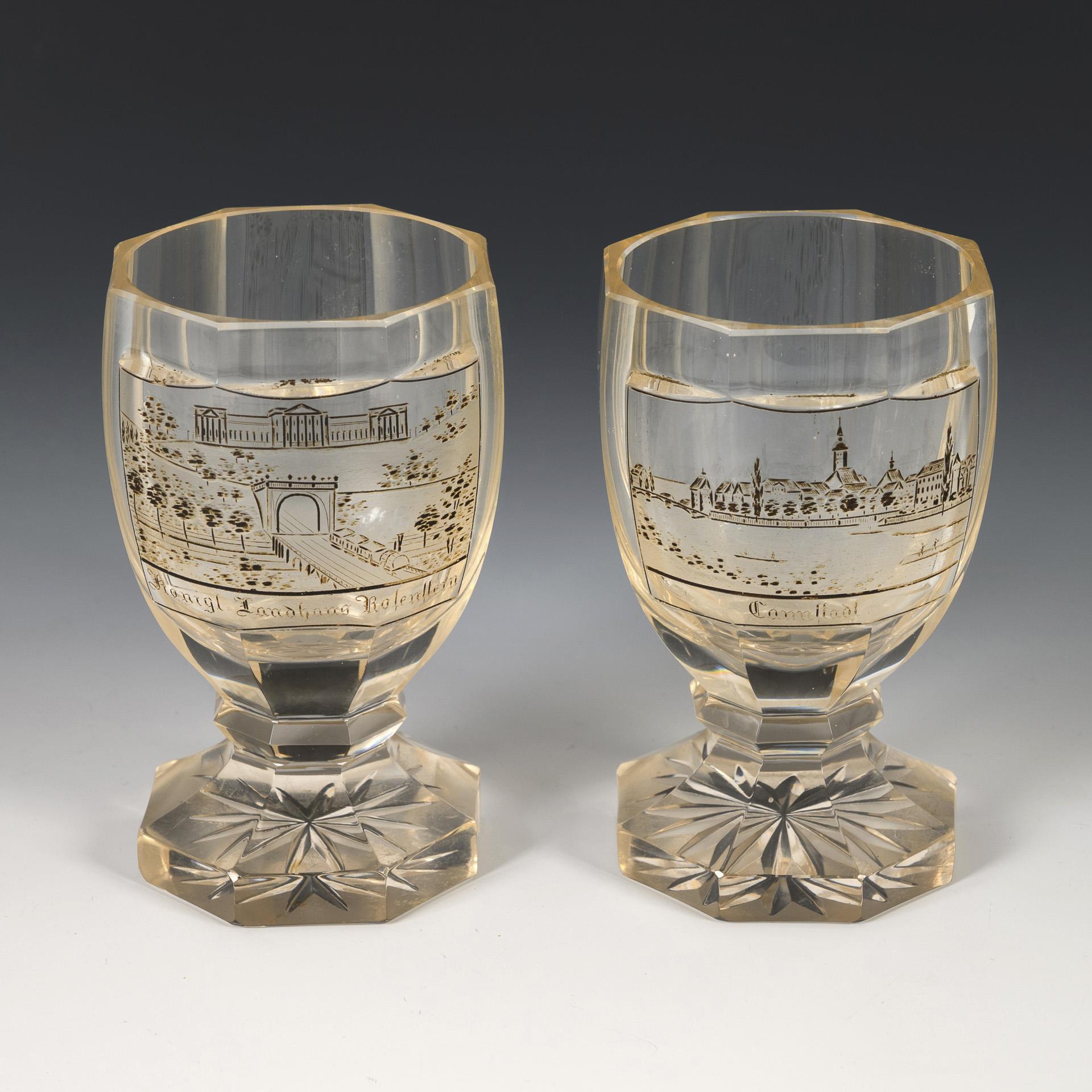 Ovoid, eight-facetted bowl, short stem, octagonal foot, star-shaped base. On the front of the dome a high-cut rectangular cartouche with engraved and sepia-toned, inscribed views of Stuttgart (Cannstadt and Königliches Landhaus Rosenstein). 1x with minimal rim chip.