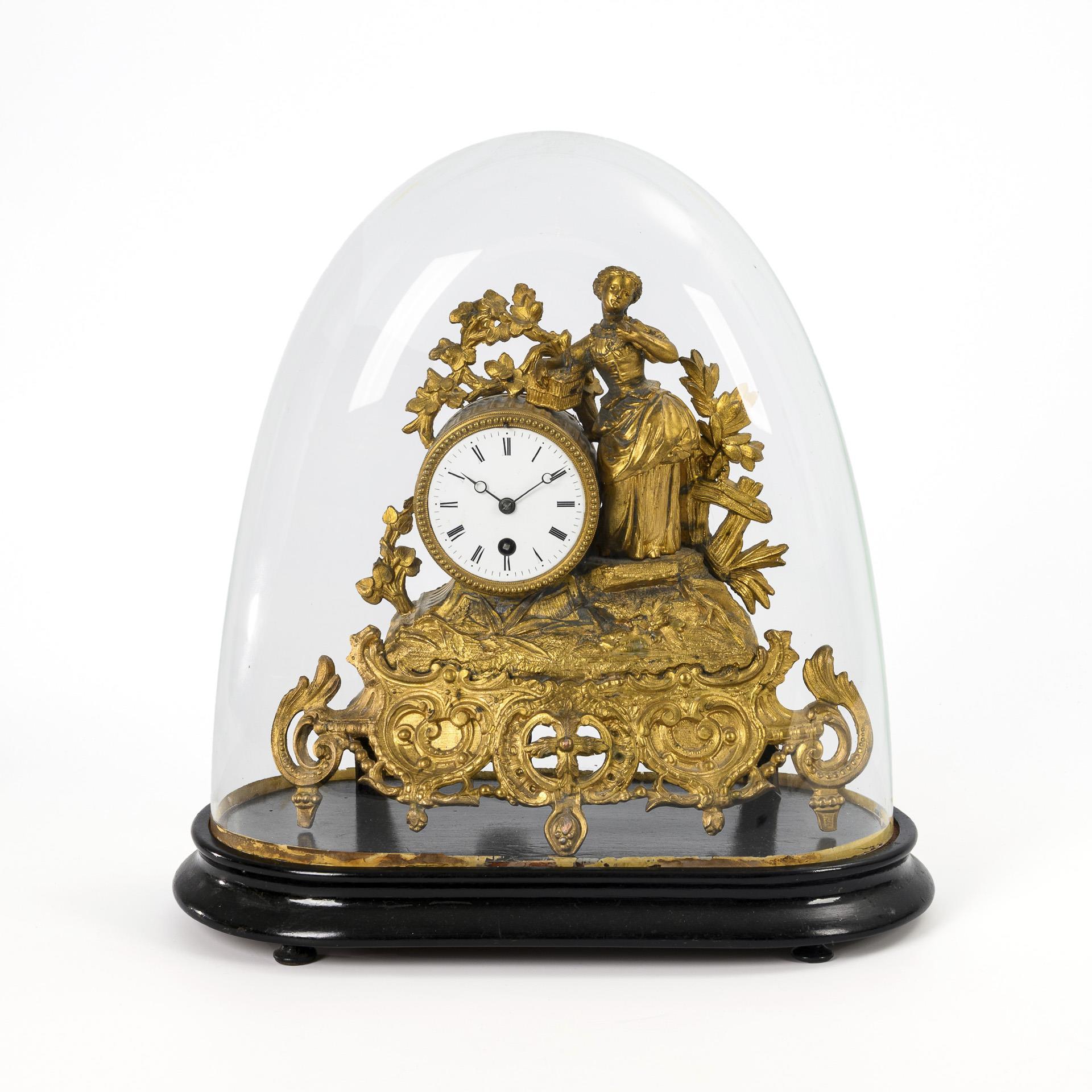 Bronze-plated cast metal. Clock 30 x 31 x 14 cm, glass dome 42 x 40.5 x 19.5 cm. Total weight 4.1 kg.