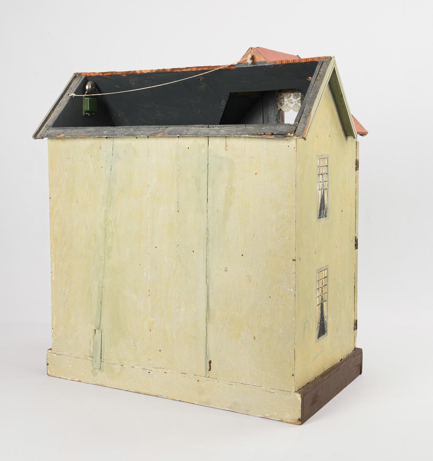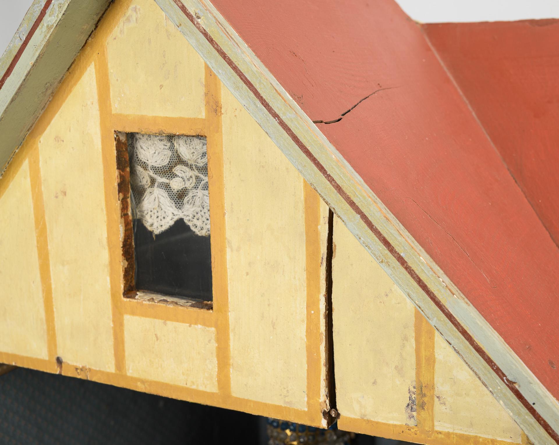 Wood, painted in color on the outside, stenciled windows on the sides, partly old wallpaper on the inside. 79.5 x 71 x 45 cm.