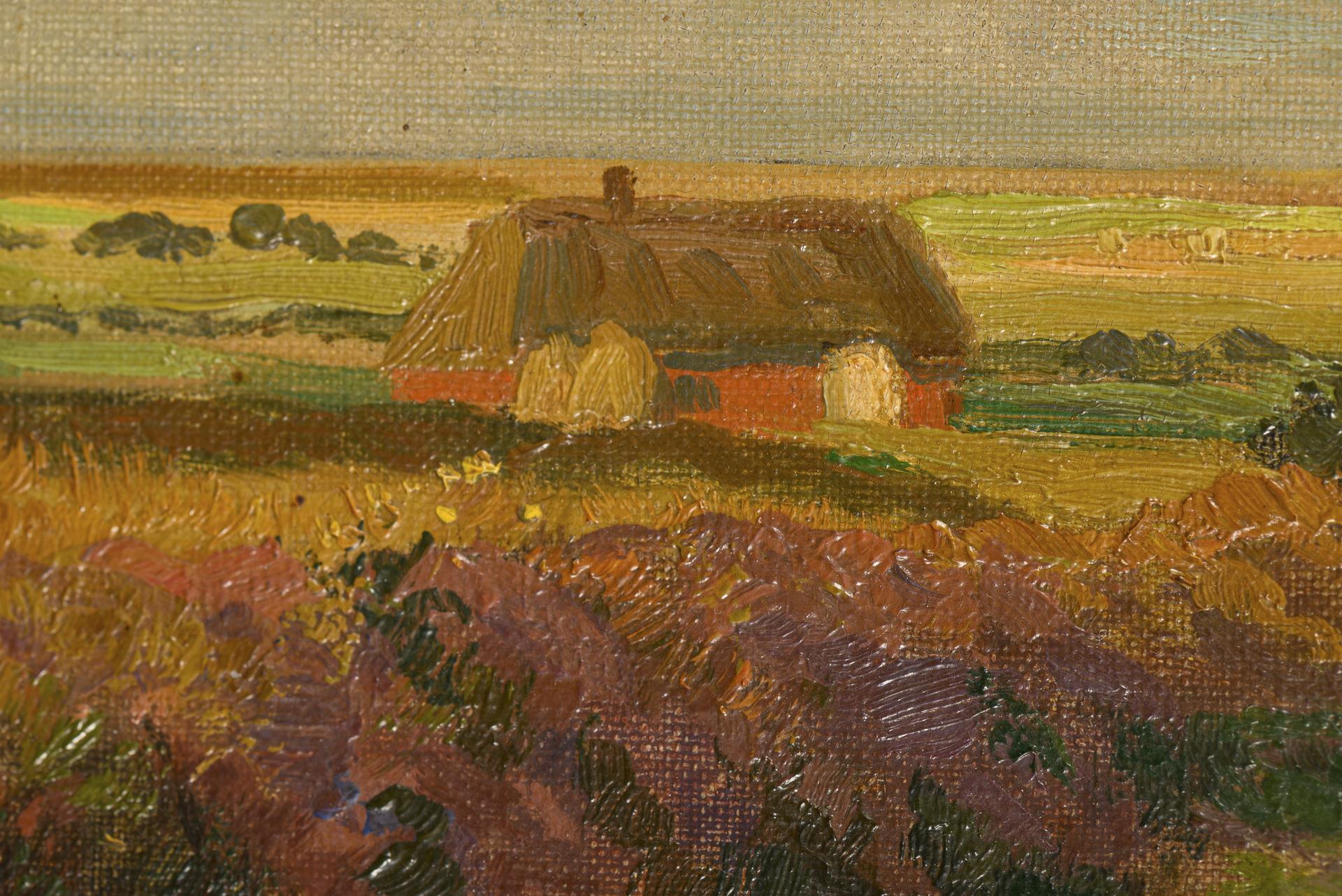 Wide, flat landscape with flowering heather in front of thatched houses and yellow fields.