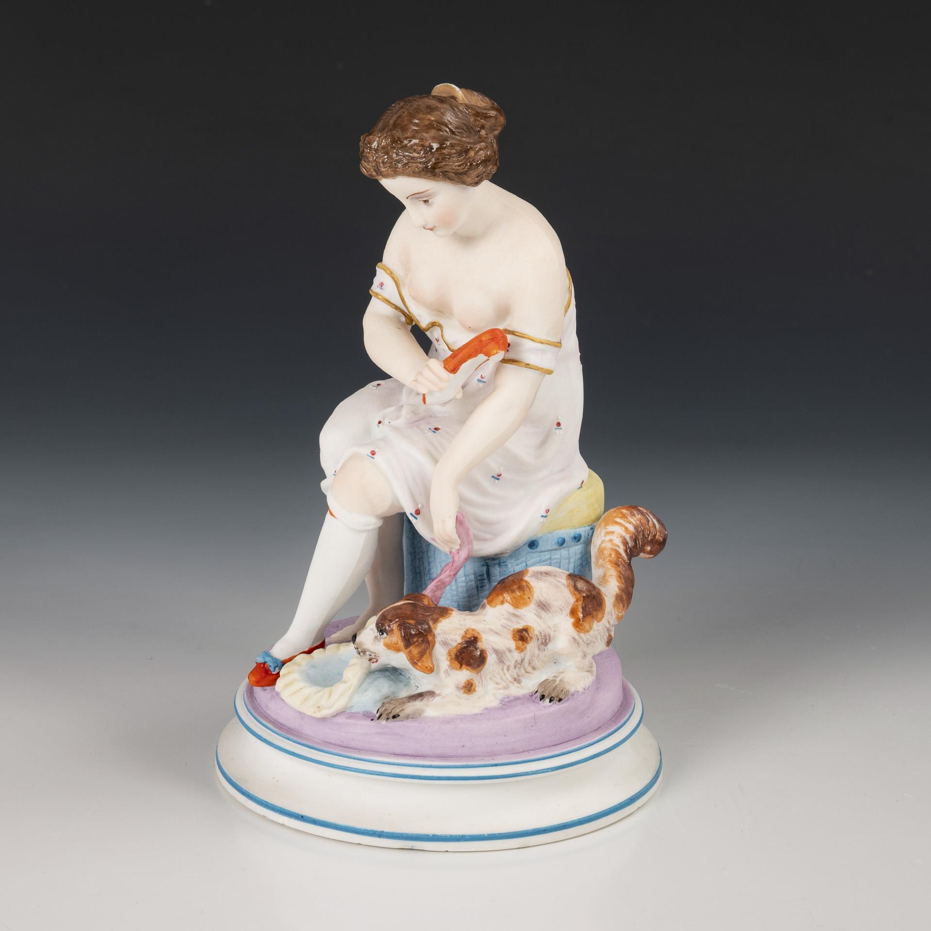A young woman in negligee sitting on a laundry basket, at her feet a dog playing with her bonnet. Restoration to the edge of the base.