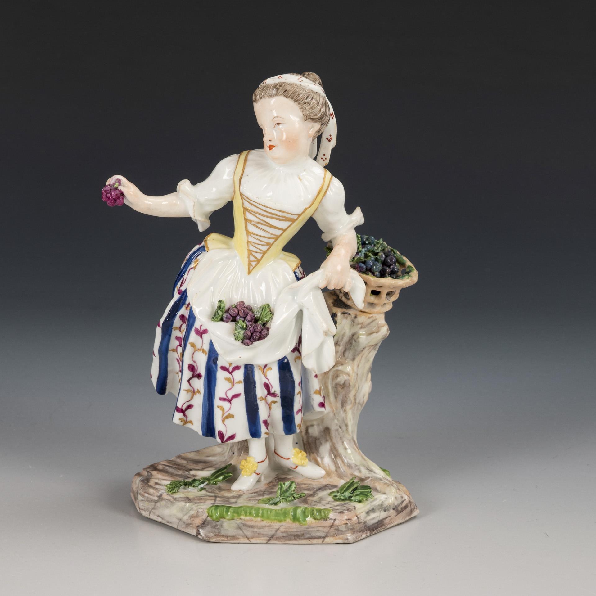 Girl with a grape-filled apron standing by a tree trunk with a basket of grapes. Leaves partially chipped, basket and verso of skirt restored.