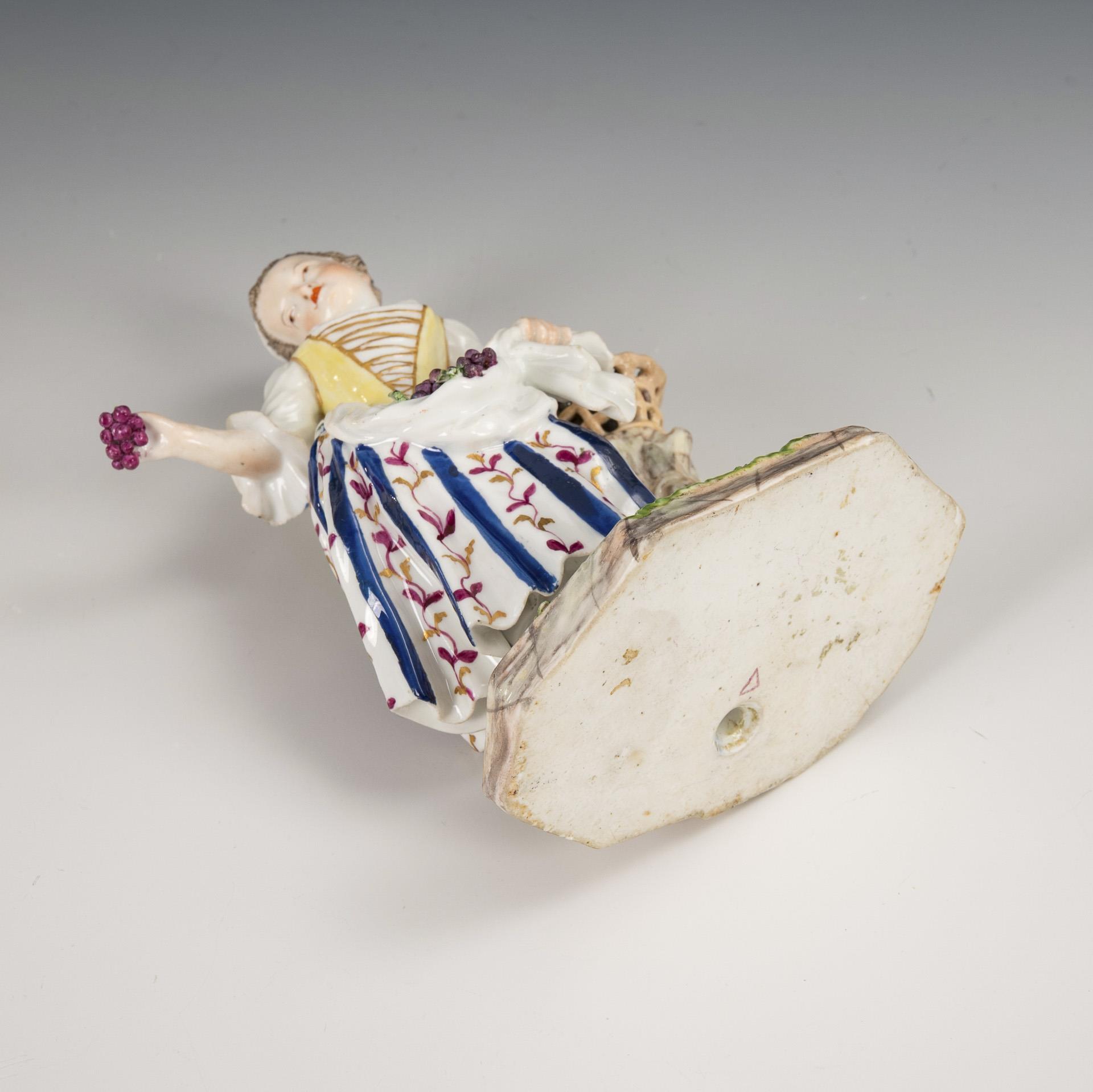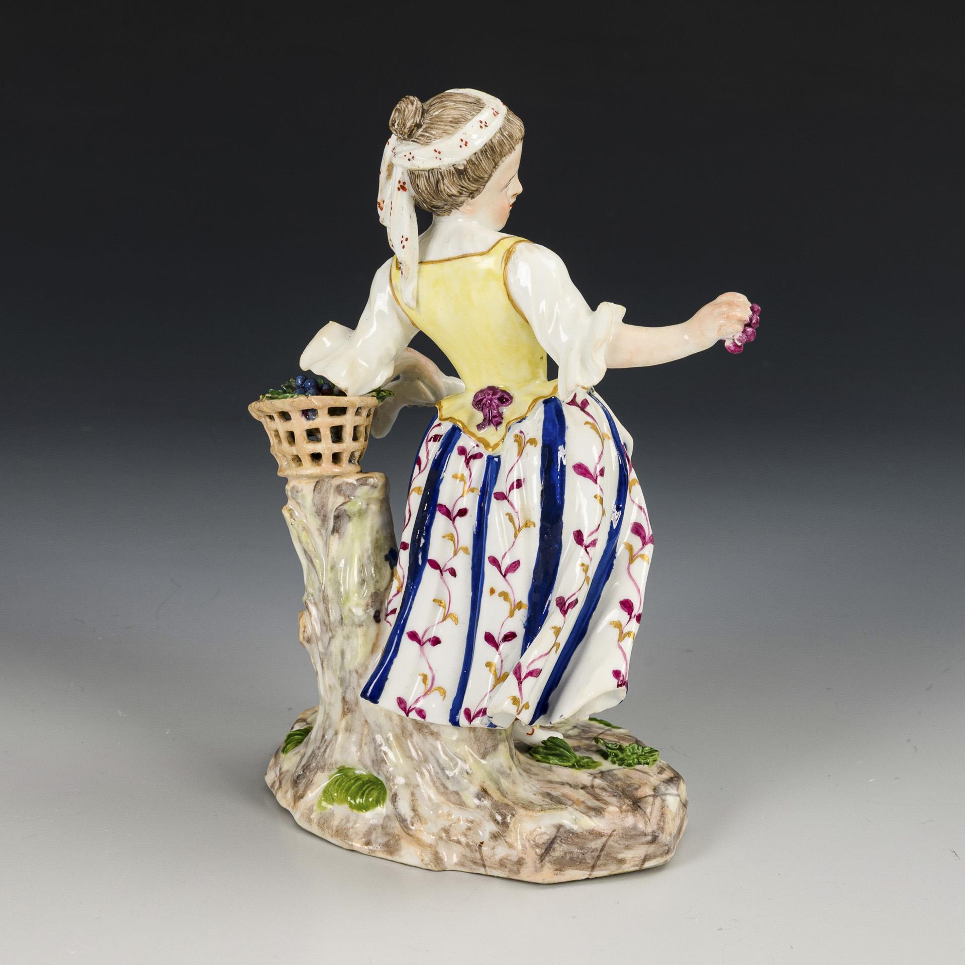 Girl with a grape-filled apron standing by a tree trunk with a basket of grapes. Leaves partially chipped, basket and verso of skirt restored.