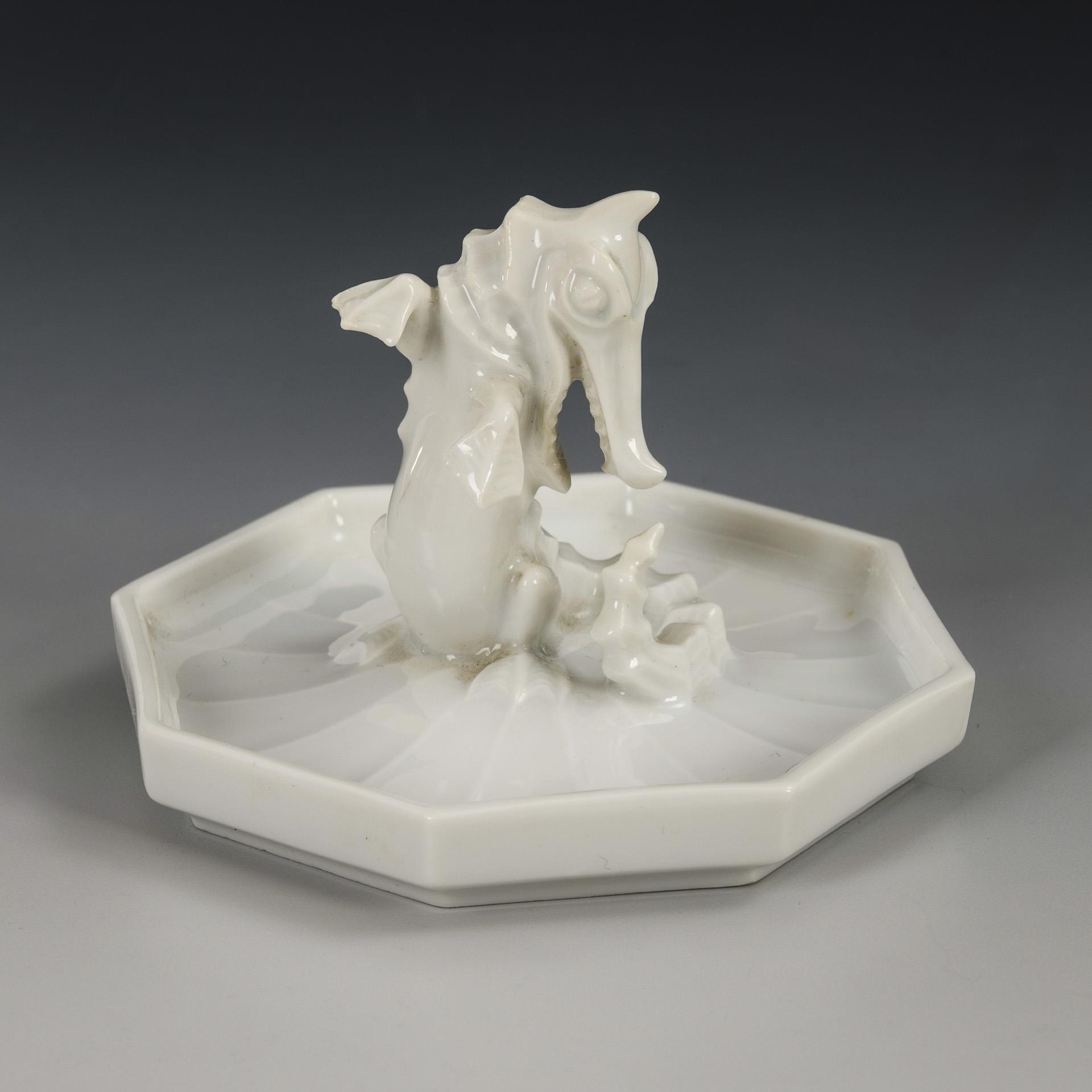 Ocogonal bowl with the sculptural figure of a stylized seahorse.