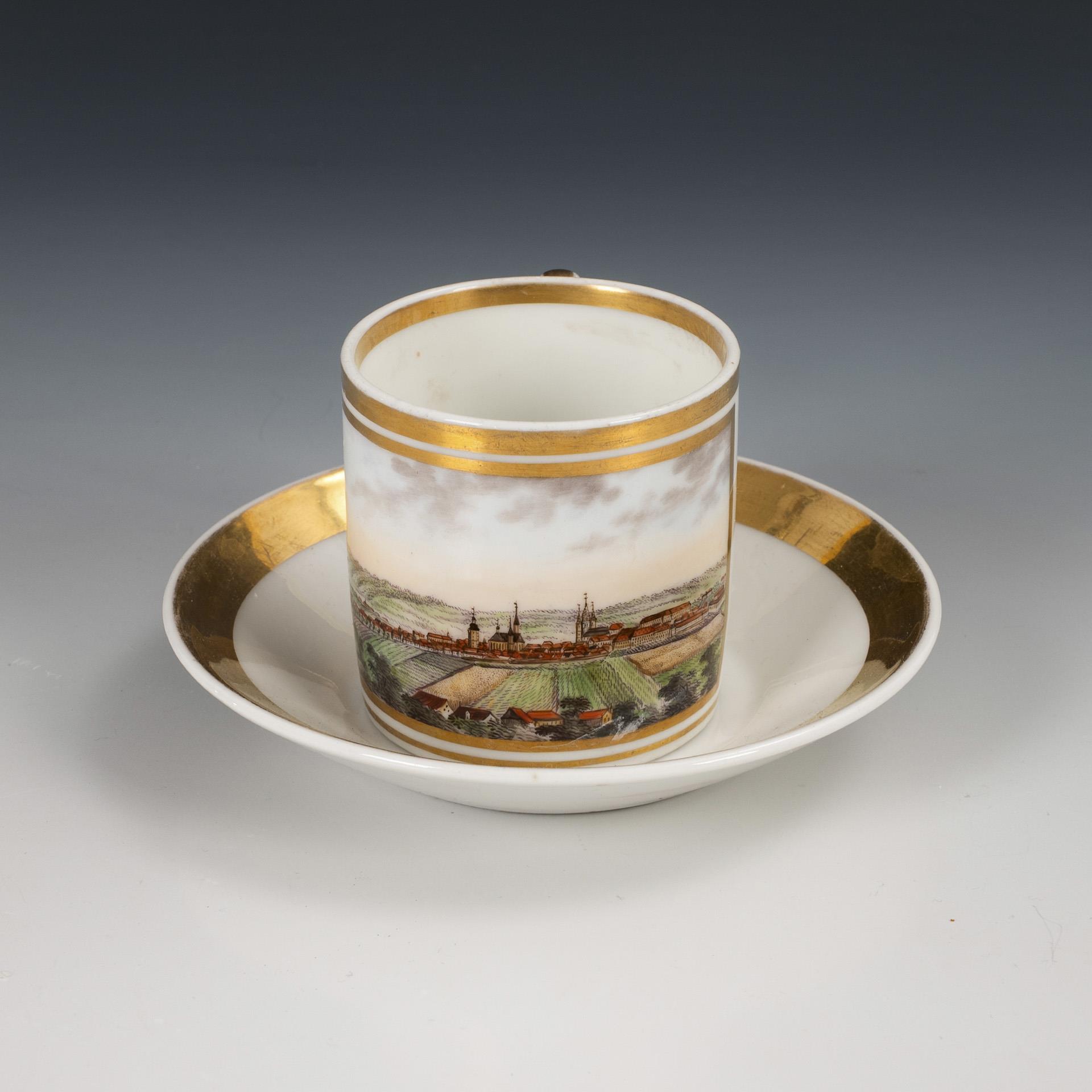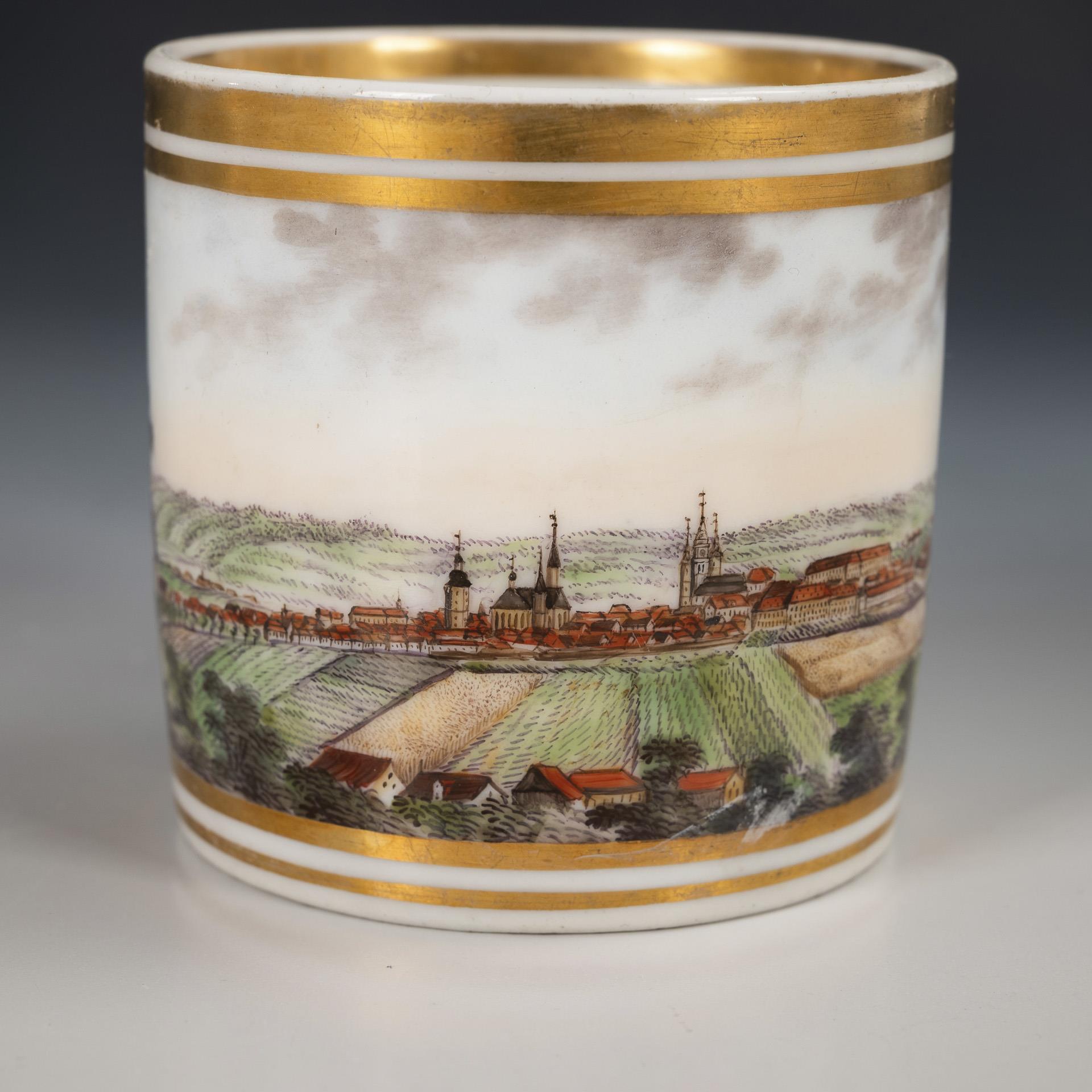 Cylinder cup with ear handle. On the front a gold-framed rectangular cartouche with a view of Ansbach. Handle restored.