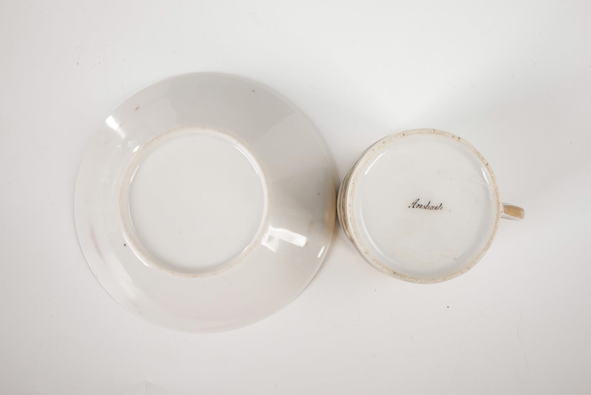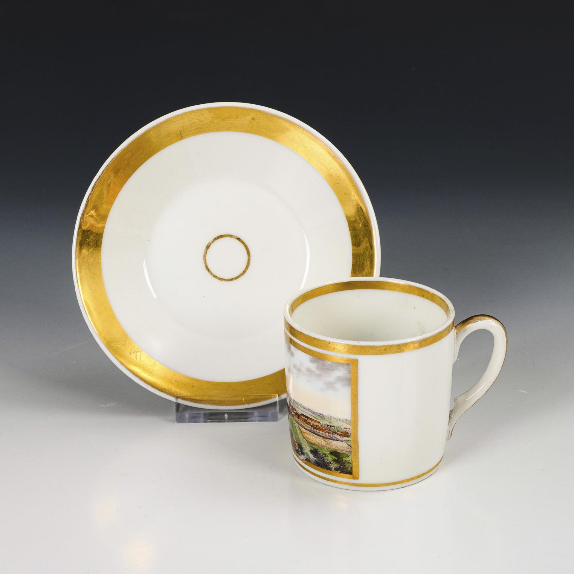 Polychrome painted, decorated with gold. Cup (h 6.5 cm), saucer (Ø 12 cm).