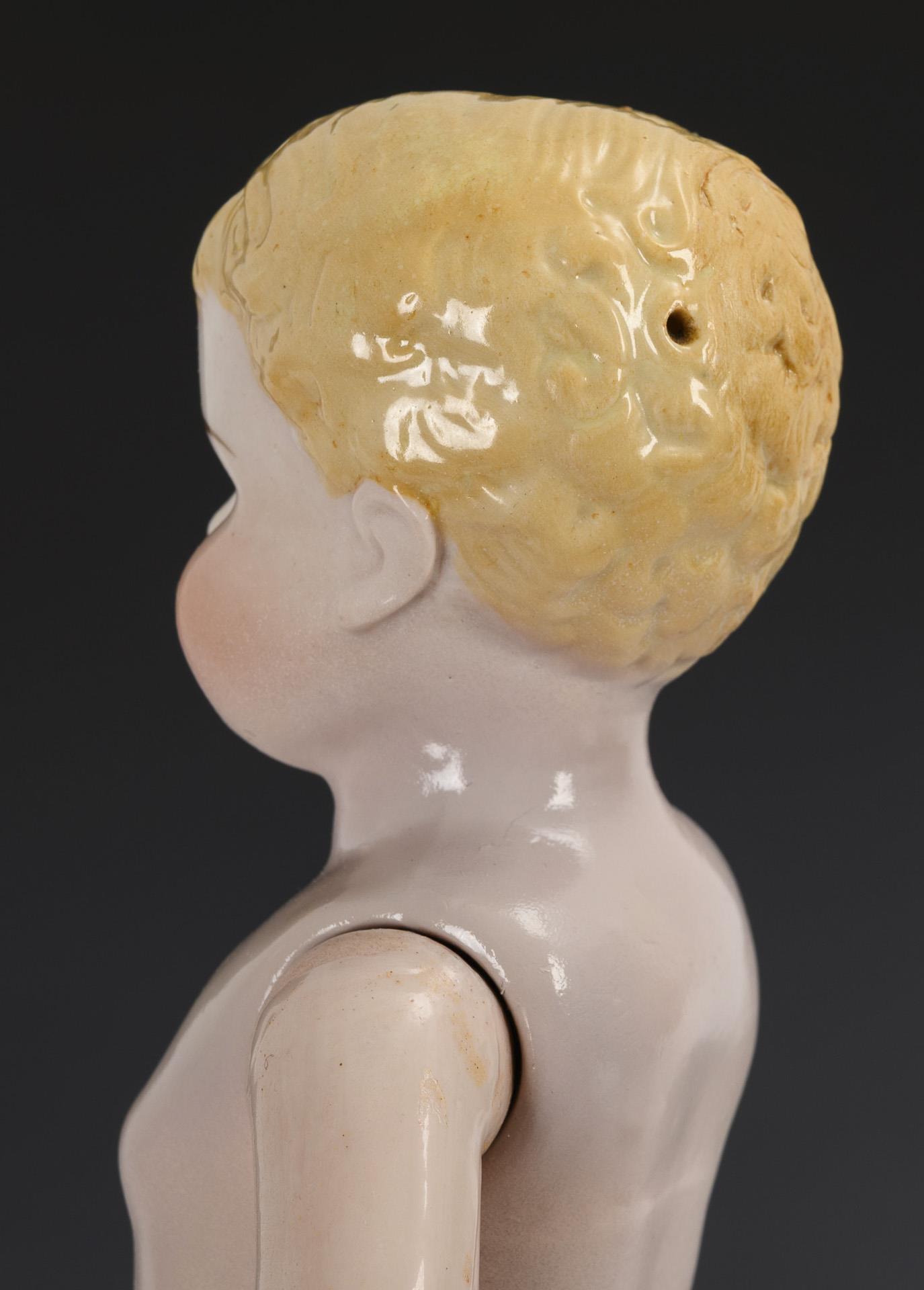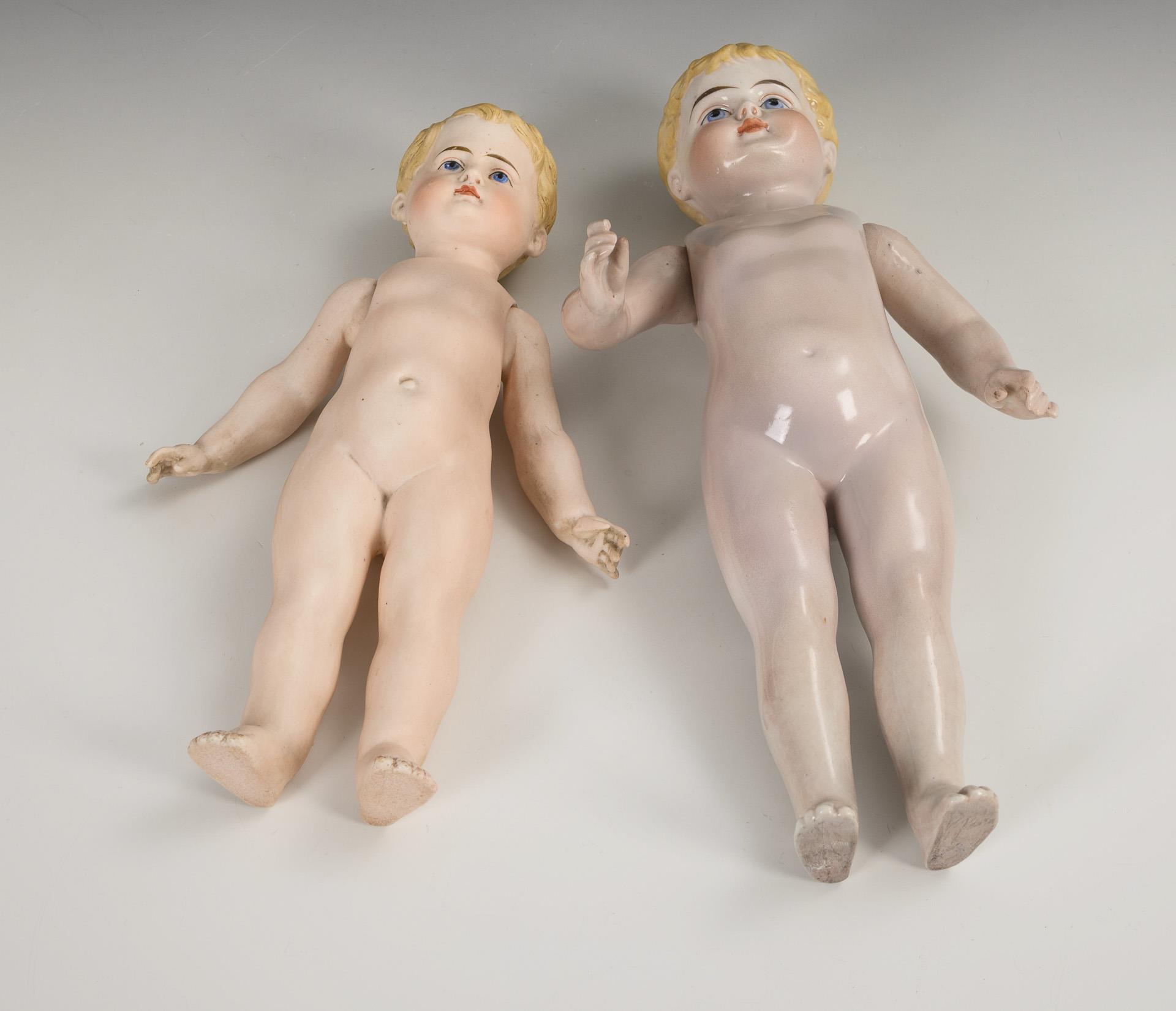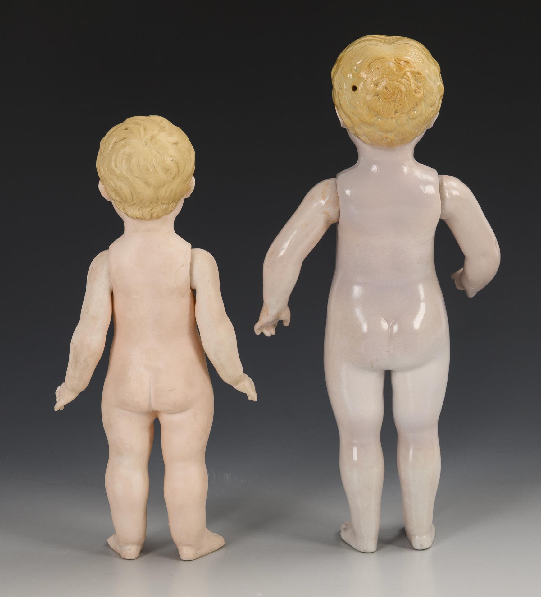 So-called naked frog or Frozen Charlotte. Both with painted blue eyes, sculpted blonde hair, firm legs. 1x glazed, l 28 cm. / 1x bisque, l 24 cm. Body of the glazed doll restored, right arm cutout of the bisque doll with hairline crack.