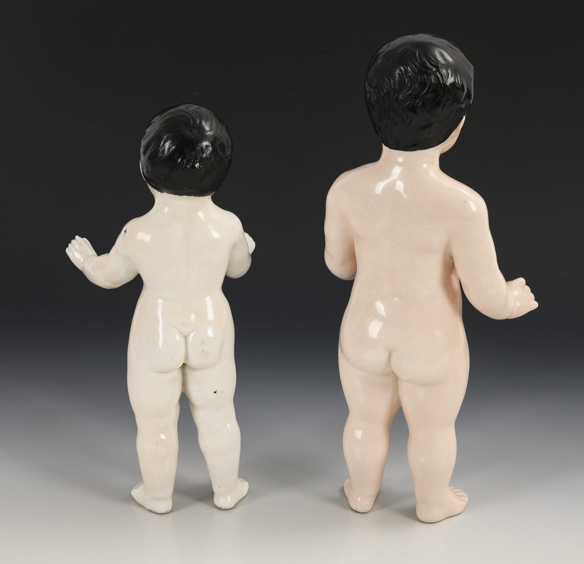 So-called naked frog or Frozen Charlotte. Both with blue eyes and black hair. 1x probably Kling (marked: 3/0), with light spot in the eye and lovely expression, l 32 cm. 1x with open/closed mouth, l 31.5 cm.