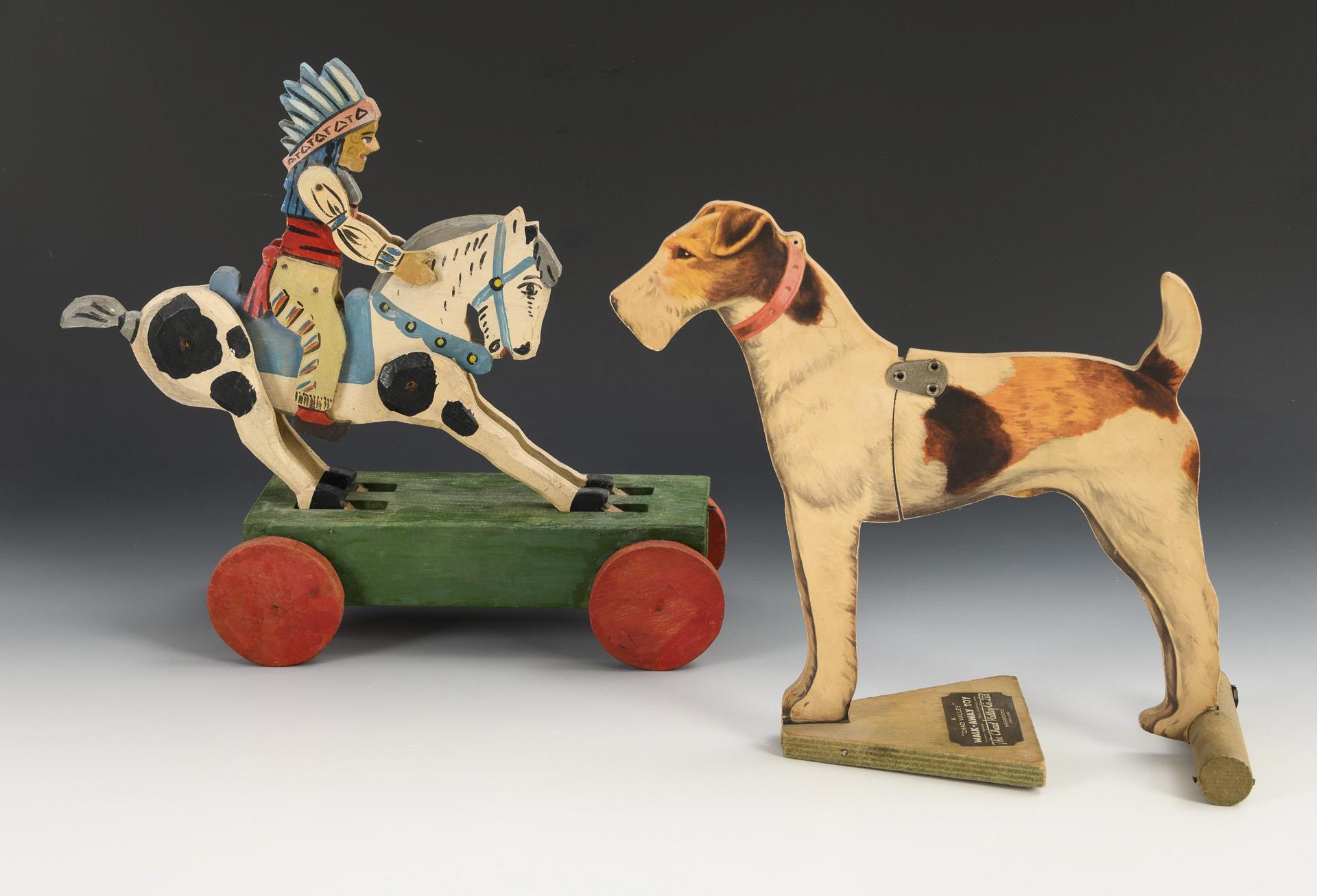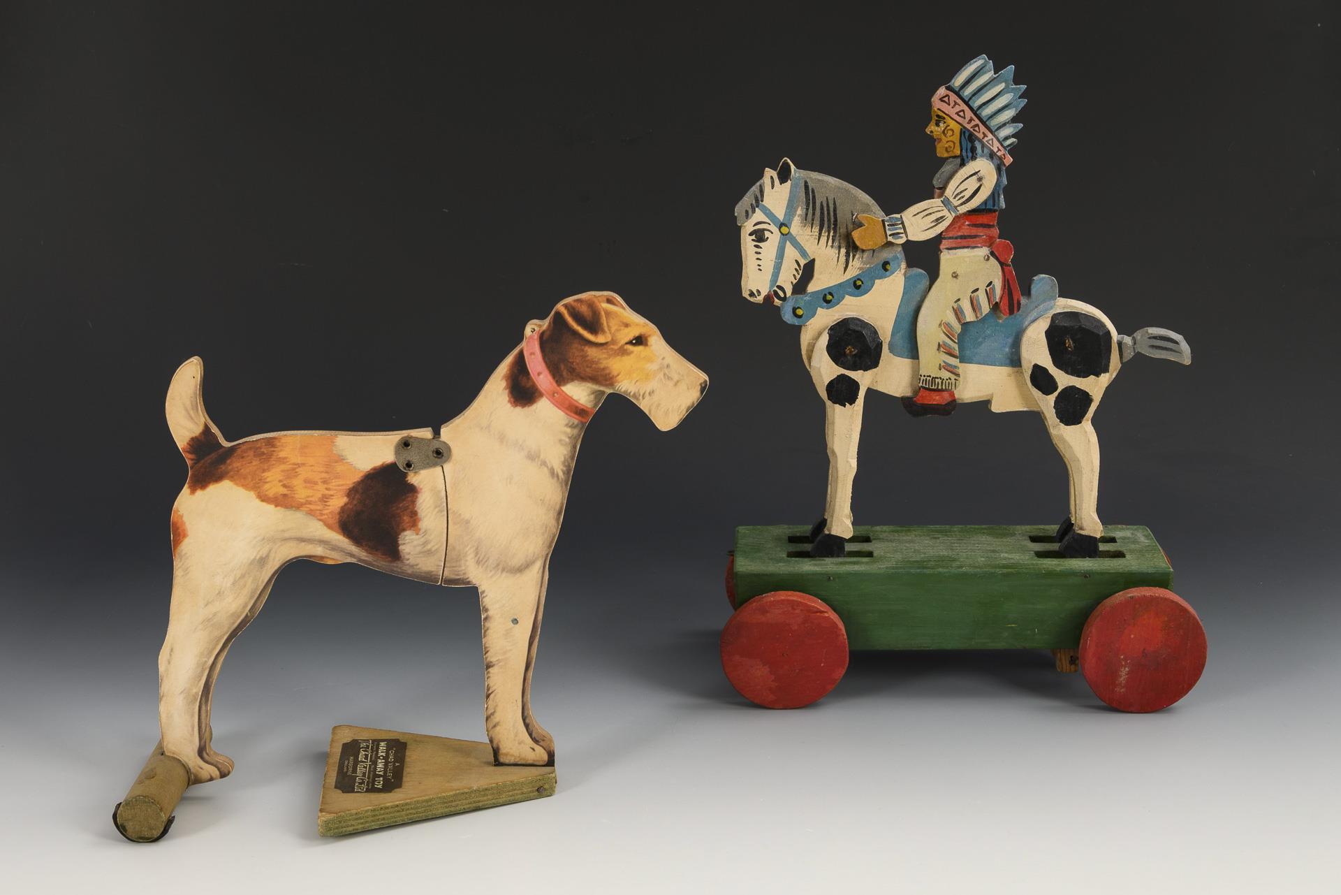 English dog: Running fox terrier. Probably 1930s, 26.5 x 27 cm. / Mechanical pull-along toy: Indian on horse, 36 x 27 x 11 cm.