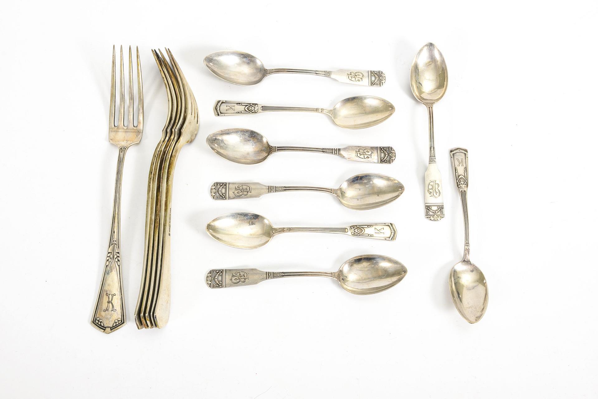 6 Art Nouveau dinner forks with engraved monogram "K", l 21 cm. / 5 coffee spoons with monogram engraving "AB", L 14 cm. / 3 coffee spoons with monogram engraving "K", L 13.5 cm. Slight signs of wear.