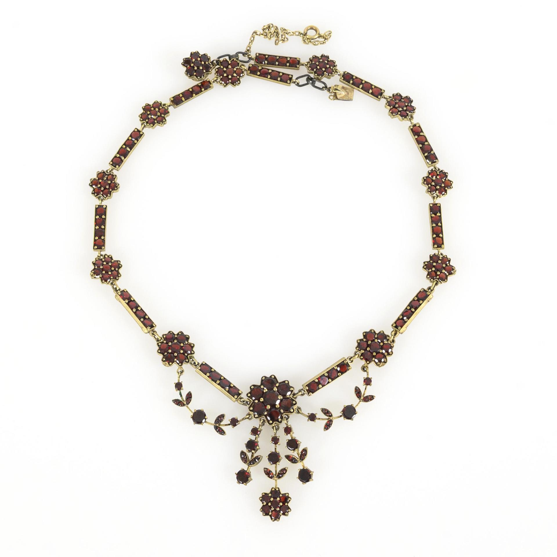 Necklace probably from around 1900, set with garnet stones in various cuts. Box clasp with safety chain. All garnet stones present, slight signs of wear, the clasp probably with recent repair.