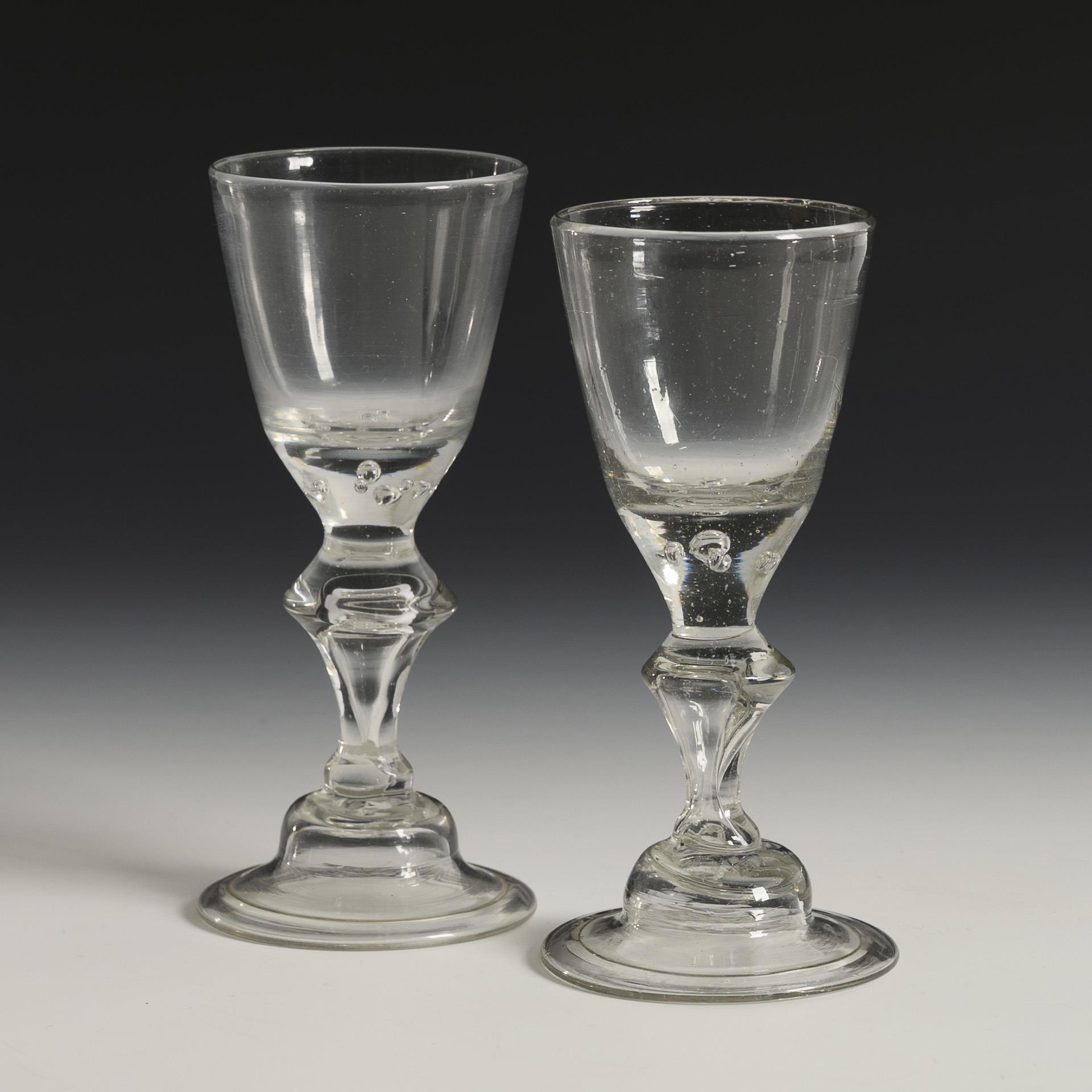 Conical bowl with seven pierced air bubbles in the base, baluster stem with pierced air bubble, hat foot with turned-down rim; pontil mark.