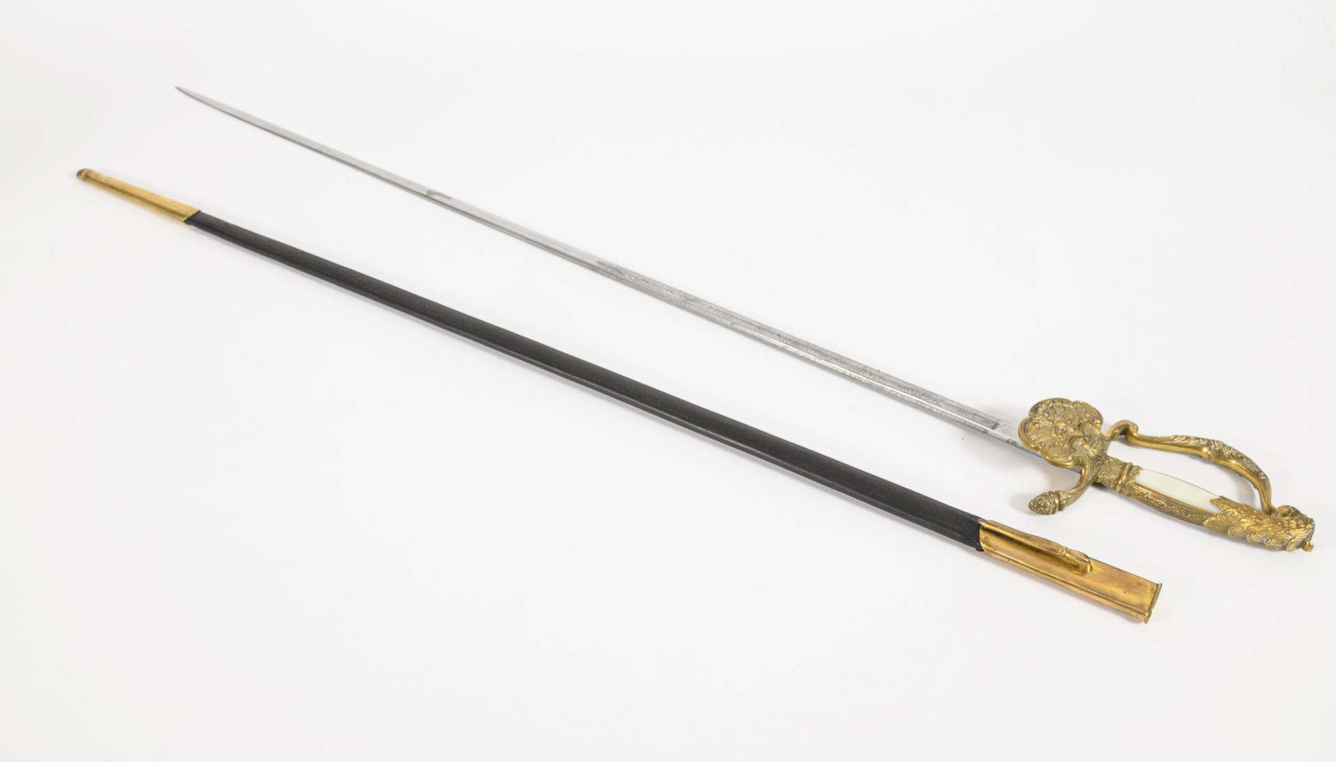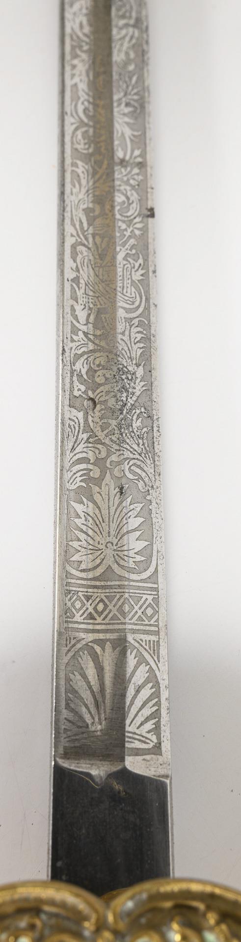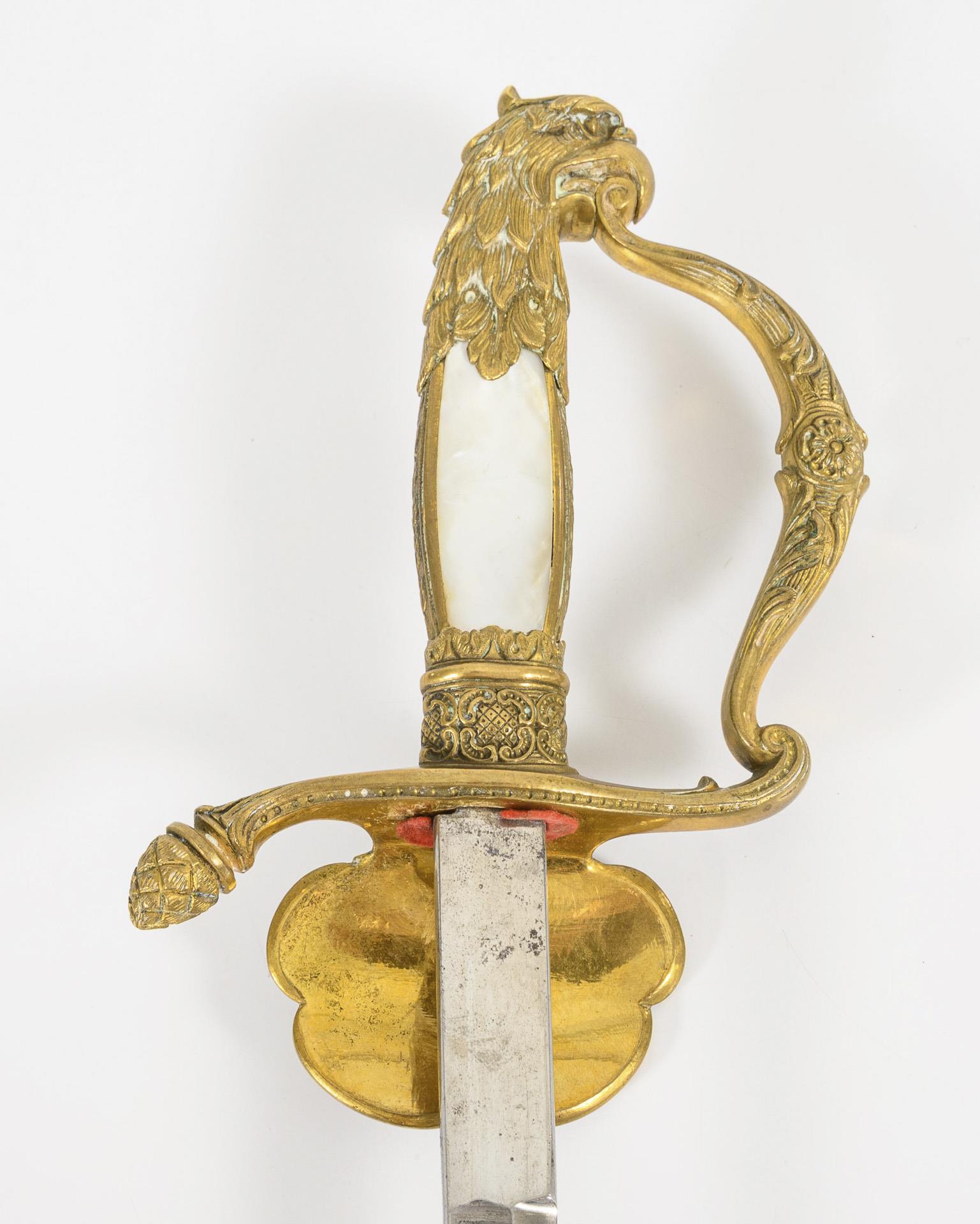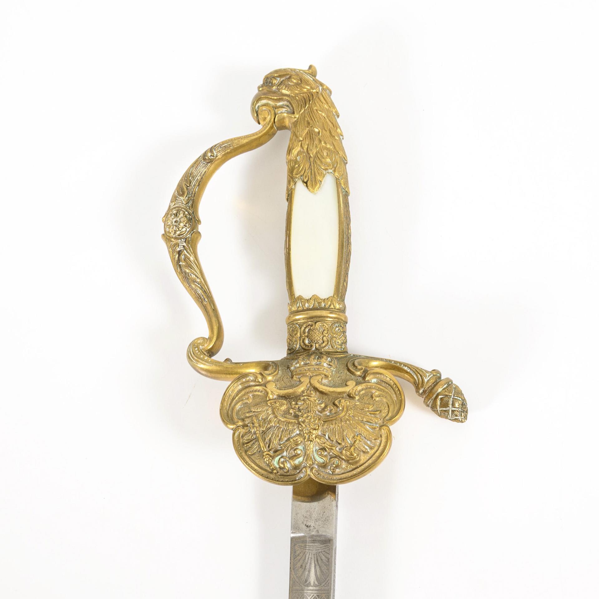 Hilt in rich relief with eagle's head as pommel, guard plate with imperial eagle under crown and mother-of-pearl grip scales, fullered blade with etched ornamentation on both sides. Black leather scabbard with brass locket and locket plate. Minimal signs of age/use.