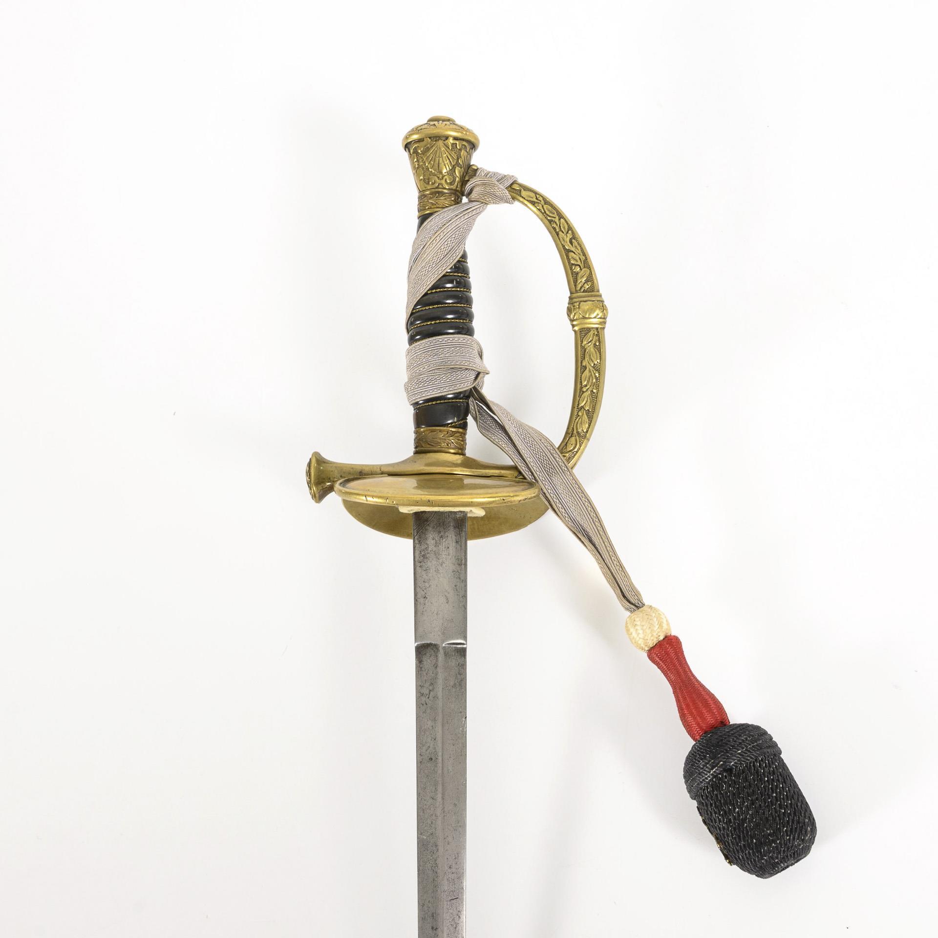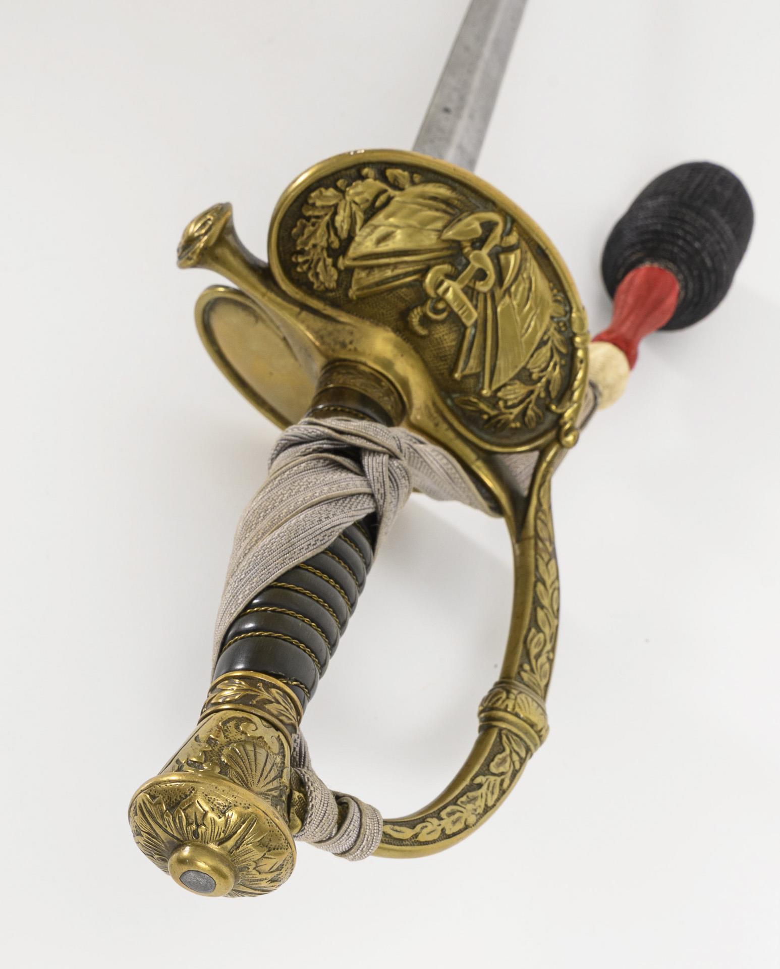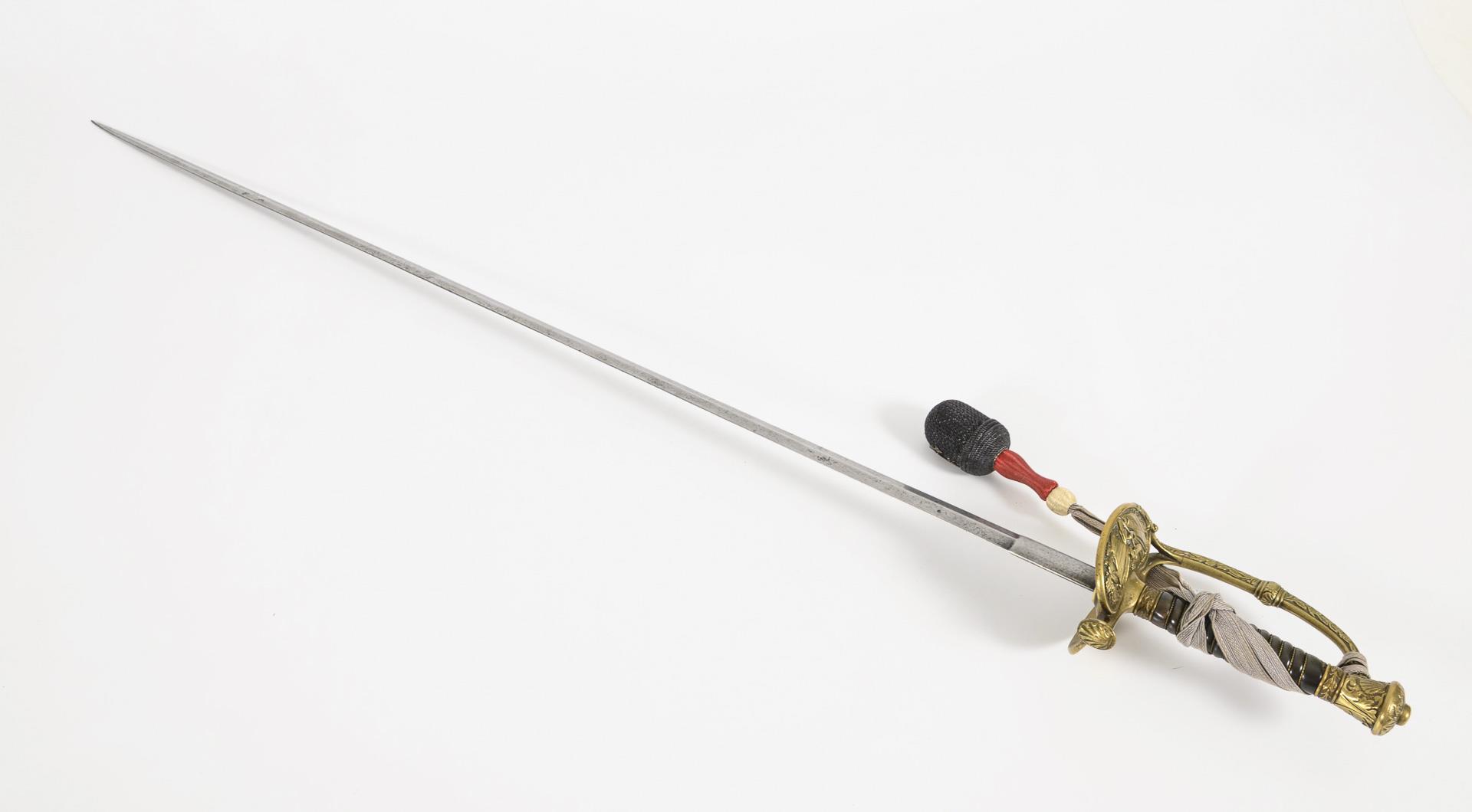 Brass knucklebow hilt in relief, the obverse side with anchor, flags and branches, the reverse side with a smooth folding guard which can be folded. Horn grip with wire winding, burr blade with ricasso. Guard with white edge, red shaft and black acorn with anchor. Minimal signs of age/use.