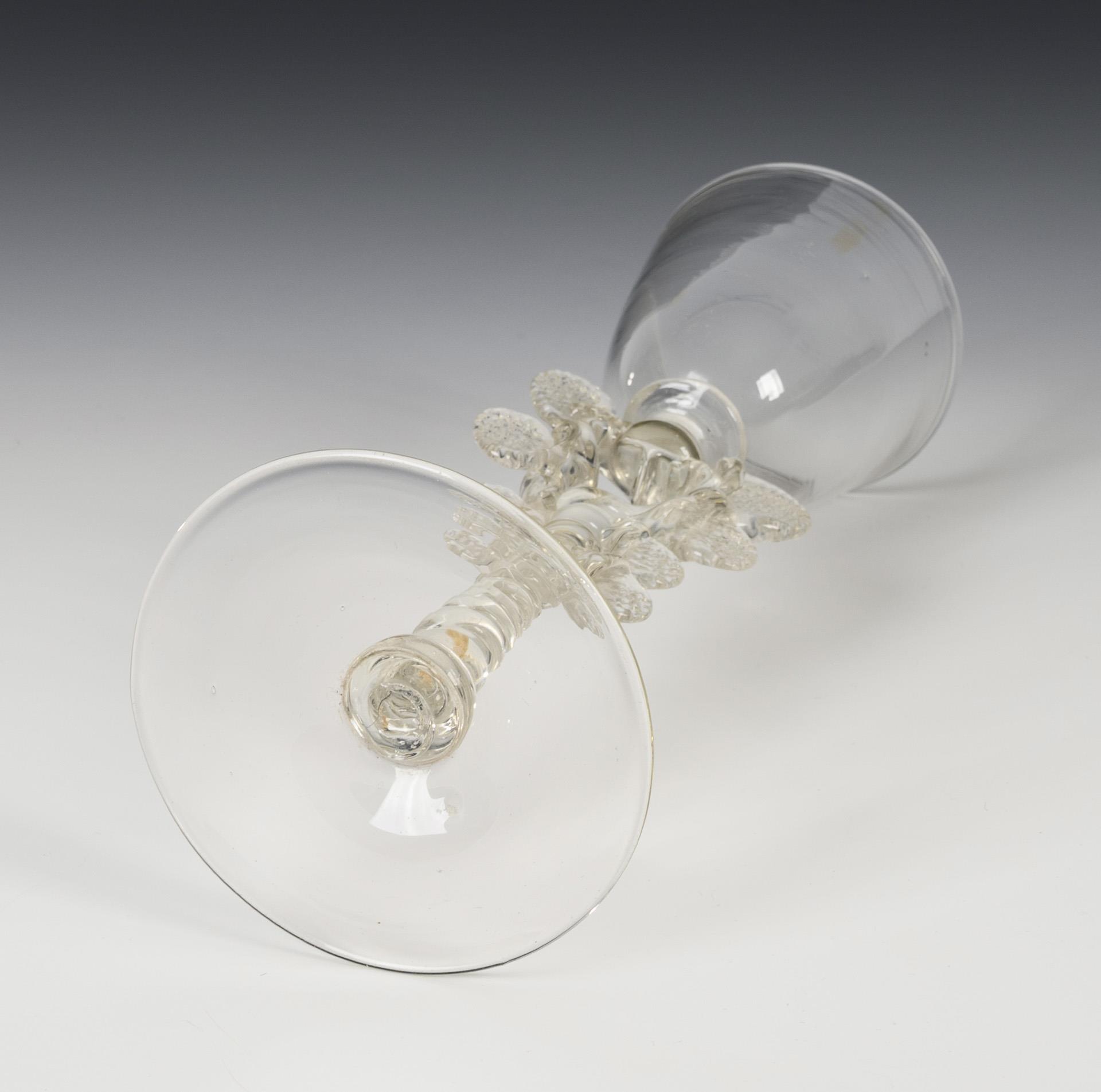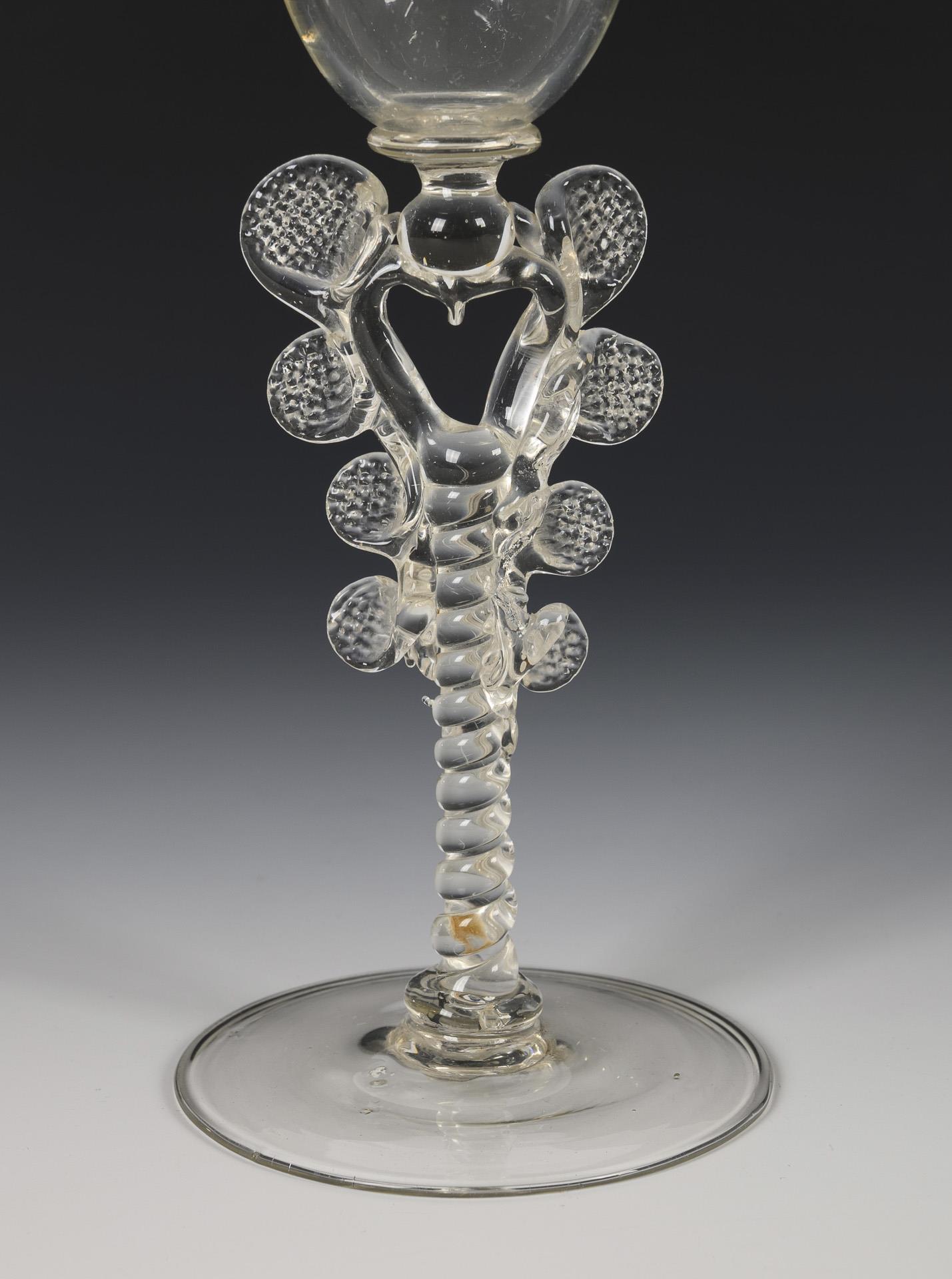 Bell-shaped goblet, spiral-twisted shaft with heart-shaped top and pinched wings, disk feet; pontil mark.