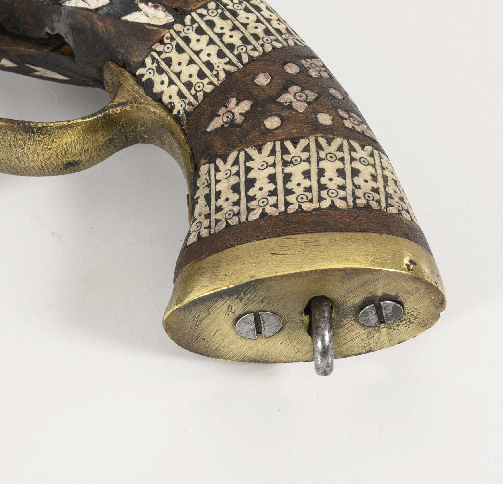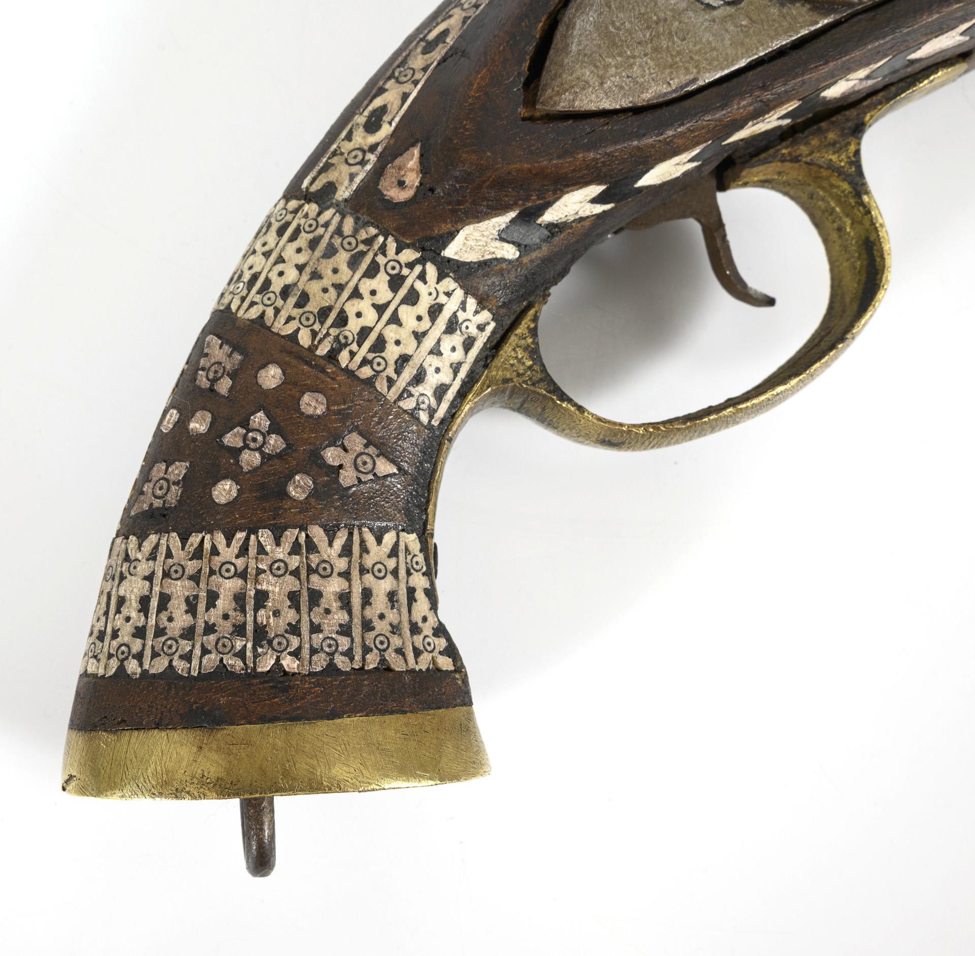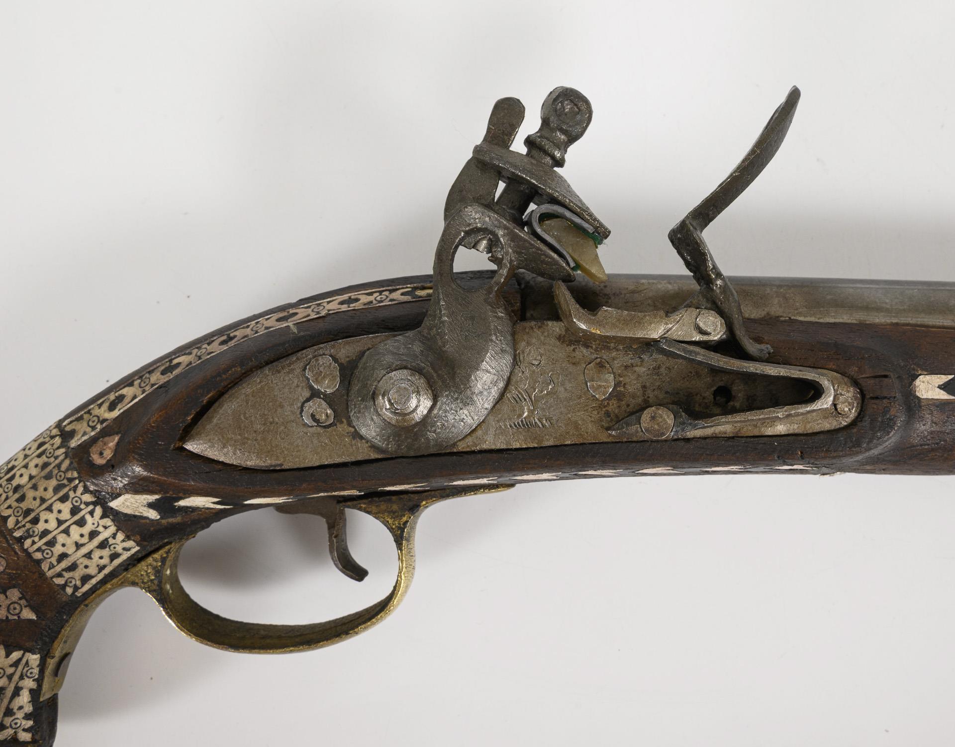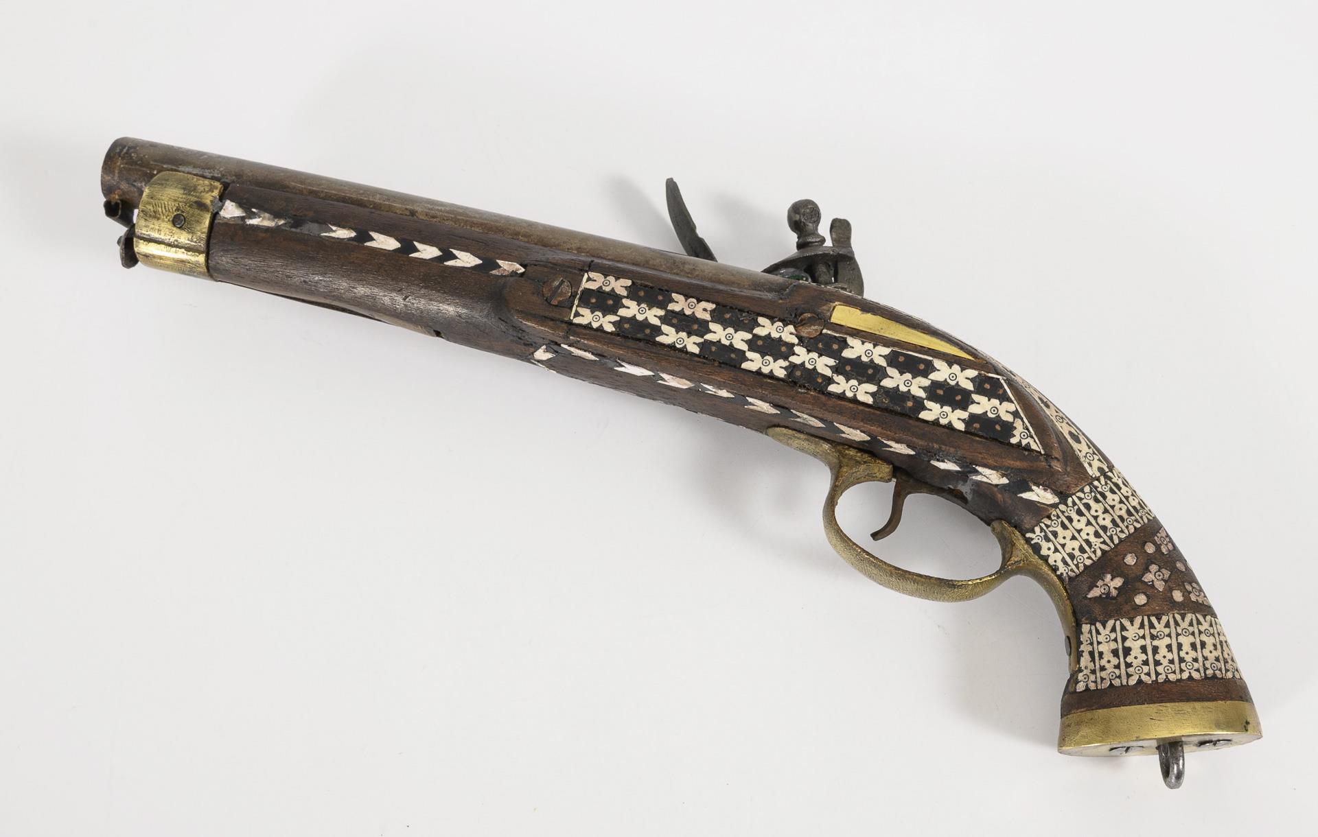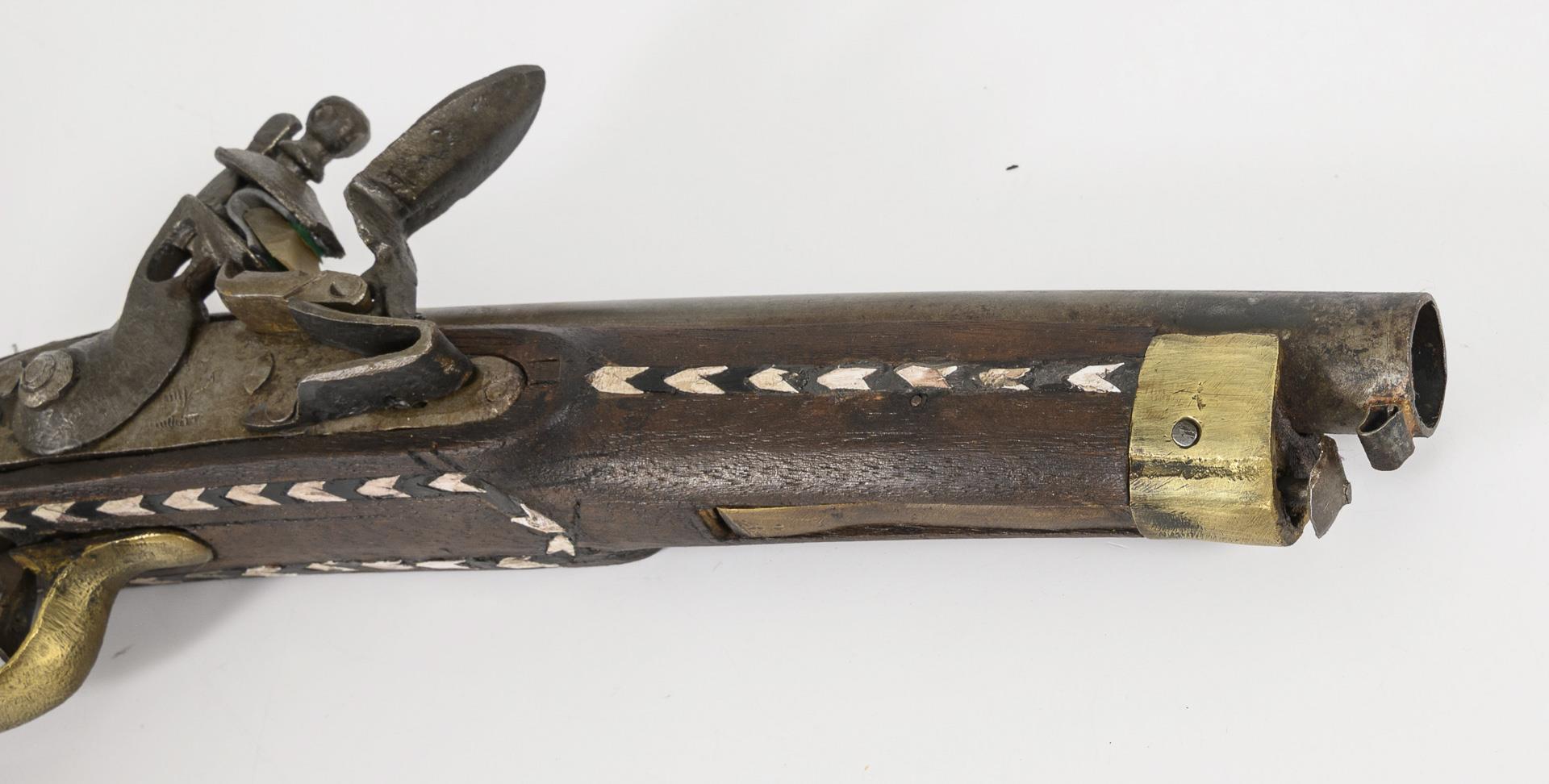 Probably a beautiful decorative piece with smooth bore and inlaid decorative stripes on the stock and butt.
