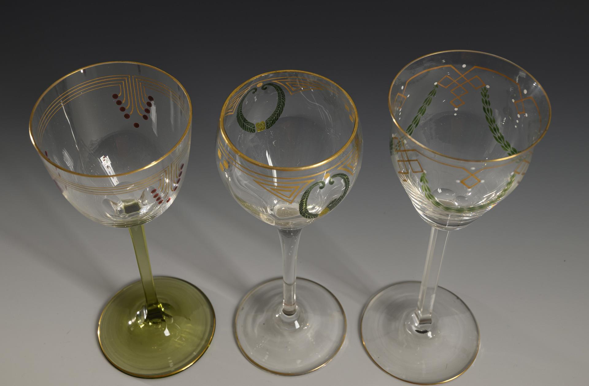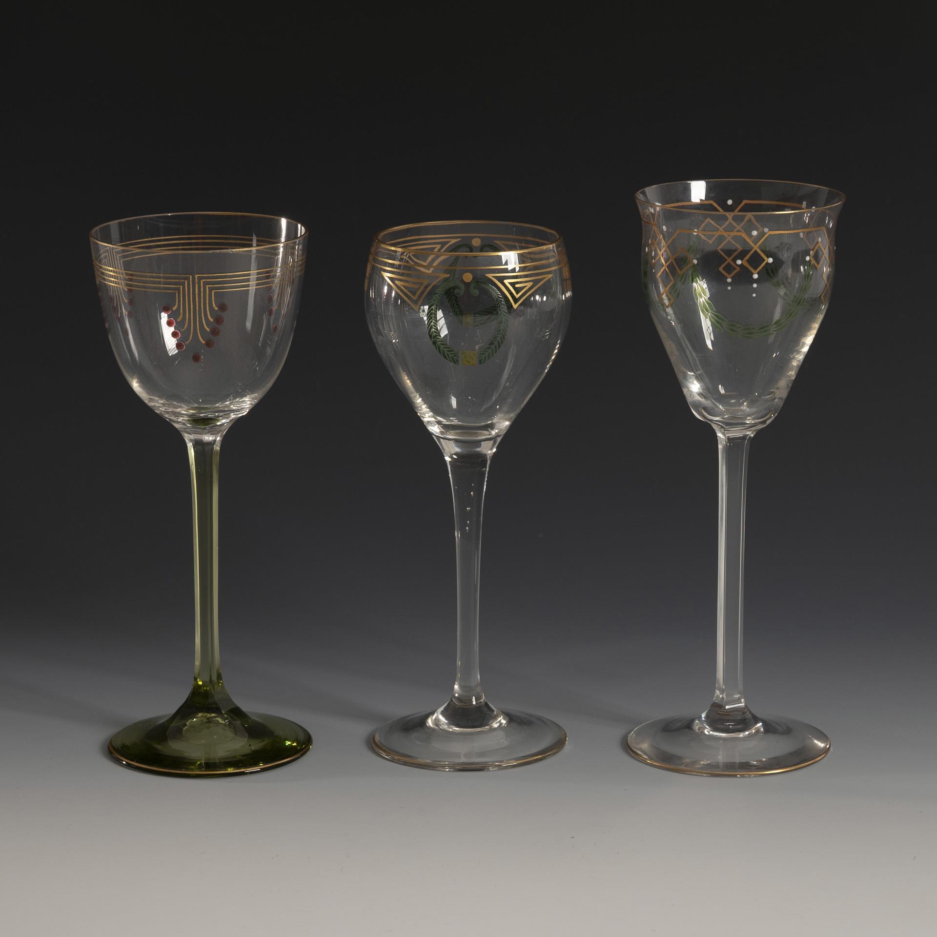 1x "Römer 1719": optically blown bell-shaped dome, square-cut stem, round base; gold line decoration and laurel garlands on the dome. / 1x lengthwise optically blown dome with gold line decoration and stylized wreaths, stem, round base / 1x semi-ovoid dome made of clear glass with gold line decoration and red dots, square-cut stem and round base made of olive green glass.