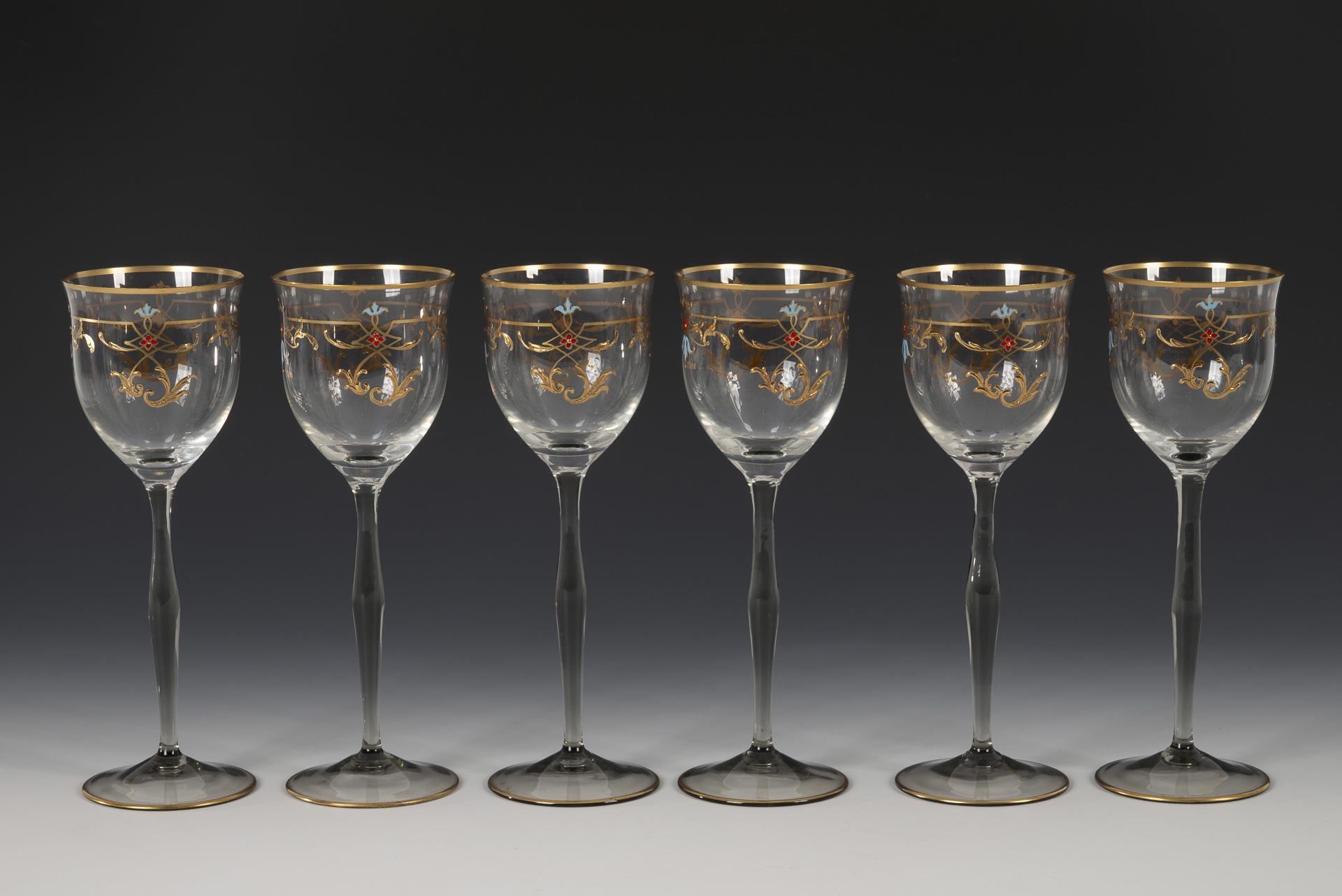 Bell-shaped cuppa made of clear glass, thickened stem in the middle and round base made of smoky glass. Delicate line and floral decoration in gold, gold in relief and turquoise and red enamel on the dome.
