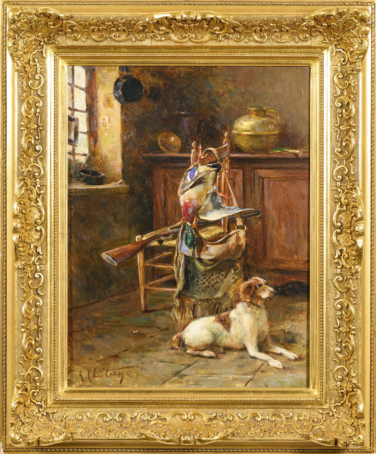 The hunting dog in the kitchen in front of the chair with the shot duck and the rifle. Minimal traces of age.