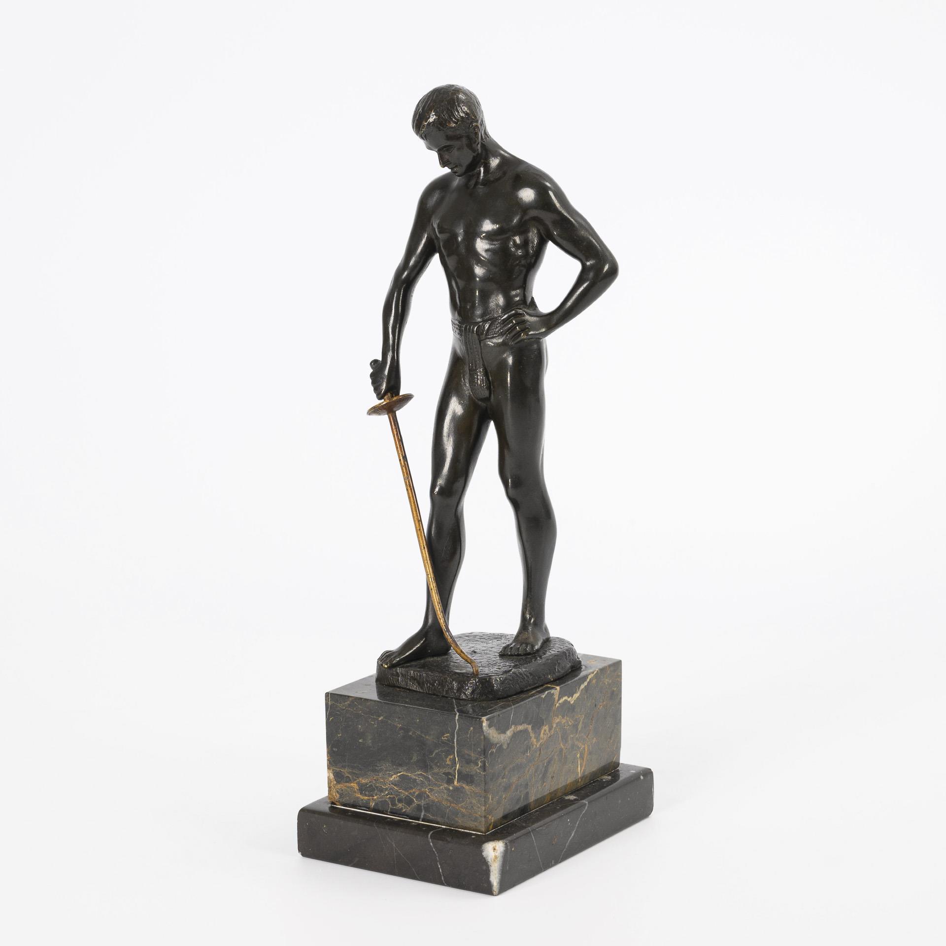 Standing athlete with sword placed on the ground; on the sword basket faintly legible "Reichspfennig. Deutsches Reich". Epee bent.