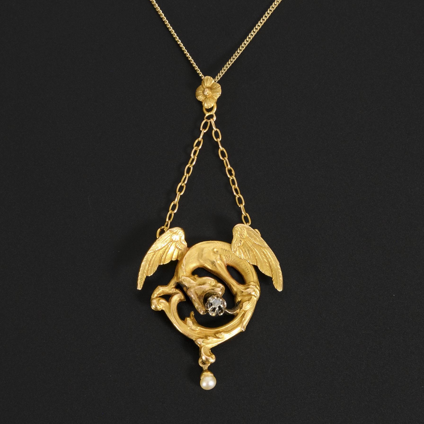 Older pendant with a dragon or mythical creature with wings in yellow gold, wearing a small diamond set in silver in its snout, with a pearl suspension. The pendant on a chain with ring spring clasp. Solder joint between gold and silver tarnished on the reverse, the chain probably added more recently.