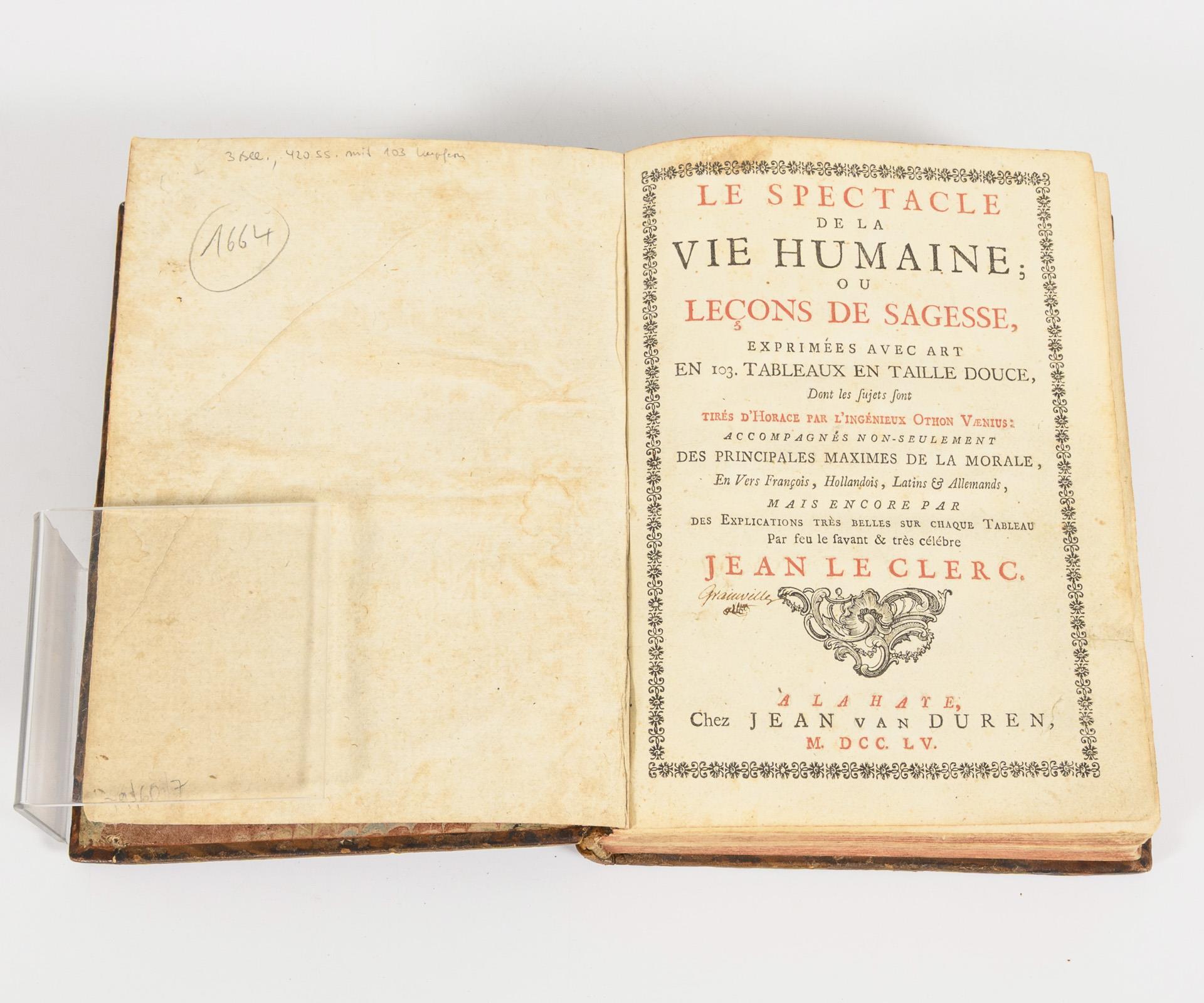 420 pages with many illustrations in copper engravings, in leather binding, with red edges. In French, Dutch, Latin and German. Some corners and edges glued on the first pages.