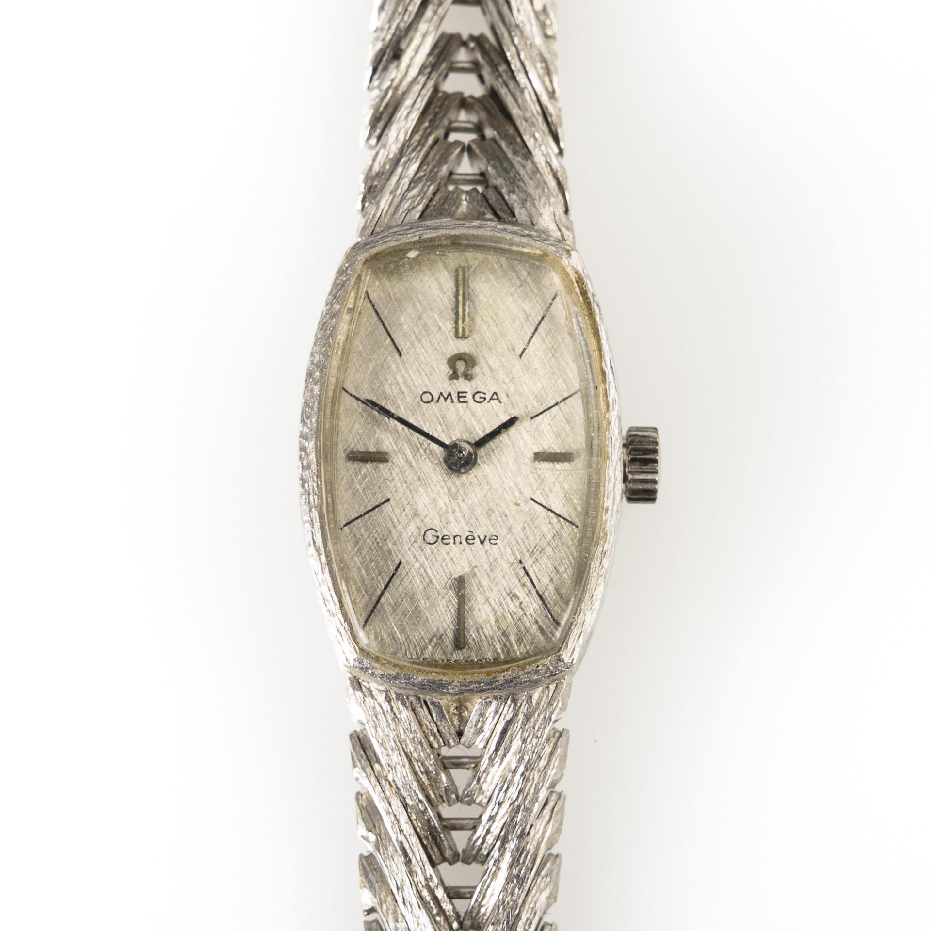 Marked spring movement with anchor escapement and 17 jewels, crown winding. Functional in short-term test. Brushed white gold dial, hour indices, baton hands, marked "Omega Genève".
