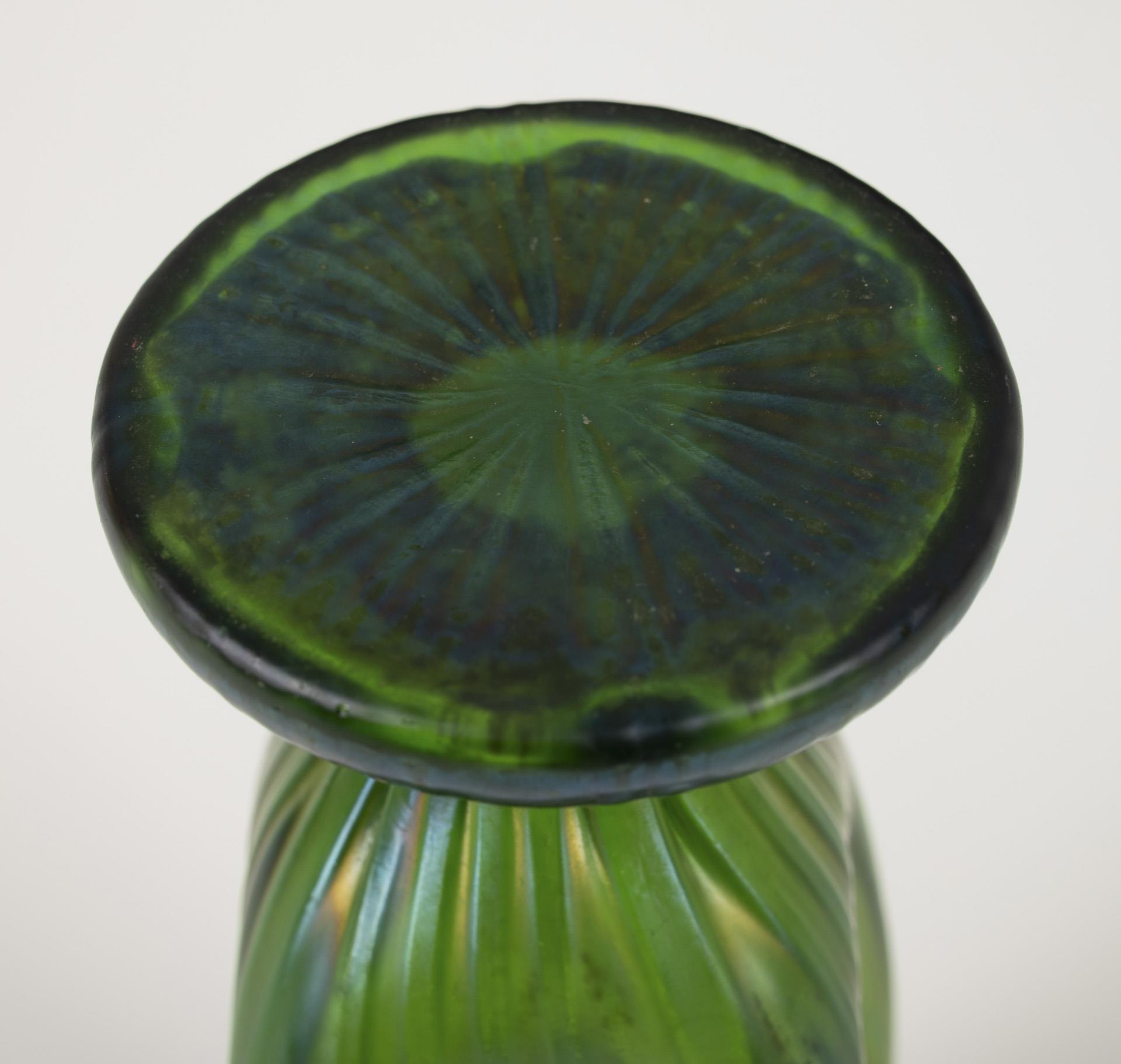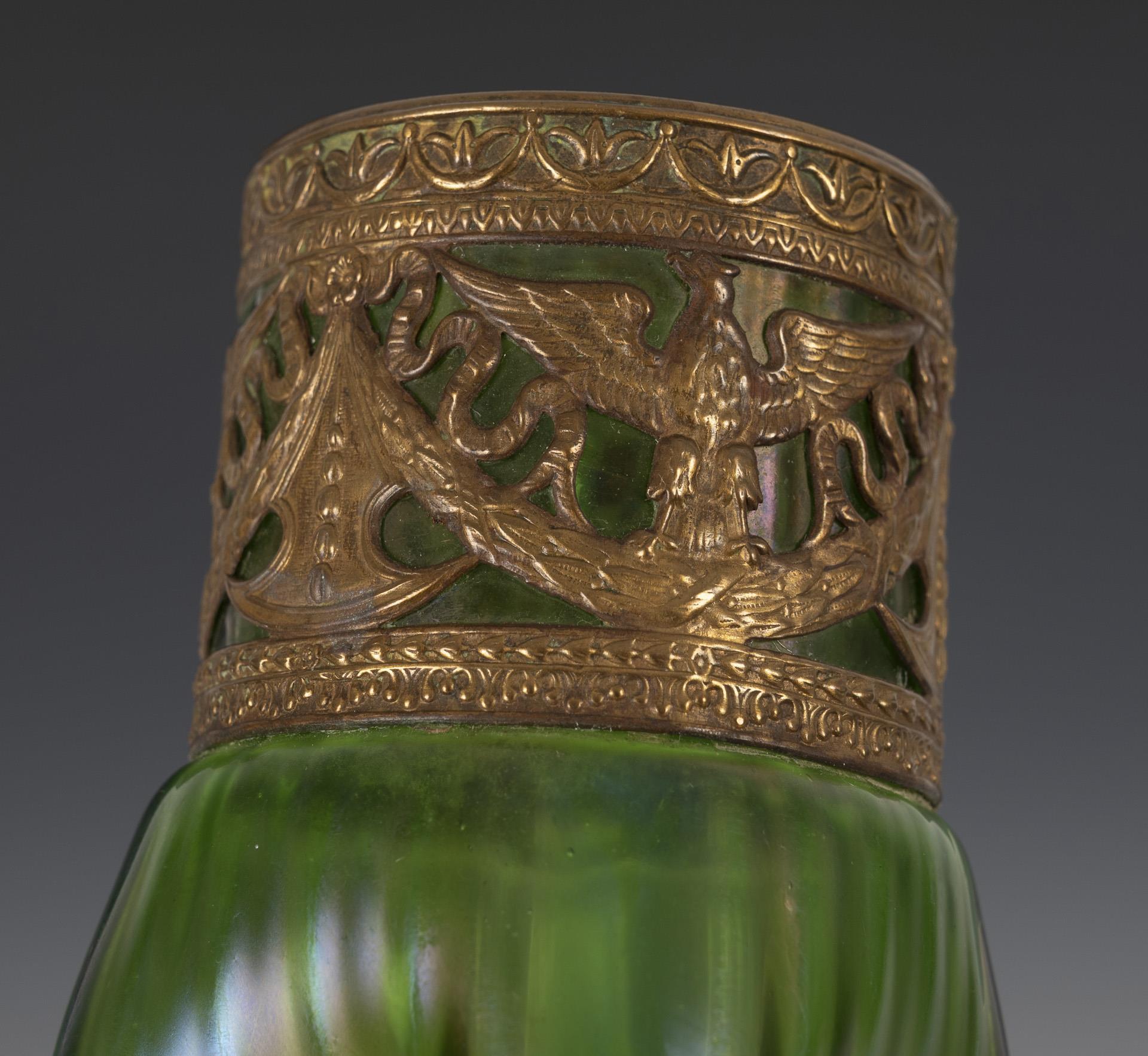 Green glass, iridescent; brass. H 15.5 cm.