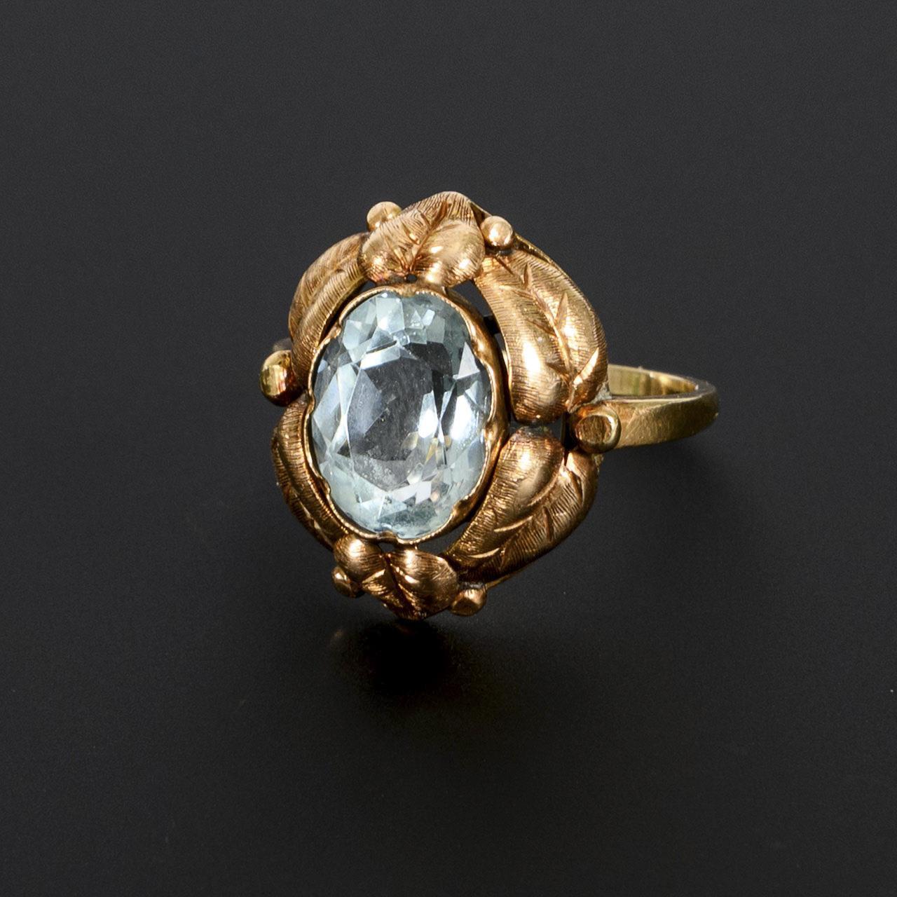Older ring with shank in yellow gold and ring head in rose gold, the latter designed as a three-dimensional wreath of leaves surrounding an oval, light blue colored stone (possibly an aquamarine). On the underside with a trace of an earlier ring rail reduction, slight traces of wear due to age on the cut edges of the stone, as well as a minimal chip due to the shape of the setting, hardly visible to the naked eye.