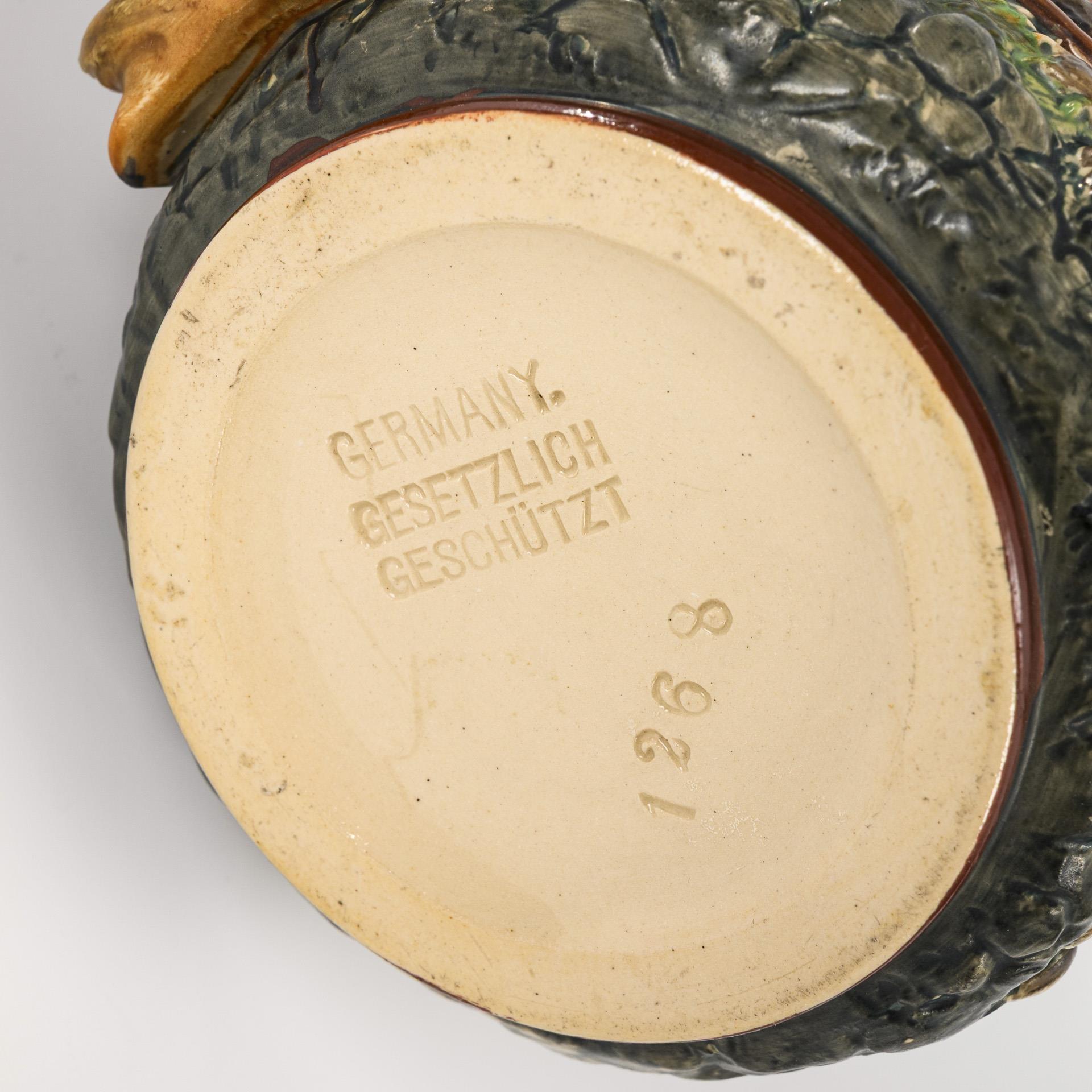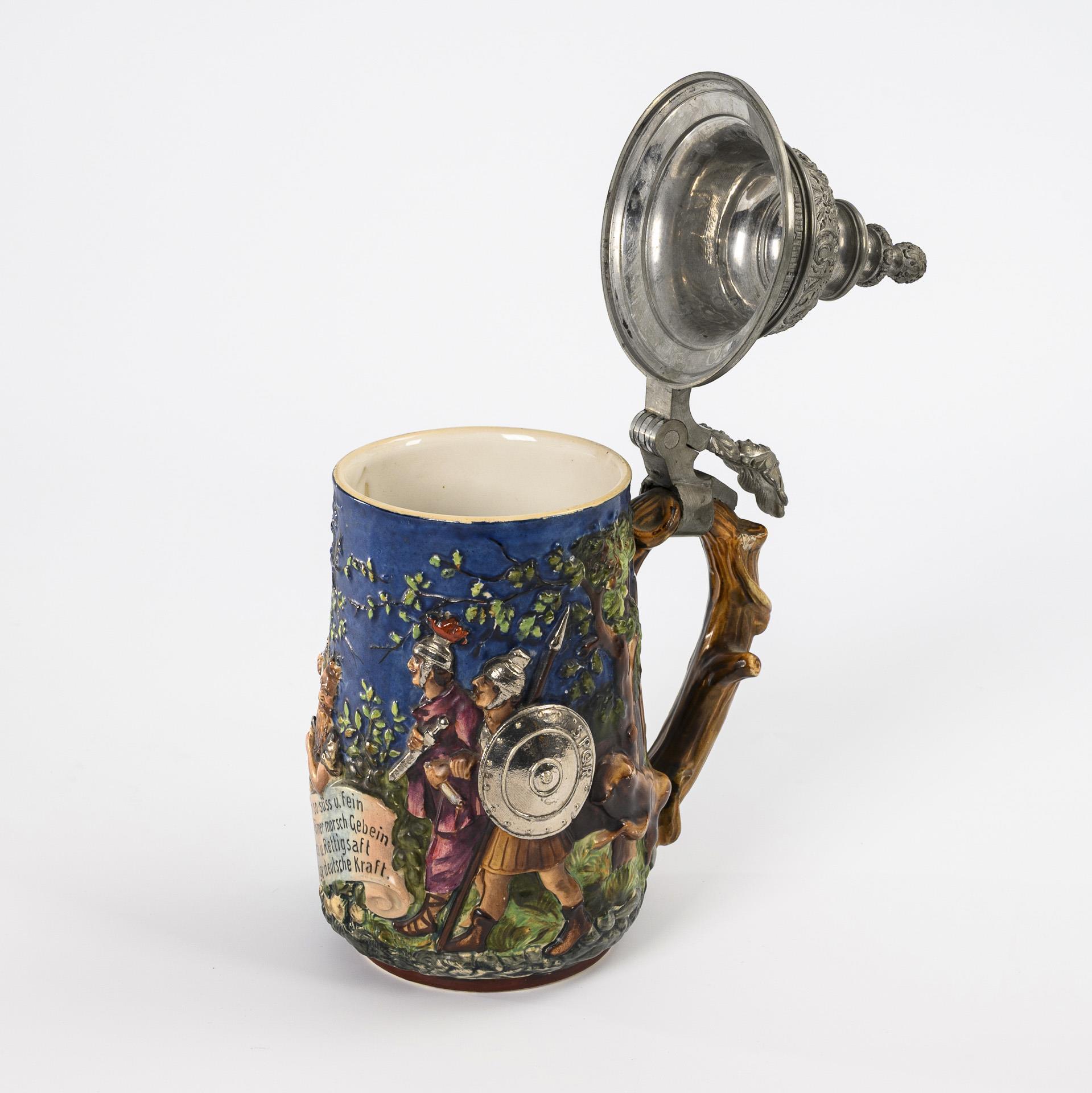 Jug with rich relief and painted decoration with Germanic people drinking and Roman soldiers as well as a motto. Pewter lid in relief with a bust of a woman as a pusher, on the rim a dedication from the "4. Korp. I/120" with the name "Seyerle".