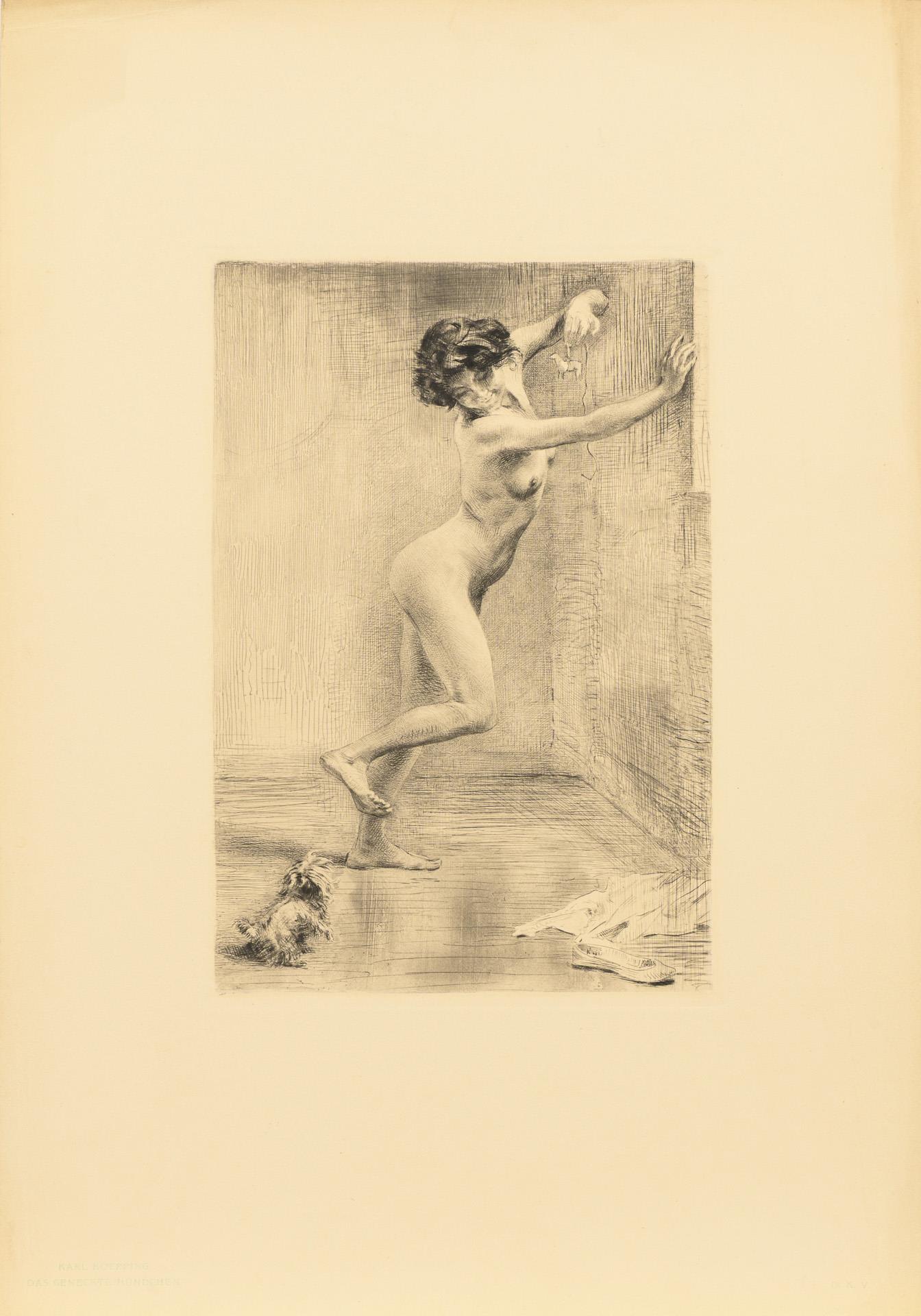 Table of contents with 4 sheets of 14 in total: Fritsch Klimsch "Zeichnende Kunst", embossing; Karl Koepping "Das geneckte Hündchen", etching; Max Klinger "Weiblicher Akt", mezzotint; Reinhold Lepsius "Stefan George", woodcut.