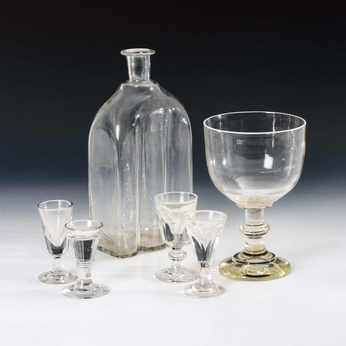 Vierkantflasche (H 29 cm), Berliner-Weiße-Glas mit aufgeschmolzenem, zinnweißem Emailrand (H 21 cm) und 4 verschiedene Schnapsgläser (H 9,5-11,5 cm).