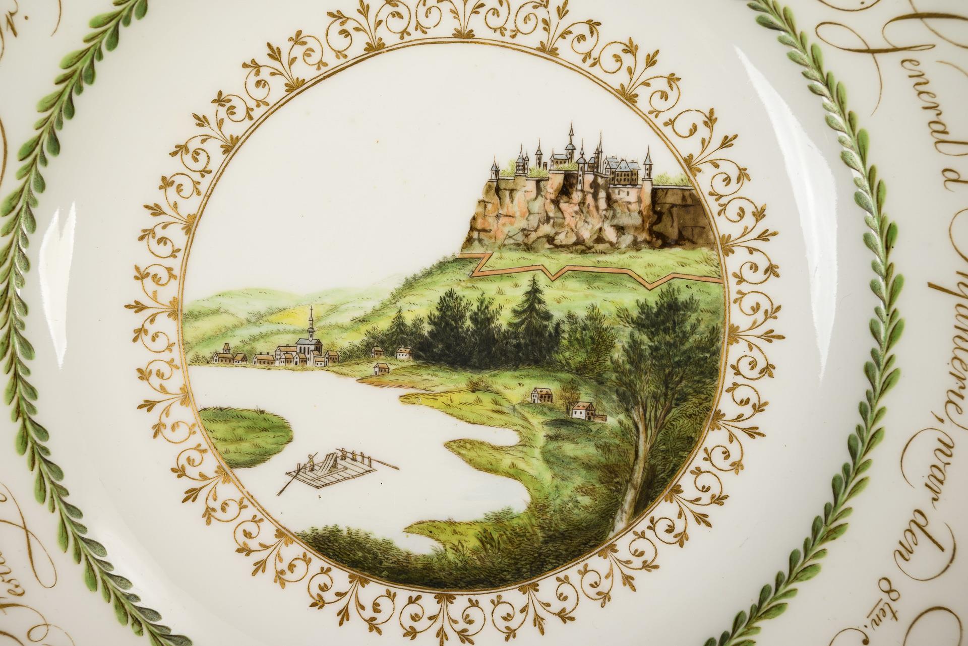 Shape "New cut-out". In the mirror a medallion with a view of Königstein Fortress, on the banner the inscription "Heinrich Adolph von Boblick. General d'Infanterie, was 90 years old on February 8, 1809, and was the old commander of this fortress. Command. of this fortress". 1 edge chipped.