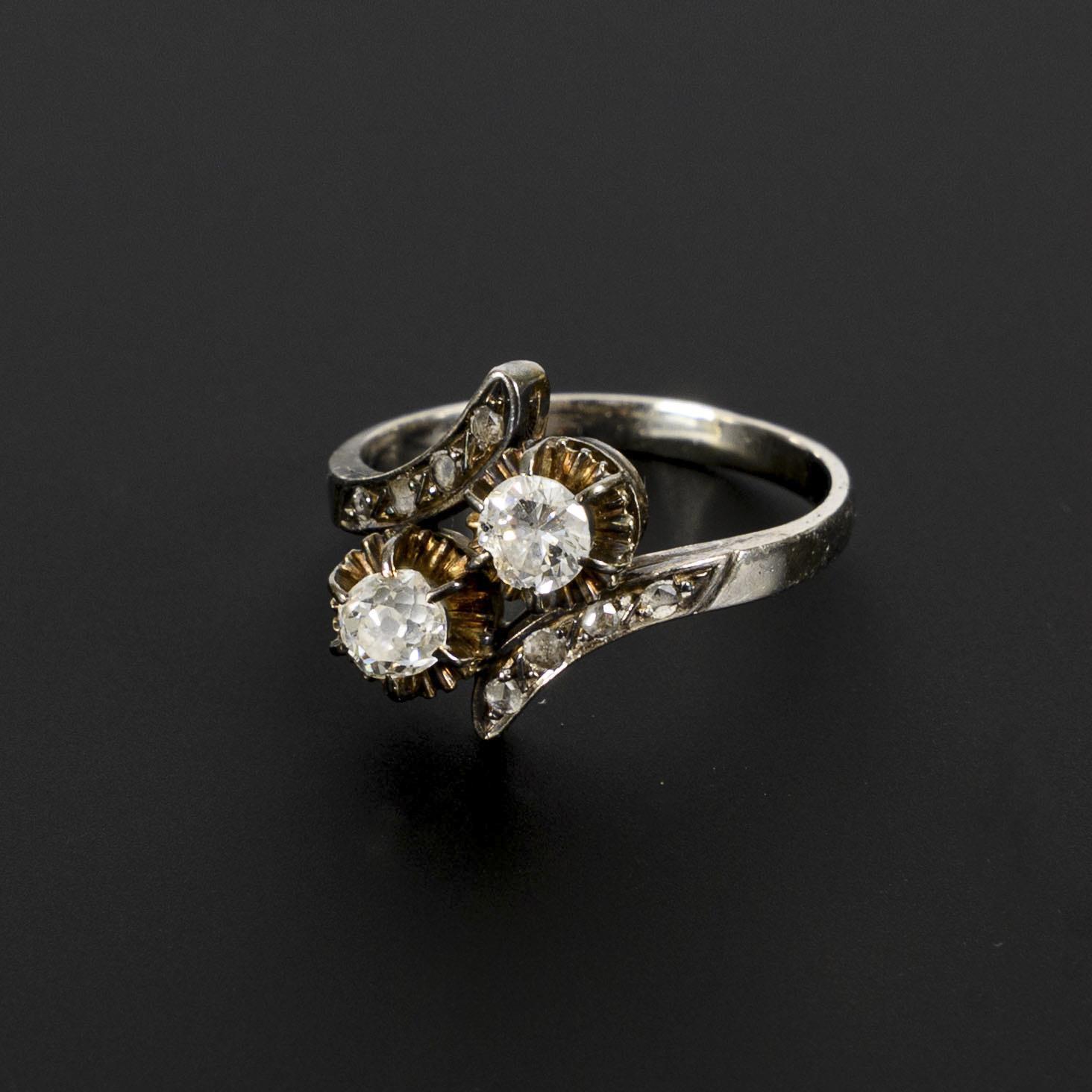 Historic ring with 2 brilliant-cut diamonds: one in modern brilliant cut, the other in old cut. On each of the ring shoulders 4 further small diamonds. Brilliant-cut diamonds of slightly irregular shape, the modern brilliant-cut diamond, probably a renewed replacement for an old-cut diamond, with chip on the edge (approx. 0.97 mm) and chip in the table not visible to the naked eye; the stone holds securely in the setting.