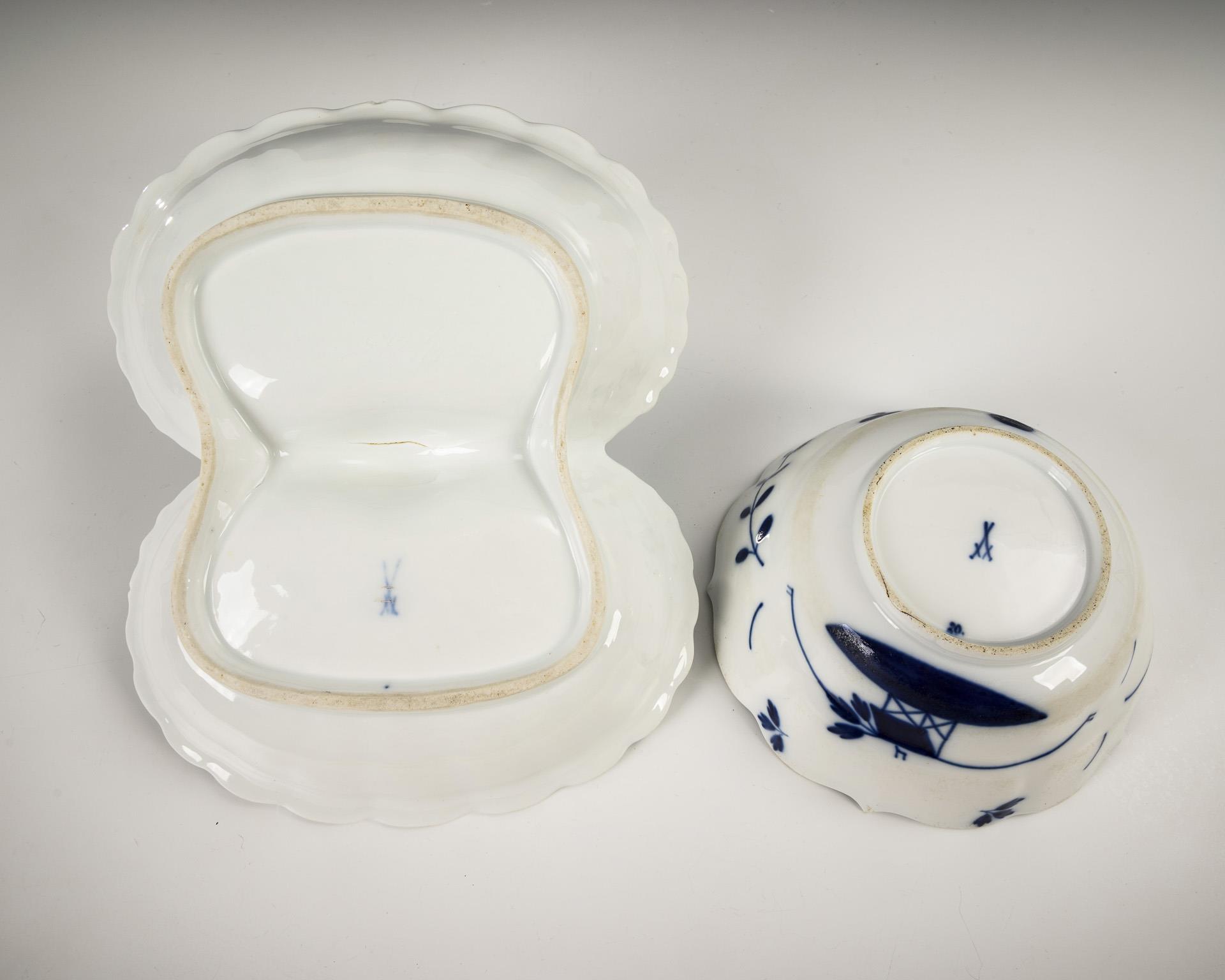 1x cabaret with two shells and central handle / 1x bowl in the shape "Neuer Ausschnitt". Cabaret with 2 rim chips and fire crack on the underside, bowl with 1 rim chip and traces of use.