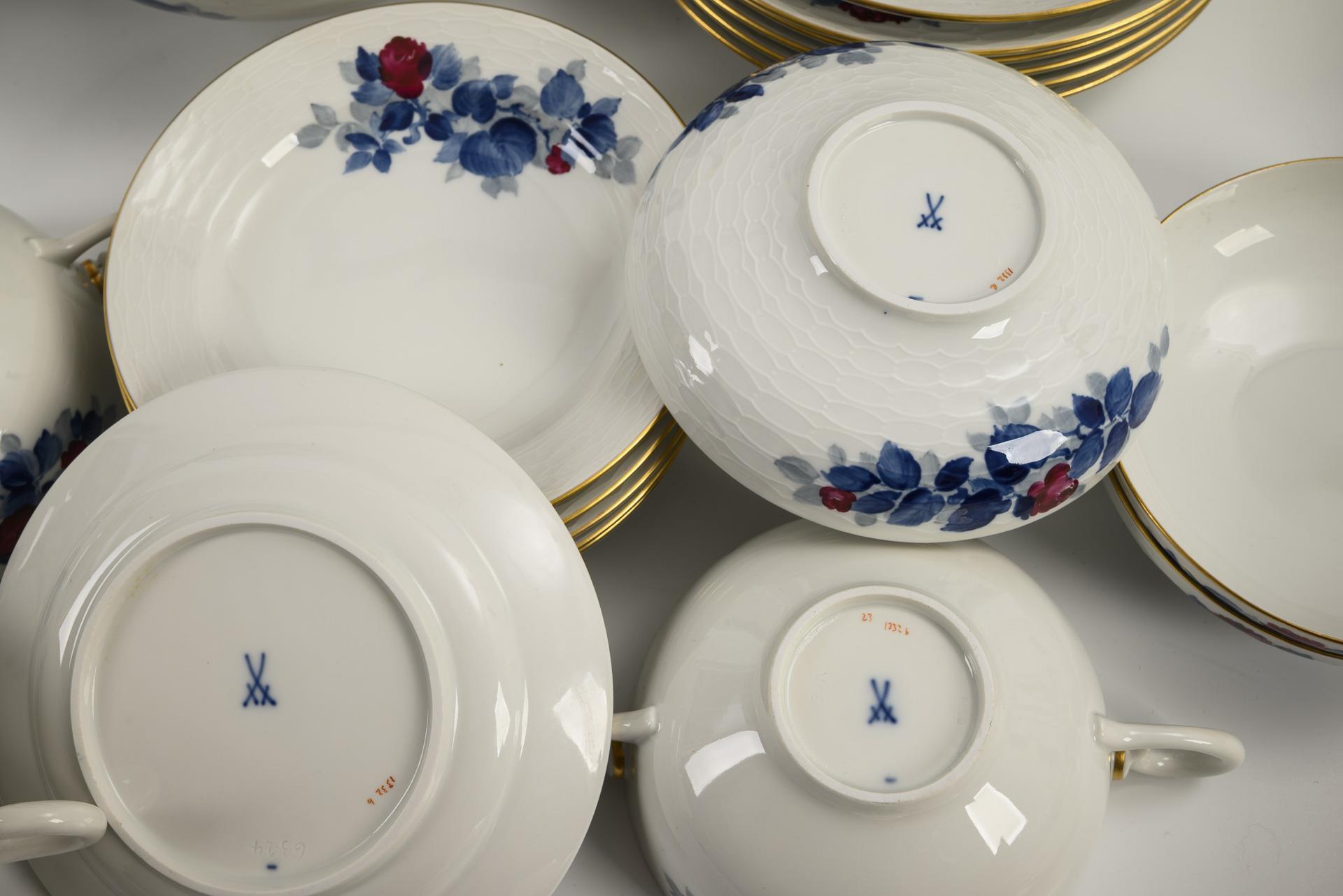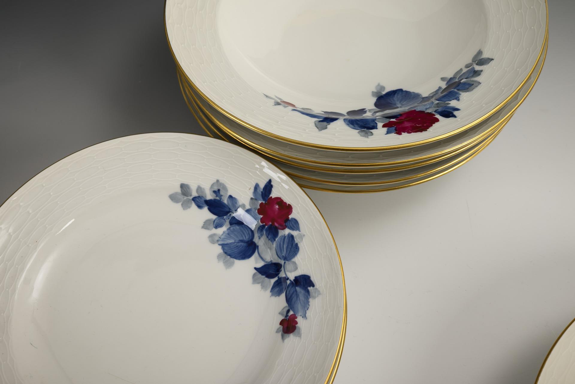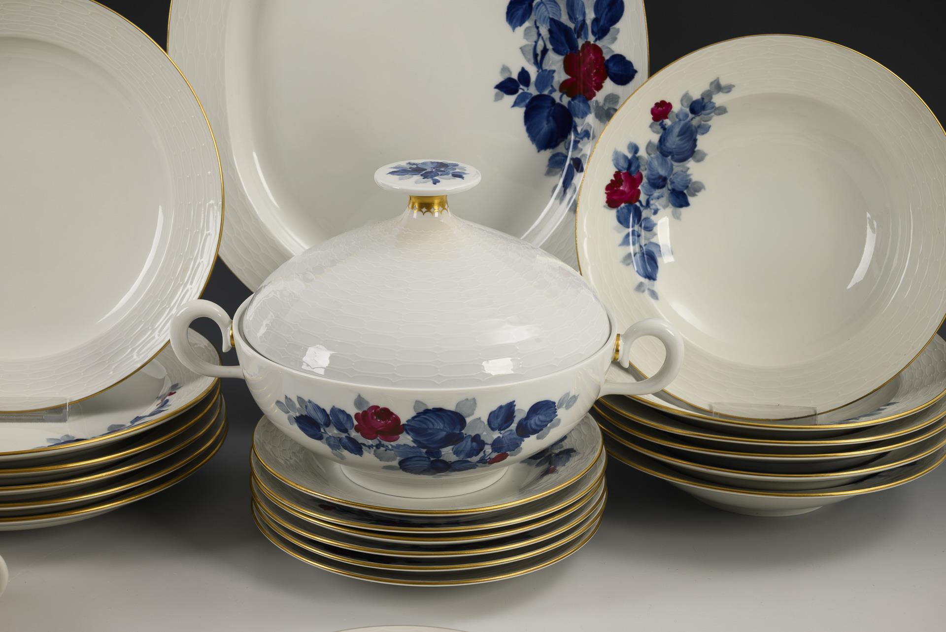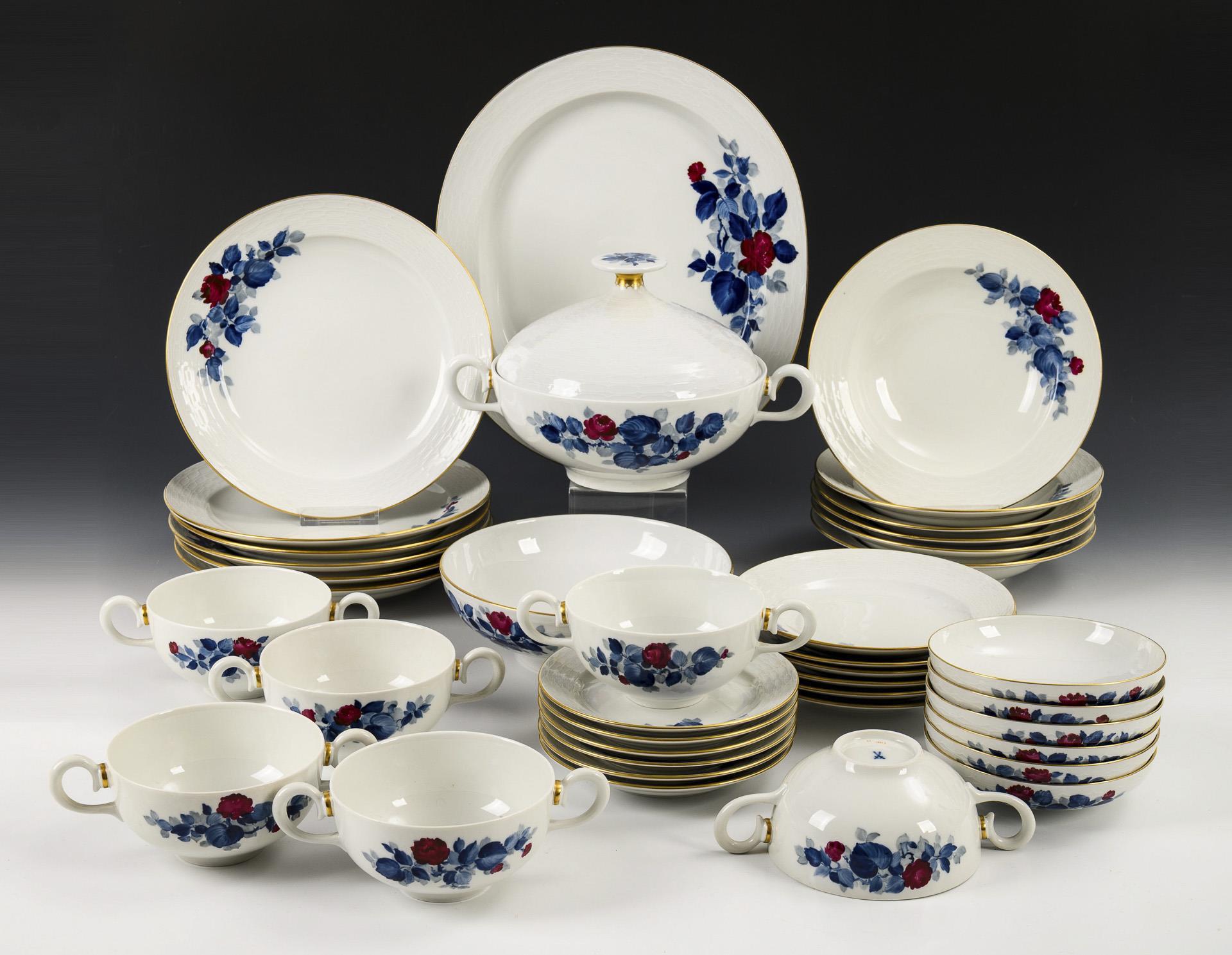 39 pieces. "Service with lattice relief" shape. 6 soup plates, 6 dinner plates, 6 bread plates, 6 soup bowls, 6 side plates, 6 dessert bowls, 1 tureen (H 17 cm), 1 bowl (Ø 21 cm) and 1 oval plate (L 34.5 cm).