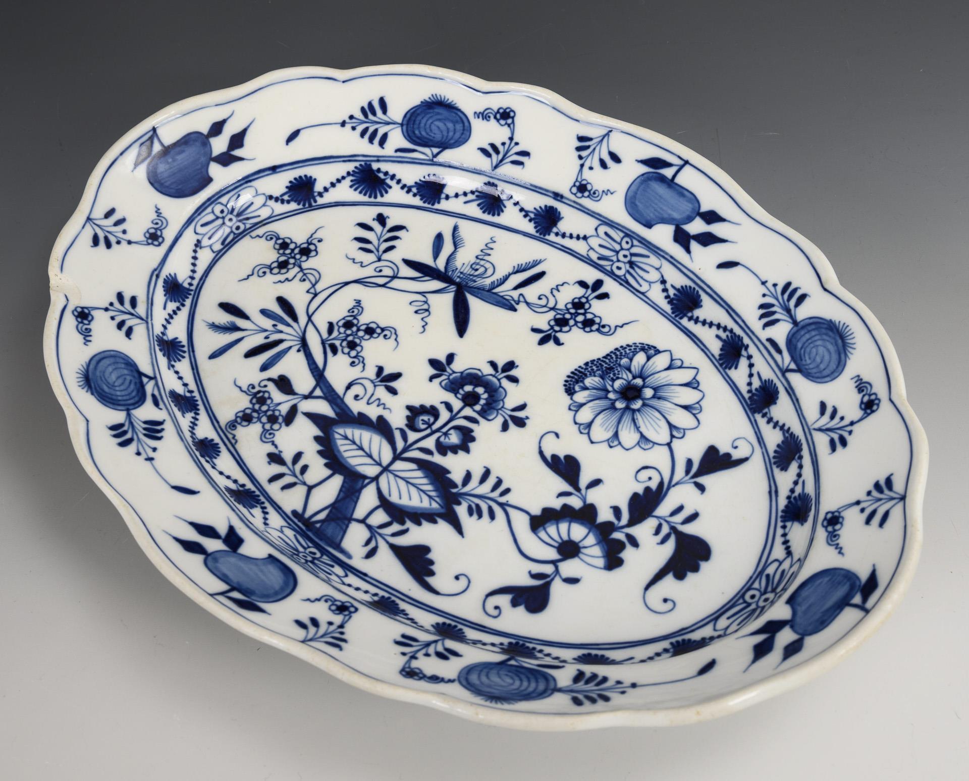 "New cut-out" shape. 4 dinner plates, 1 soup plate, 1 bowl (H 9.5 cm), 2 oval plates (L 33.5 cm), 1 cake plate (Ø 36.5 cm), 1 small tureen (L 27 cm), 1 sauce boat (L 25.5 cm) and 1 fish plate (L 54.5 cm). In addition, 1 tureen with restored handles. Chip to 1 oval plate, 2 fire cracks in the stand ring of the fish plate.
